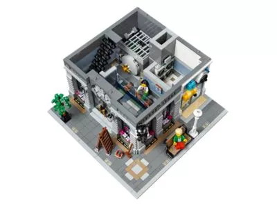 Geh durch den Rundbogeneingang in der skulpturalen Fassade, um das elegant geflieste, repräsentative Foyer zu betreten. Durch das große Fenster im oxidierten Kupferdach fällt reichlich Tageslicht in das Foyer und lässt den kunstvoll verzierten Kronleuchter ganz oben im Atrium erstrahlen. Zahle bei der freundlichen Bankschalterkraft Geld ein und deponiere das Geld im sicheren Tresorraum der Bank. Geh dann die Treppe hinauf in den ersten Stock, um bei einem köstlichen Espresso im Büro des Filialleiters deine finanzielle Situation zu besprechen und das vornehme Ambiente zu genießen, während in dem Waschsalon nebenan die Kunden ihre Wäsche in die Selbstbedienungswaschmaschine stopfen. Herzlich willkommen in diesem prächtigen Gebäude, das eines der etabliertesten und angesehensten Finanzinstitute beherbergt. Allerdings besitzt der Tresorraum eine potenzielle Schwäche, die irgendjemand auch schon entdeckt hat. Dieses allerneueste Set aus der LEGO Serie „Bauen mit Modulen“ enthält eine Fülle beispielloser Details und versteckter Überraschungen!