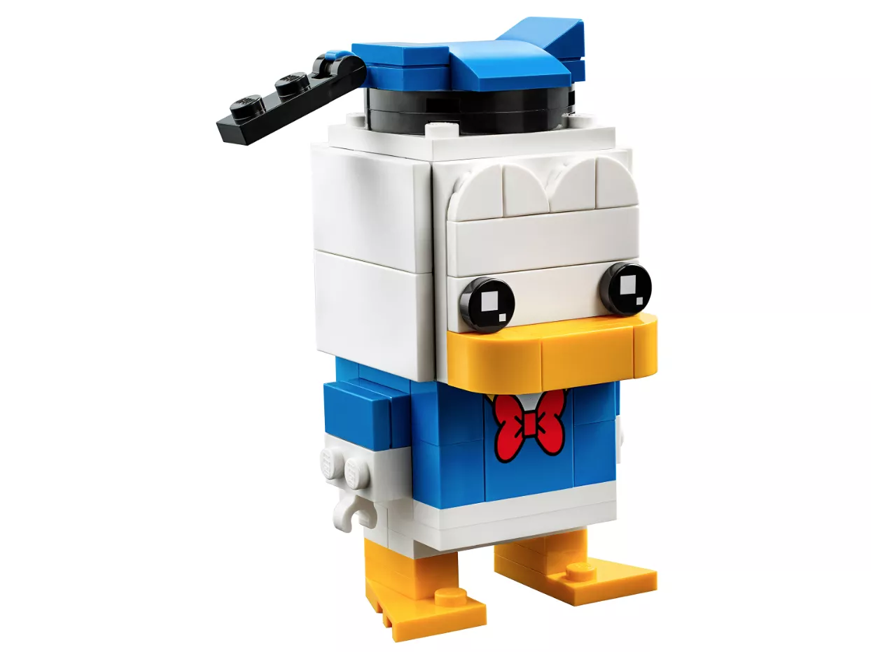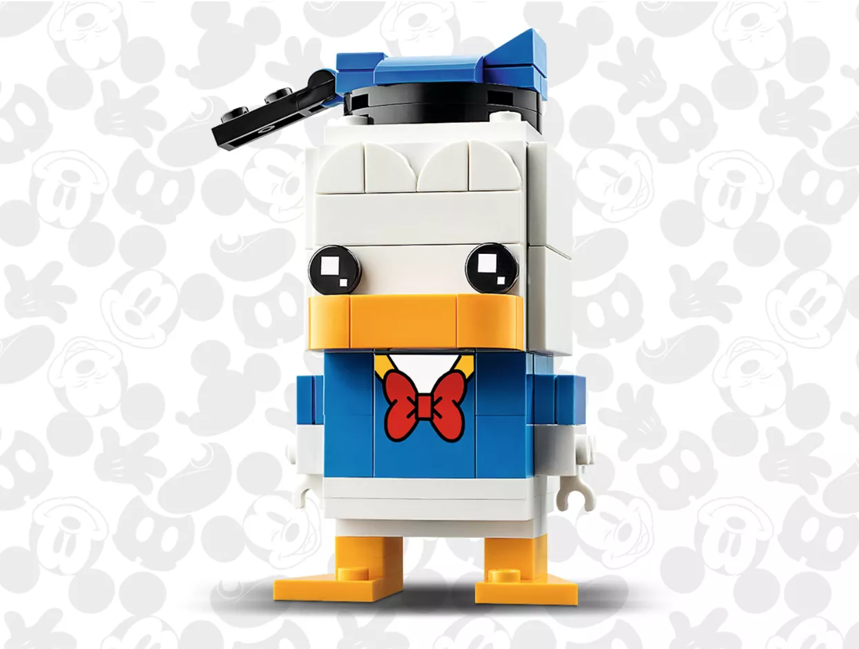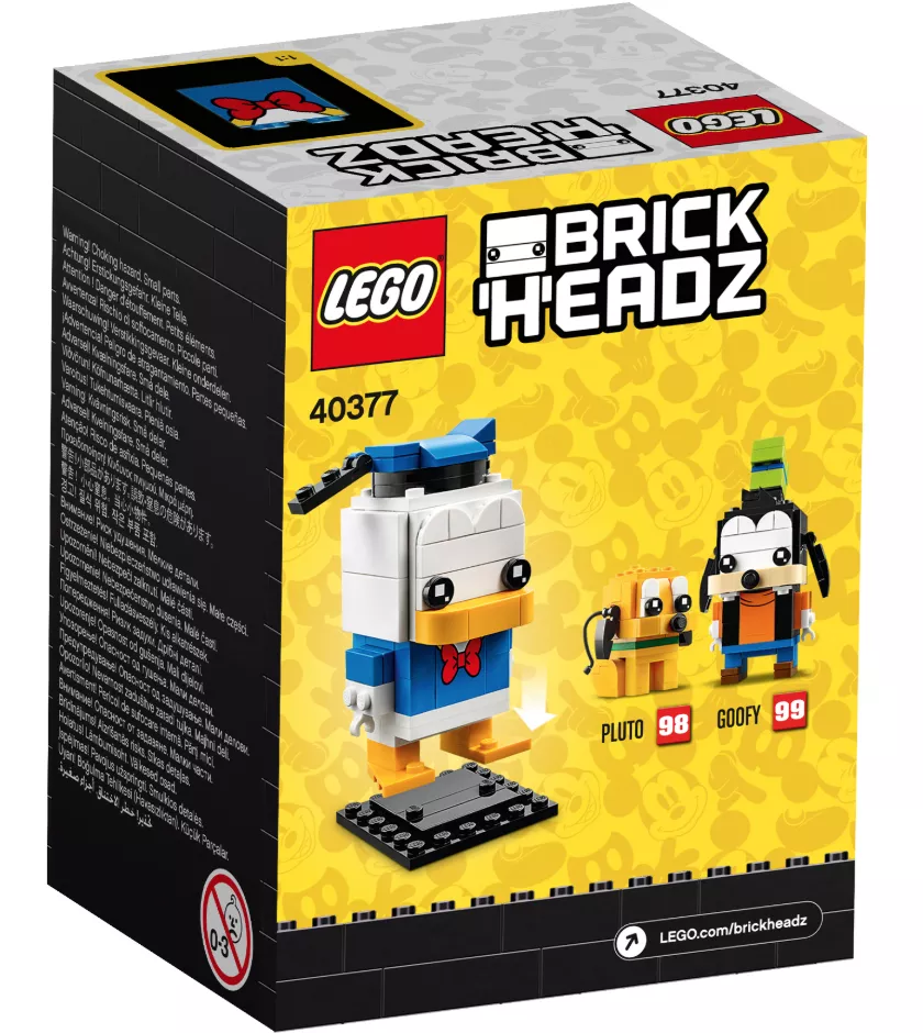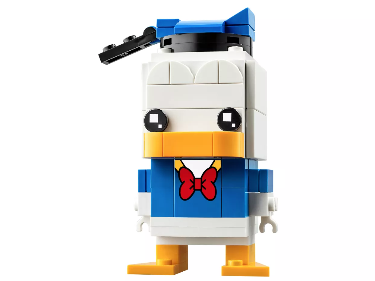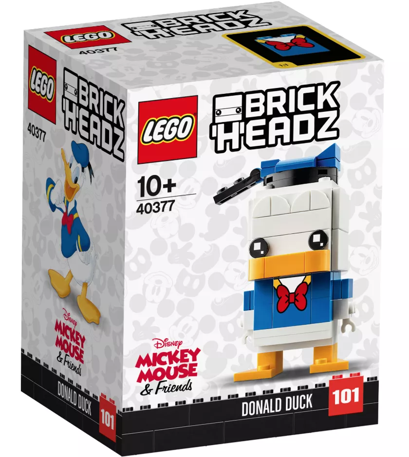 Эта модель Дональда Дака (40377) понравится поклонникам наборов LEGO BrickHeadz и персонажей мультфильмов Disney. Взгляните на забавную матроску, шапочку и галстук Дональда и на его оранжевый клюв и лапы. В набор для сборки этого очаровательного гуся также входит надёжная демонстрационная подставка, на которую его можно установить вместе с другими классическими моделями BrickHeadz. Коллекционеры моделей LEGO BrickHeadz смогут немного повеселиться, объединяя различные элементы моделей и создавая собственных невероятных персонажей.