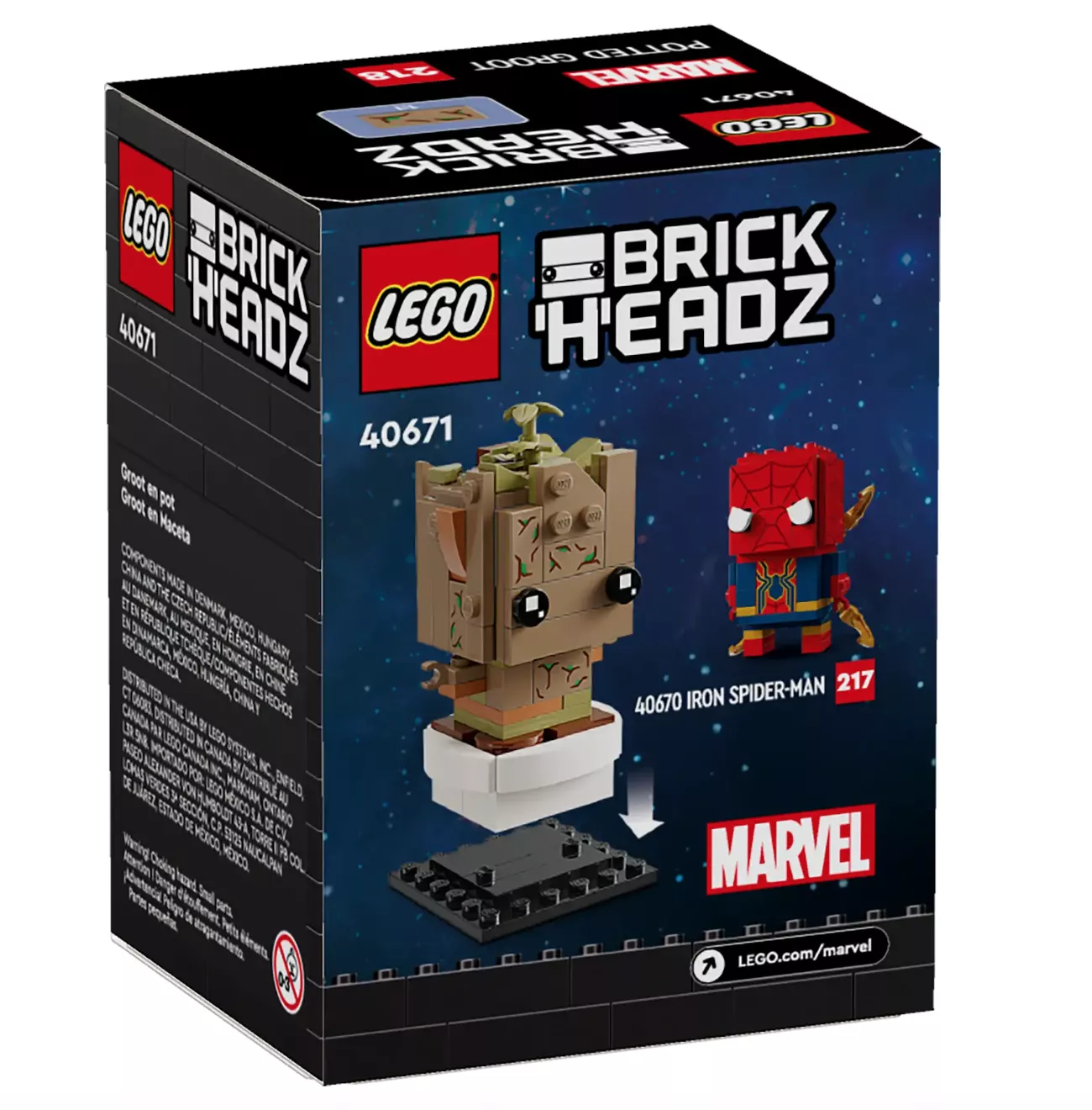 LEGO BrickHeadz 40671 Грут в горшке – это очаровательный набор, который позволит вам собрать одного из самых милых и любимых персонажей вселенной Marvel. Грут в своем знаменитом горшке – это забавный и узнаваемый образ, который понравится как фанатам Marvel, так и поклонникам серии LEGO BrickHeadz.