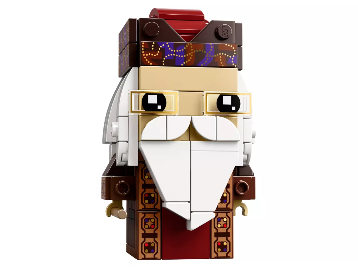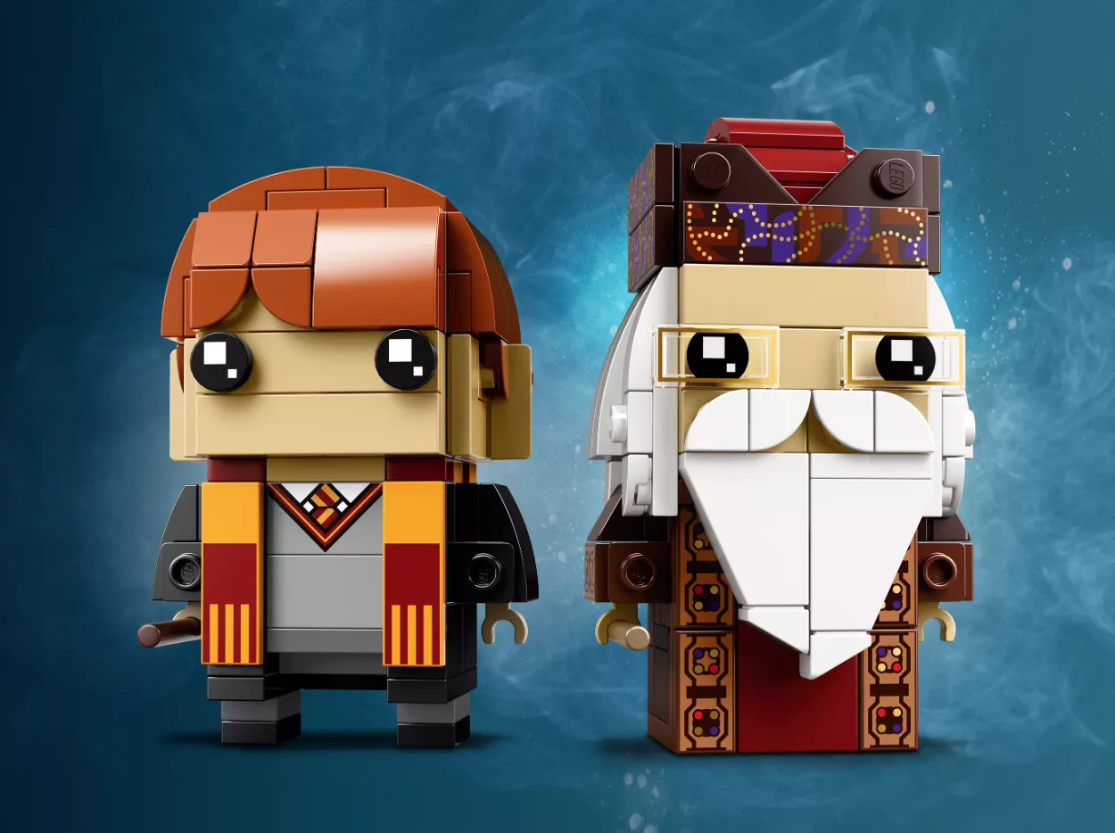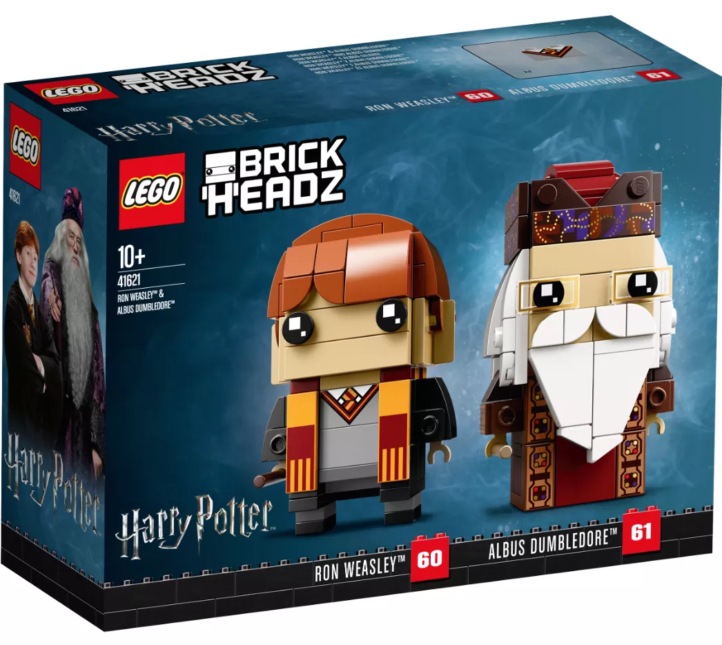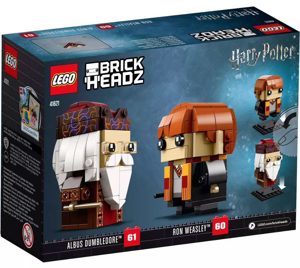 Собери фигурки Рона Уизли и Альбуса Дамблдора LEGO BrickHeadz (41621) из фильма «Гарри Поттер», используя этот замечательный набор. Посмотри, какие у Рона тщательно прорисованные глаза, рыжие волосы, джемпер с эмблемой Гриффиндора и волшебная палочка, взгляни на шляпу с кисточкой и седую бороду директора школы. Установи Рона и Дамблдора на демонстрационные пластины и покажи их всем своим друзьям!