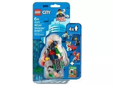 Kinder erleben richtige Action mit dem Polizei-Minifiguren-Zubehörset (40372) von LEGO City. Enthalten sind Duke DeTain, der Held aus der TV-Serie LEGO City Abenteuer, ein Polizist und 2 Ganoven als Minifiguren. Fans der Serie können damit ihre Lieblingsszenen nachbauen und -spielen. Mit dem Bankautomaten, dem Fluchtwagen sowie Walkie-Talkie, Brechstange und Dynamit sind alle Voraussetzungen für stundenlangen Räuberjagd-Spaß gegeben.