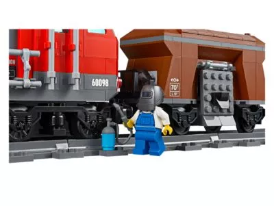 Hier kommt der grandiose Schwerlastzug! Auf dem Güterbahnhof von LEGO City herrscht Hochbetrieb. Der Schweißer führt noch einige kurzfristige Reparaturen an den Gleisen durch, während der Lokführer und der Maschinist die abschließende Kontrolle an der leistungsstarken Diesel-Lok vornehmen. Steig auf den riesigen Gleitkran, lass den Haken hinab und heb den schweren Helikopter auf den Tieflader-Waggon. Setz dich dann ans Steuer des robusten Baggerladers und schiebe die schweren Steine zusammen, damit sie der Kranführer mit der Schaufel aufnehmen und in den Schüttgutwaggon schütten kann. Wenn die gesamte Fracht verladen ist, lädst du auch noch den Baggerlader auf – und schon kann's losgehen. „Alles einsteigen!“ Dieser robuste motorisierte Zug wird mit einer 8-Kanal-Infrarot-Fernsteuerung mit 7 Geschwindigkeiten gesteuert und kann so gut wie alles transportieren! Enthält 5 Minifiguren mit entsprechender Ausstattung: einen Lokführer, einen Maschinisten, einen Schweißer, einen Kranführer sowie einen Baggerladerfahrer.