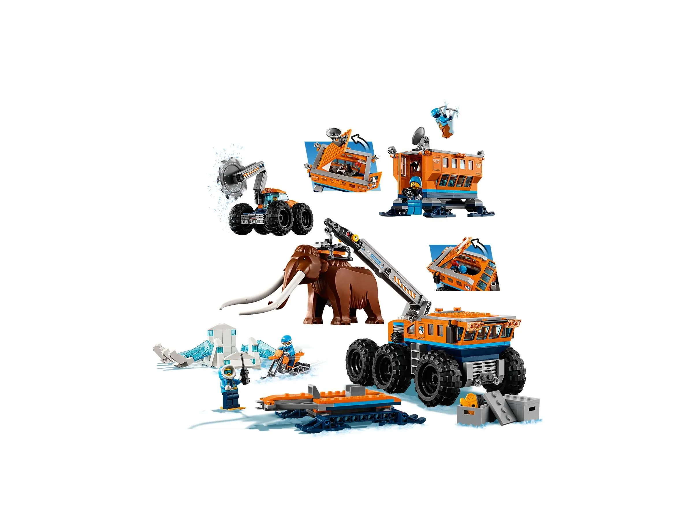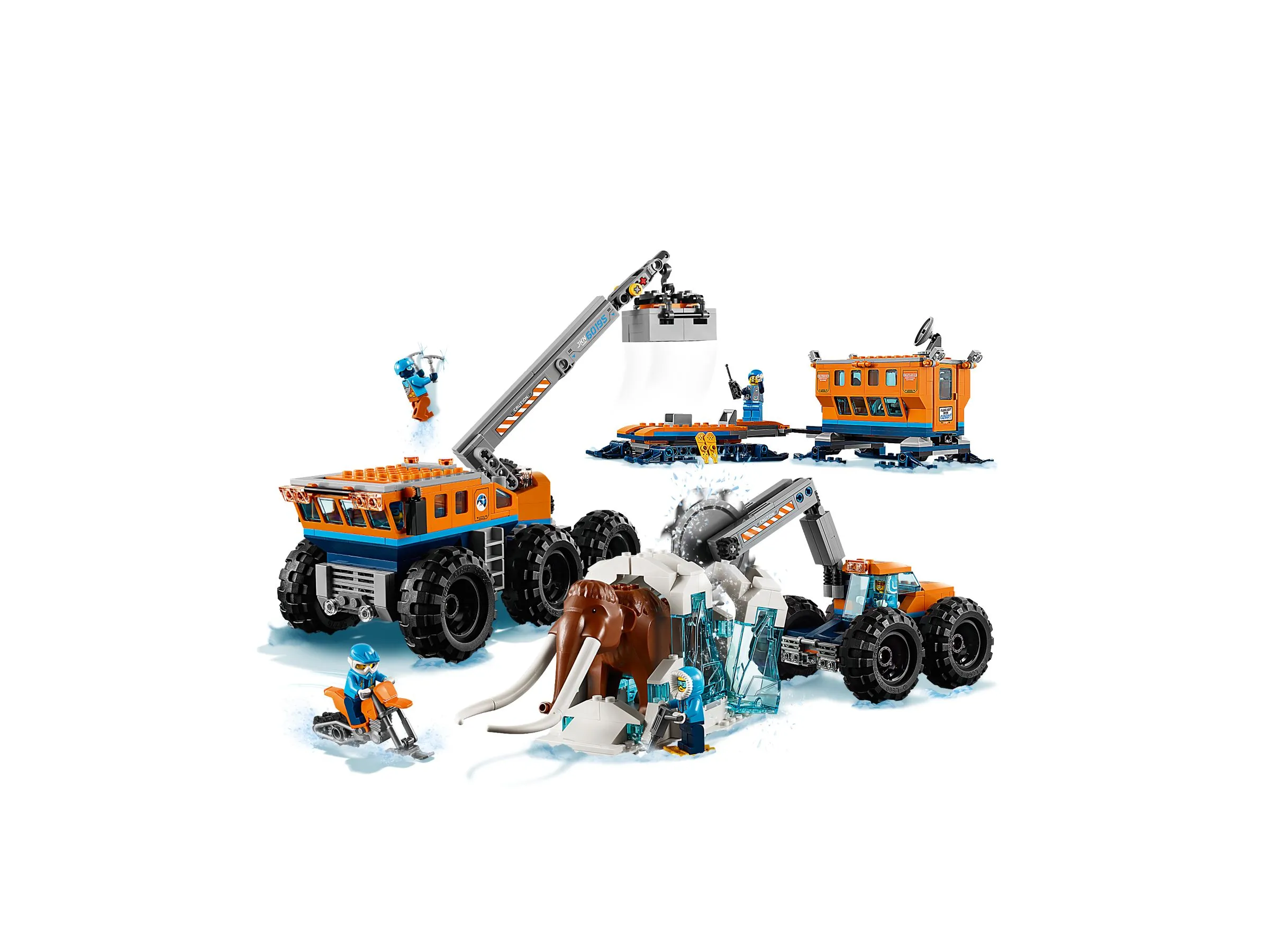 Комплект арктической экспедиции включает минифигурки, уникальную фигурку мамонта, ледяную глыбу, многофункциональную передвижную базу и снежный мотоцикл.