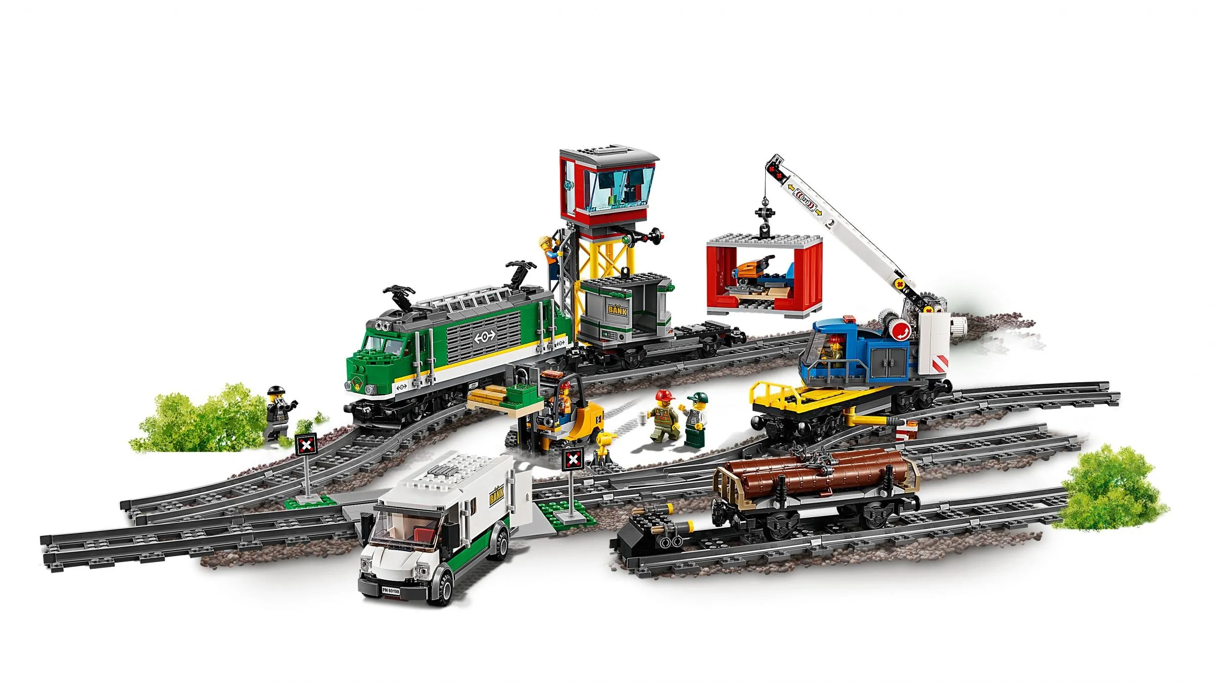 В наборе LEGO CITY 60198 Грузовой поезд представлены различные элементы для создания реалистичной железнодорожной системы. Основные компоненты набора включают: