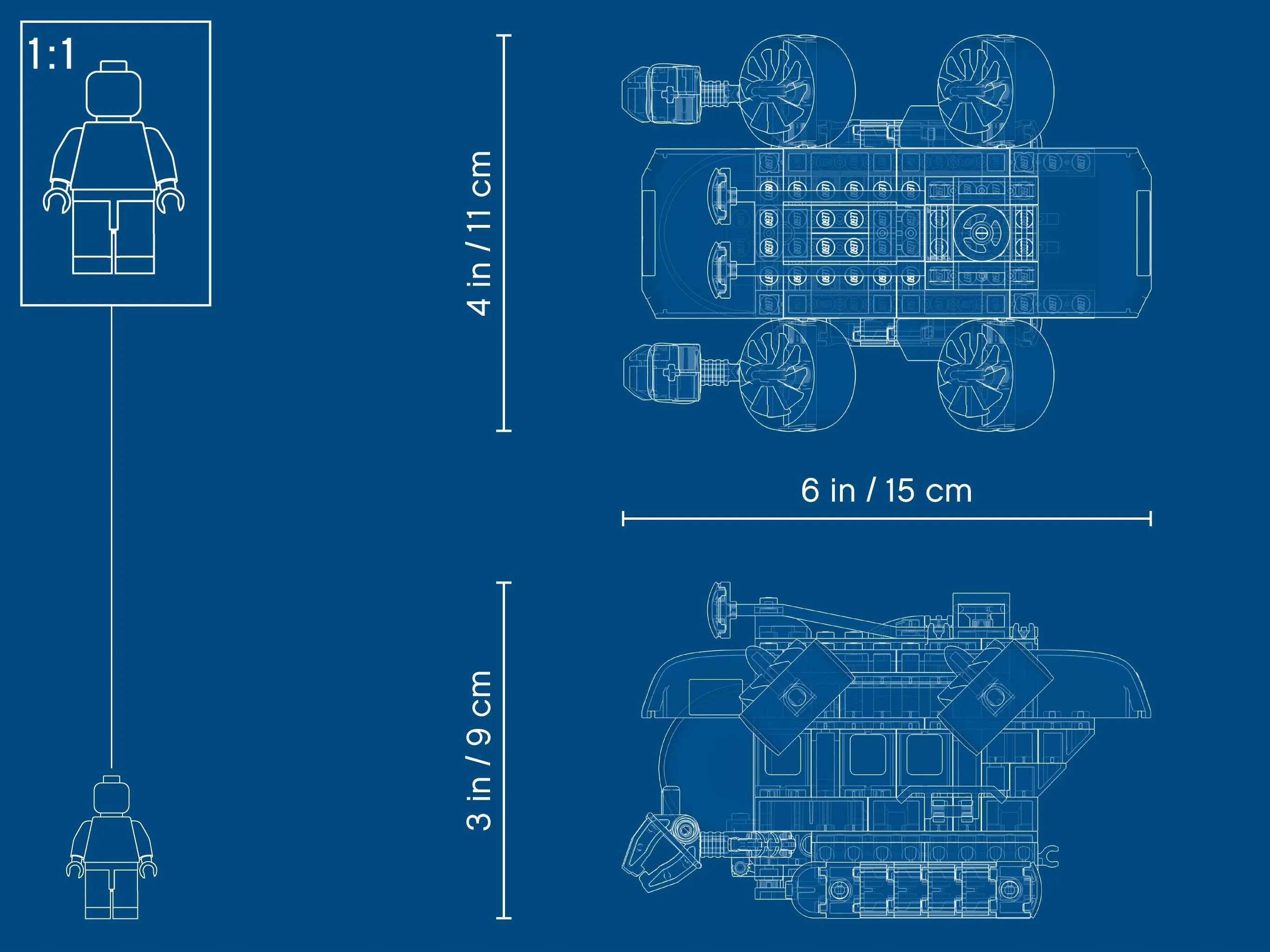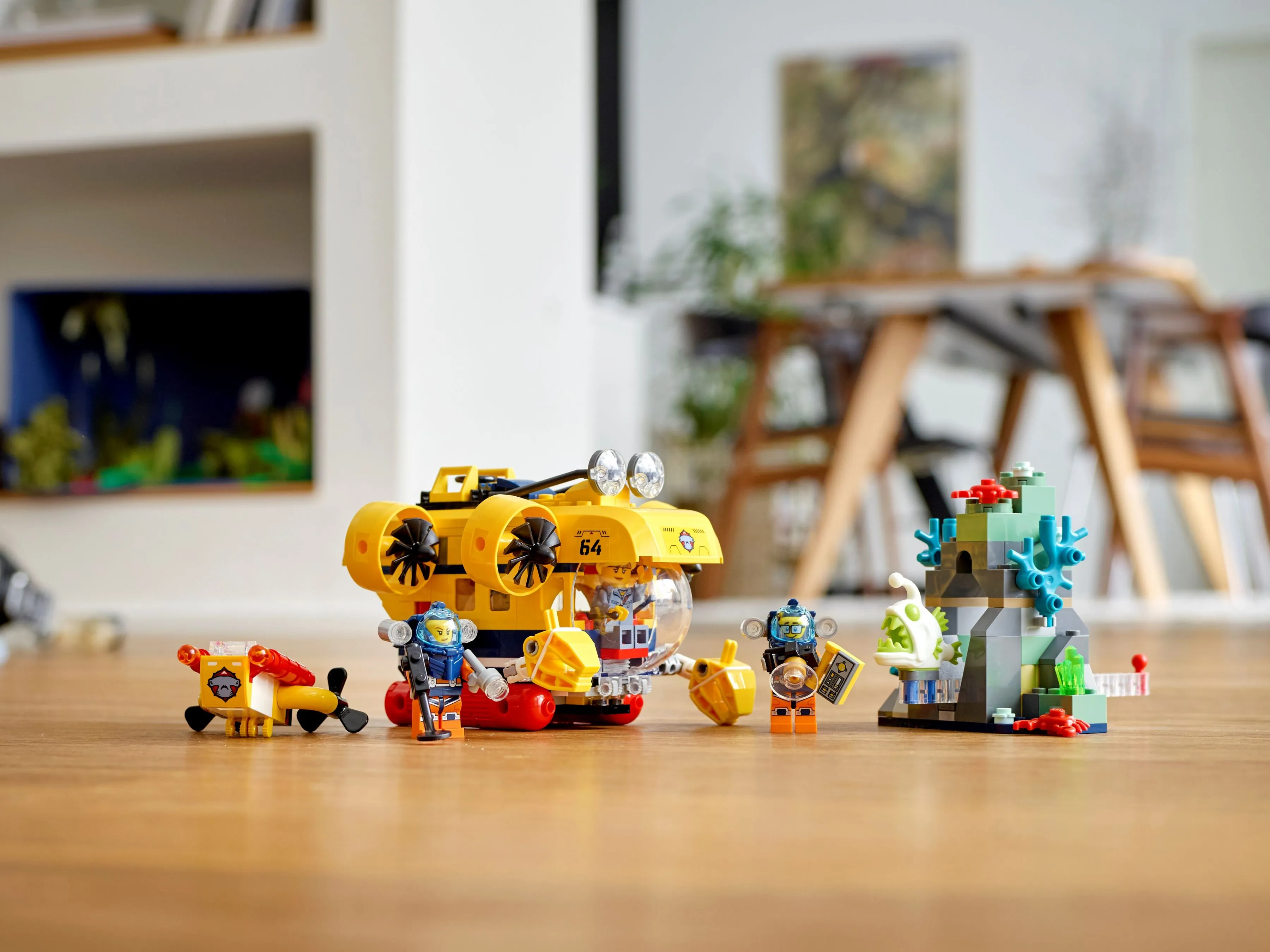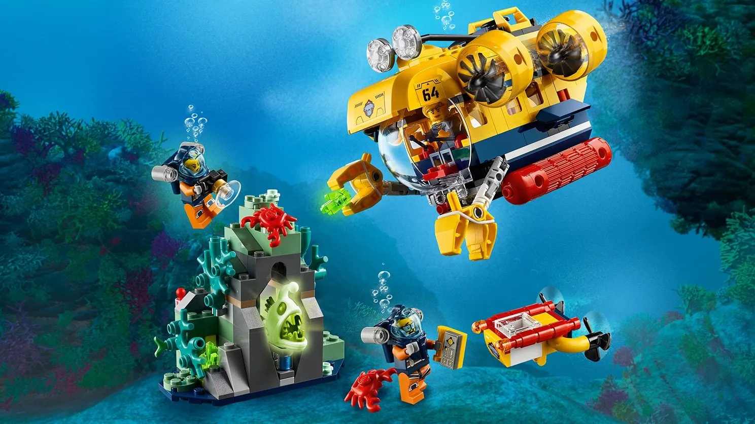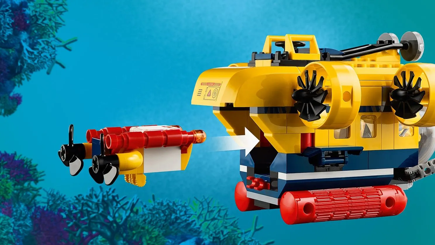Подводная лодка оснащена куполообразным кокпитом, который открывается, обеспечивая доступ к просторному внутреннему пространству, где можно разместить минифигурки. Съемные манипуляторы позволяют выполнять сложные задачи под водой, например, захватывать образцы или исследовать затонувшие объекты. Дрон оснащен вращающимися пропеллерами и камерой для детального изучения океанских глубин.