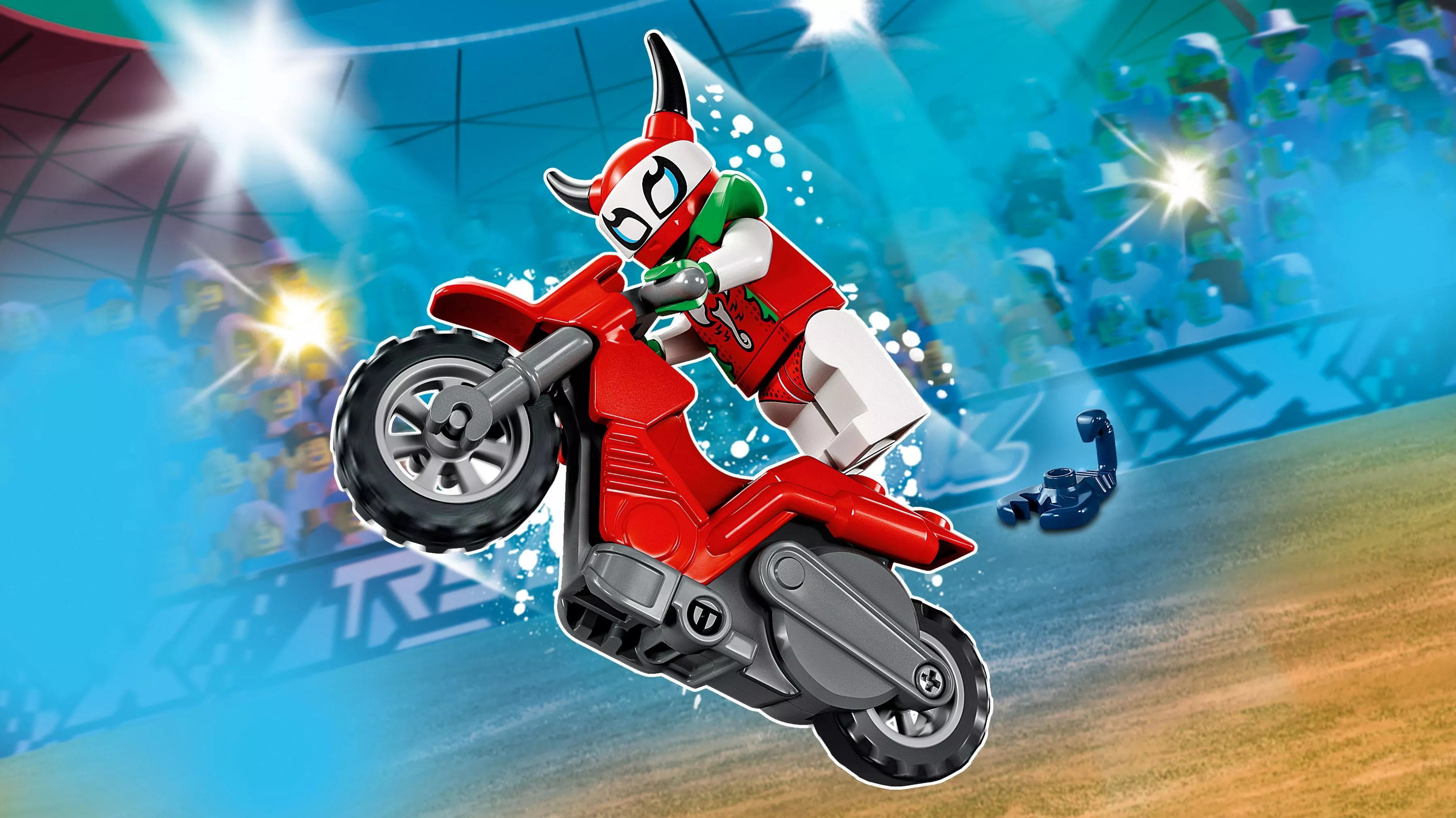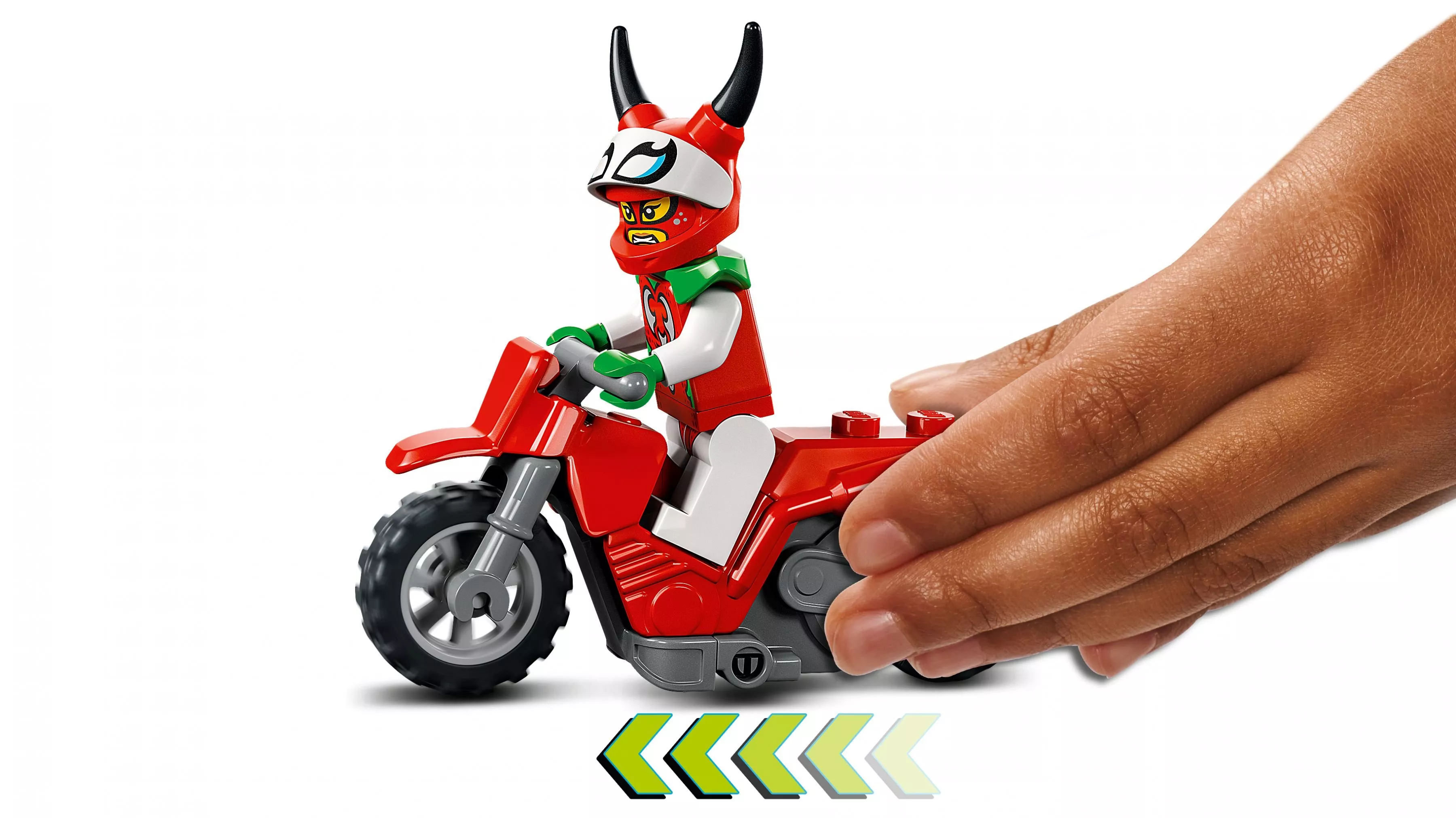 Набор включает в себя все необходимое для создания захватывающих трюков и сцен с участием отчаянной гонщицы, известной как Скорпионесса. В комплект входит минифигурка Скорпионессы в ярком костюме с шлемом и уникальным принтом. Главный элемент набора – это мощный трюковой мотоцикл с функцией инерционного двигателя, который позволяет выполнять разнообразные трюки и прыжки.