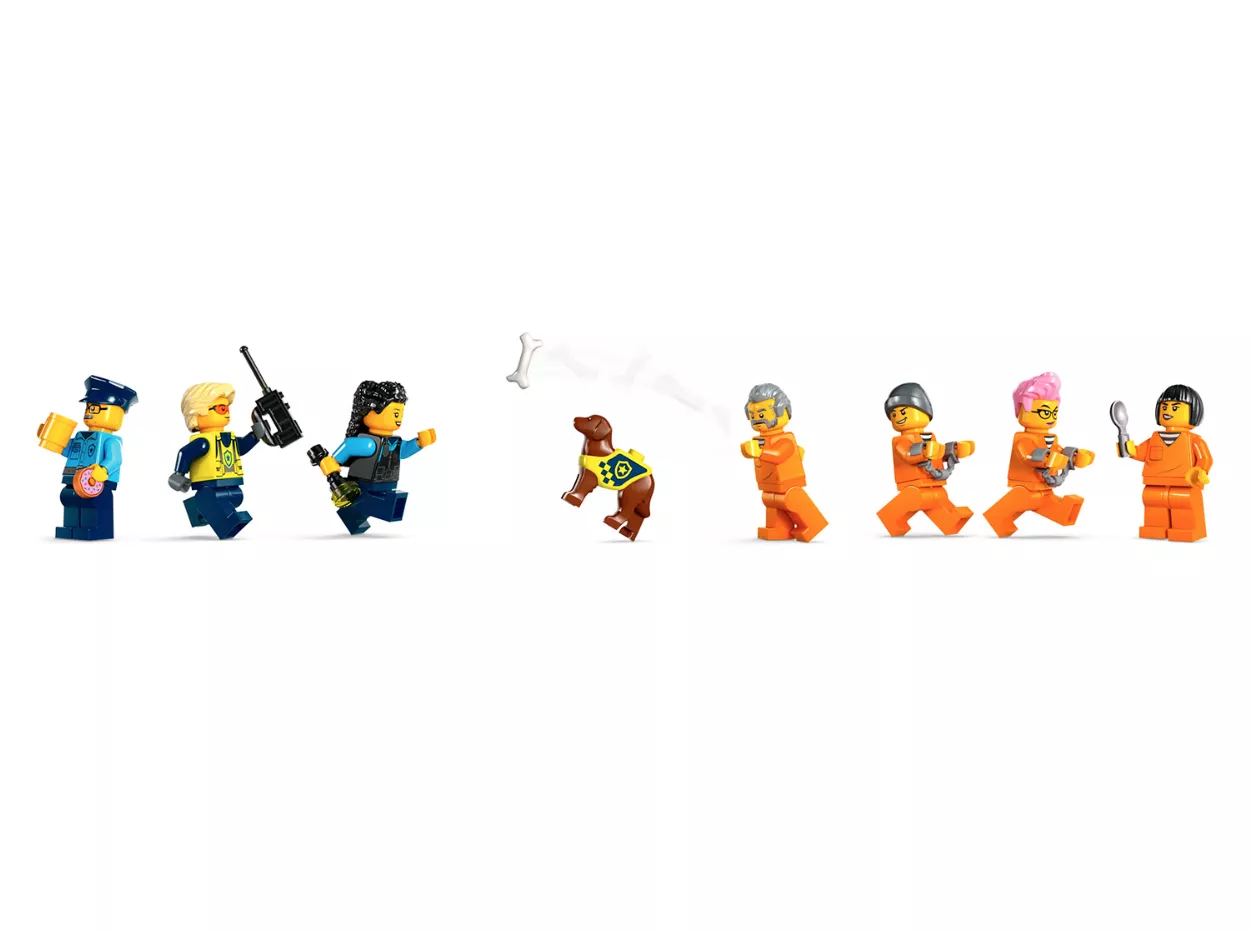 • В набор входит сборный тюремный остров со скалой, тюрьмой, полицейским катером, шлюпкой, вертолетом, 3 минифигурками полицейских и 4 заключенными, а также фигурками полицейской собаки и акулы.