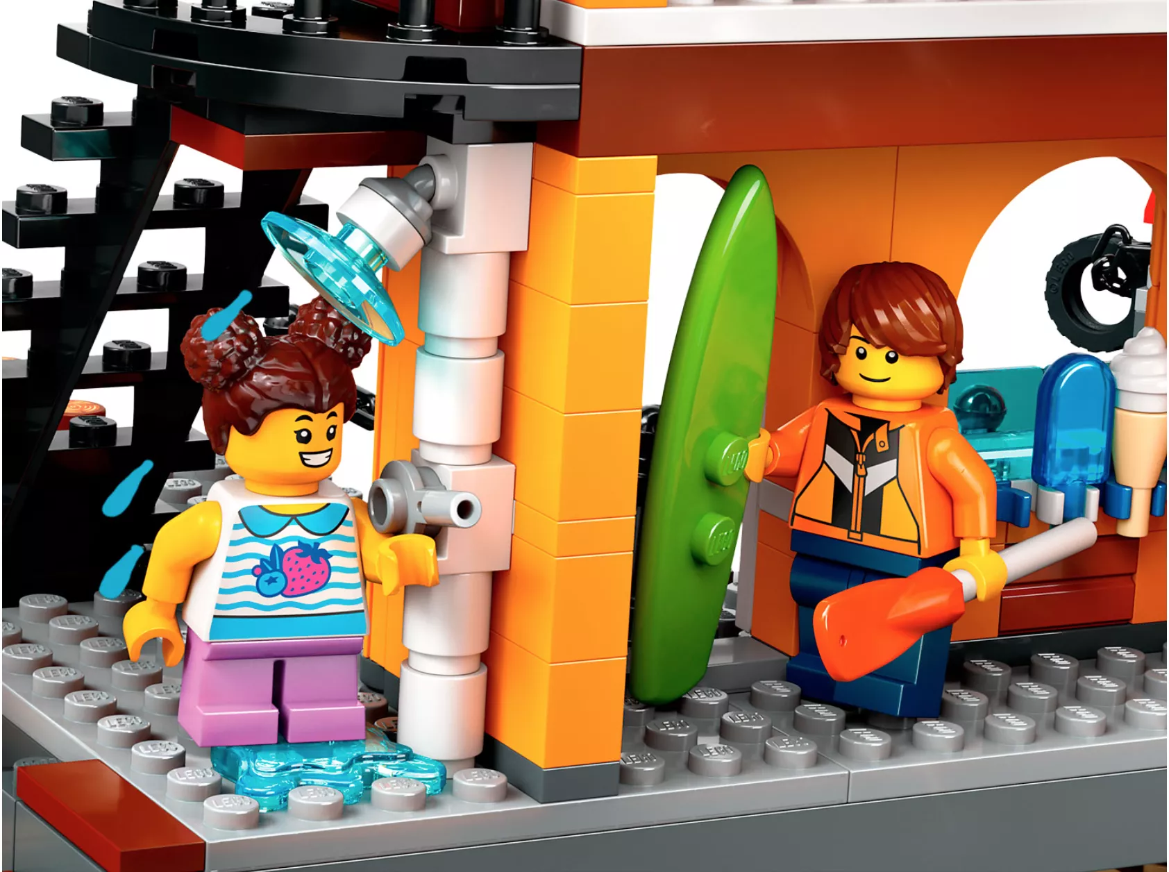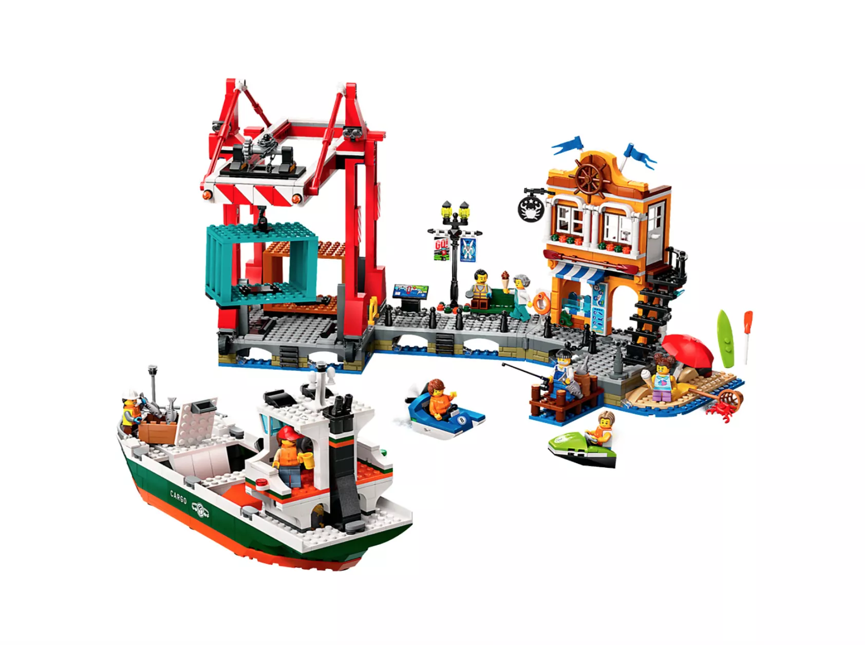 • В этот набор входит корабль, 2 грузовых контейнера, работающий контейнерный кран, гавань с магазином и рестораном, водный скутер, катамаран и 8 минифигурок.