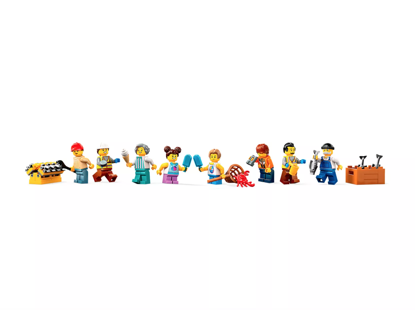 • Аксессуары для минифигурок LEGO — аксессуары включают удочку, гаечный ключ, 2 рации, крабовую сеть и фигурку краба.