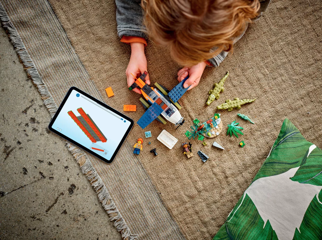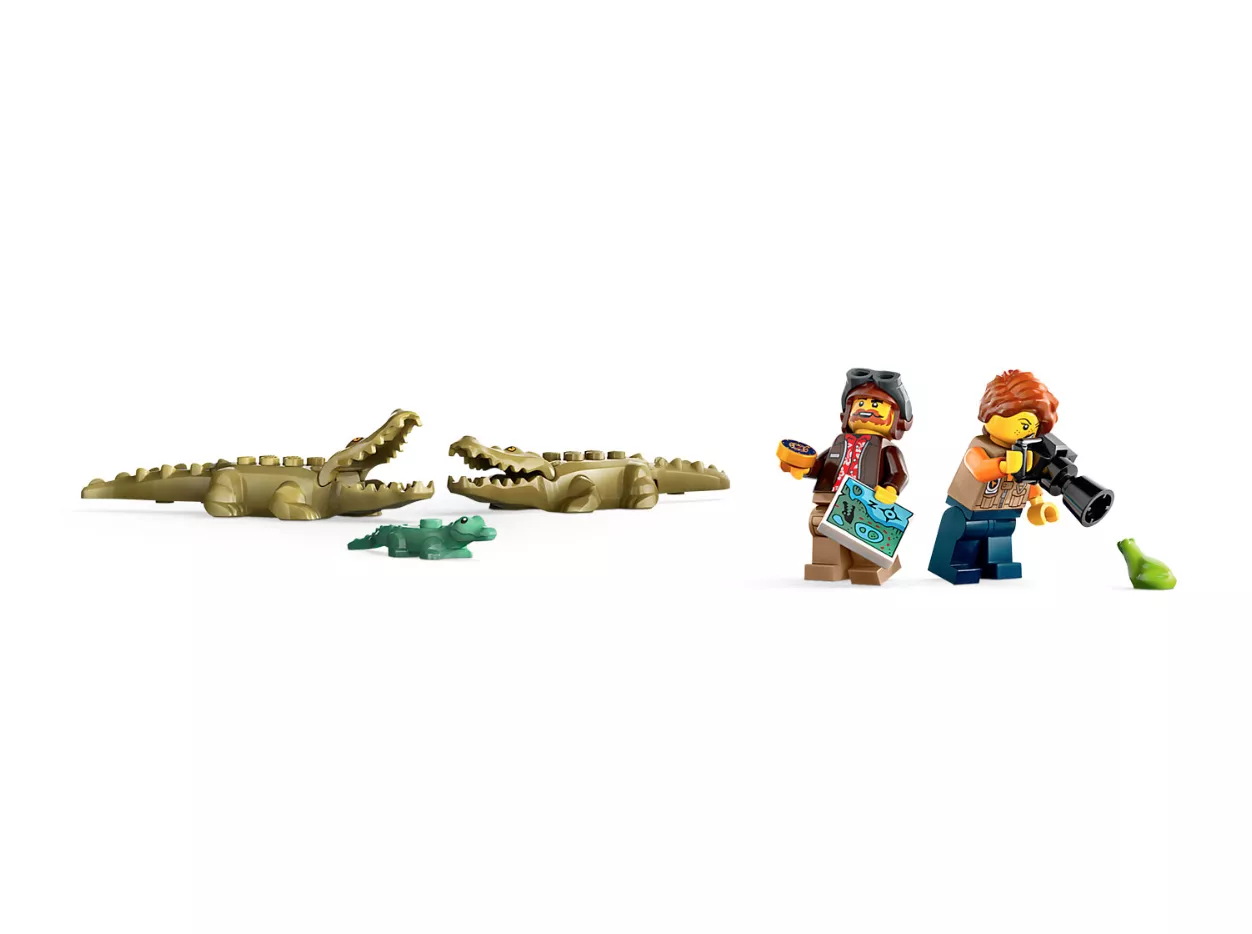 • Игровой сюжет — дети наслаждаются увлекательной сборкой, а затем присоединяются к фотографу и пилоту на борту игрушечного самолета для захватывающих приключений сафари на крокодилах.
