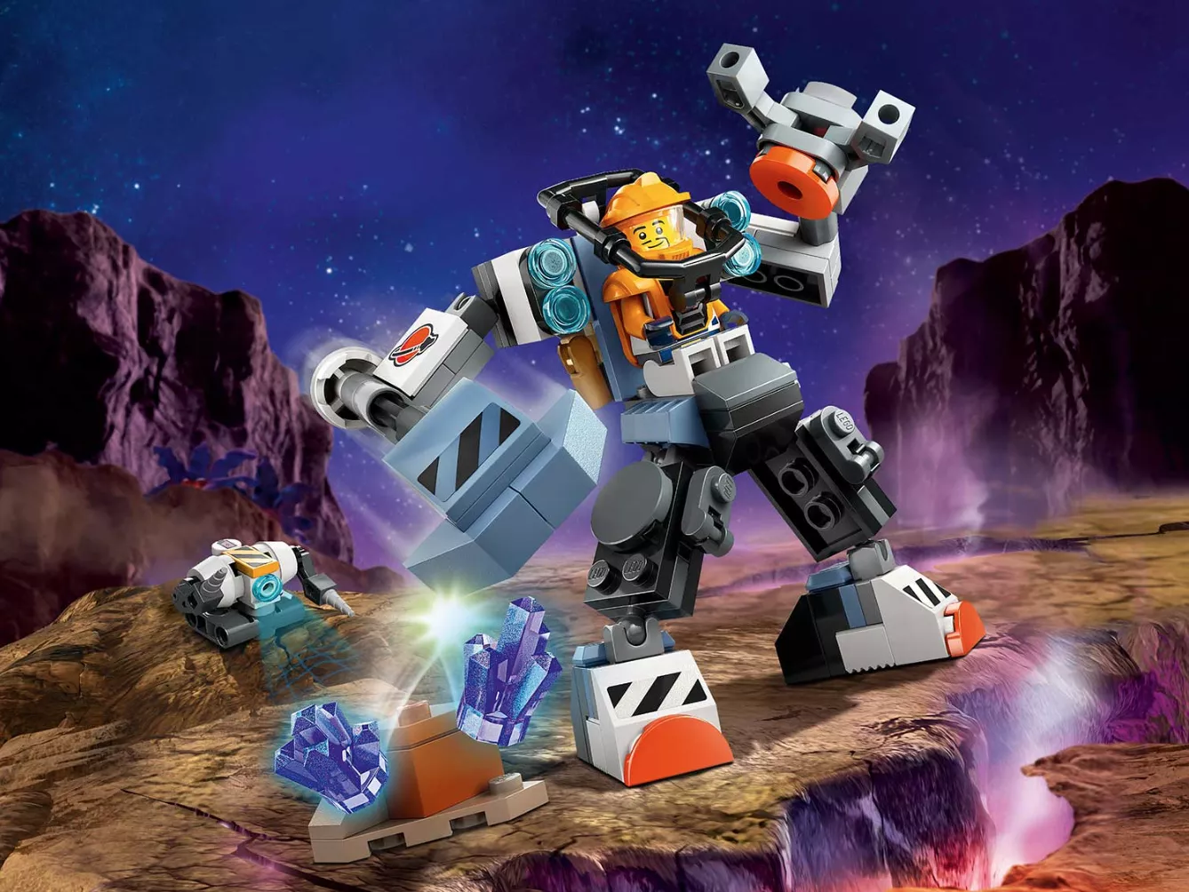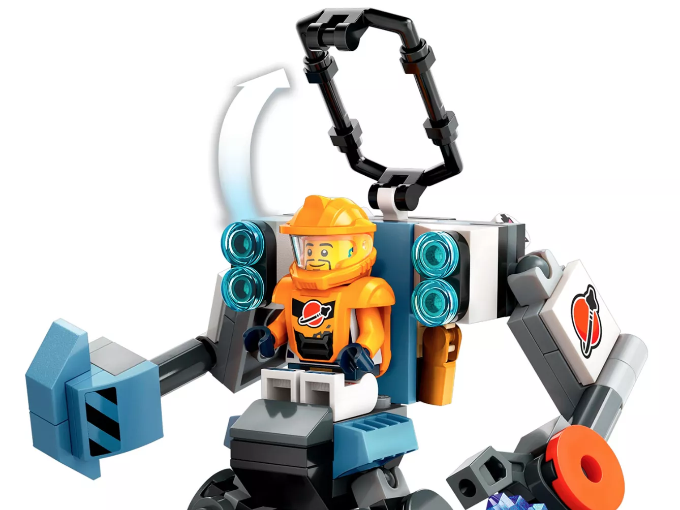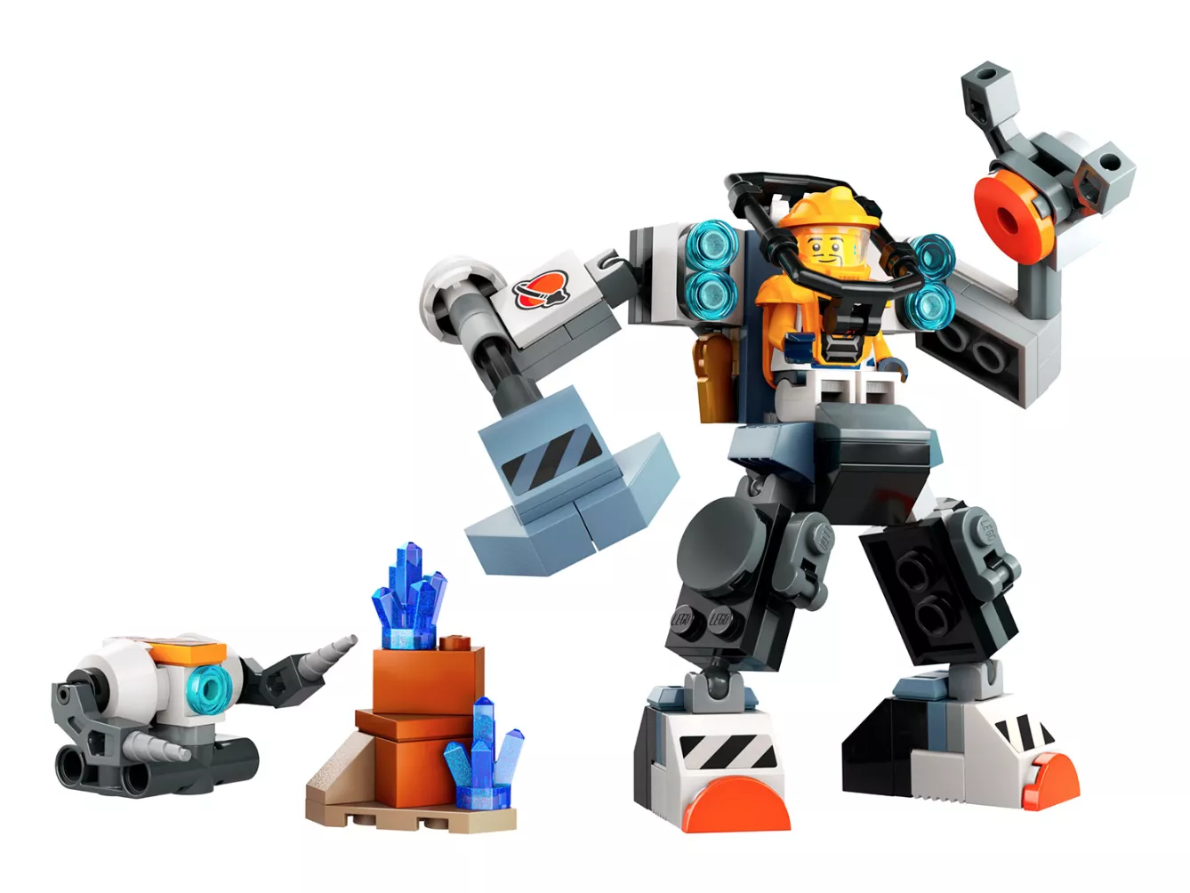 • Космическая игрушка с интересными функциями. Дети смогут поместить минифигурку космического экипажа в кабину робота и использовать молот и когти, чтобы исследовать воображаемые планеты в поисках энергетических кристаллов.