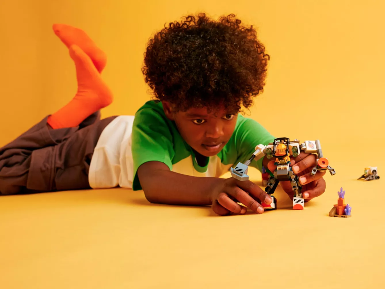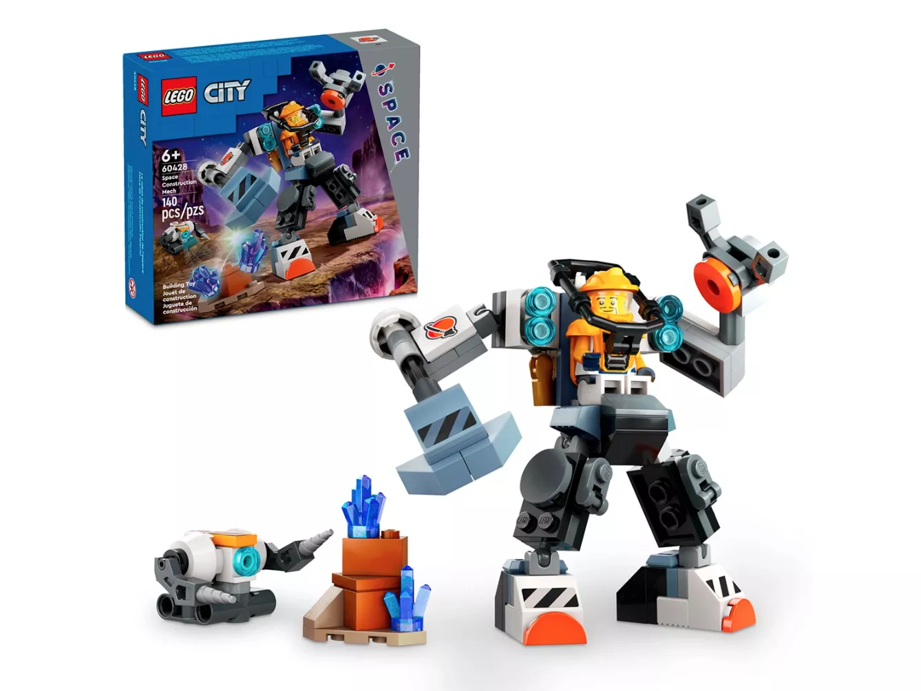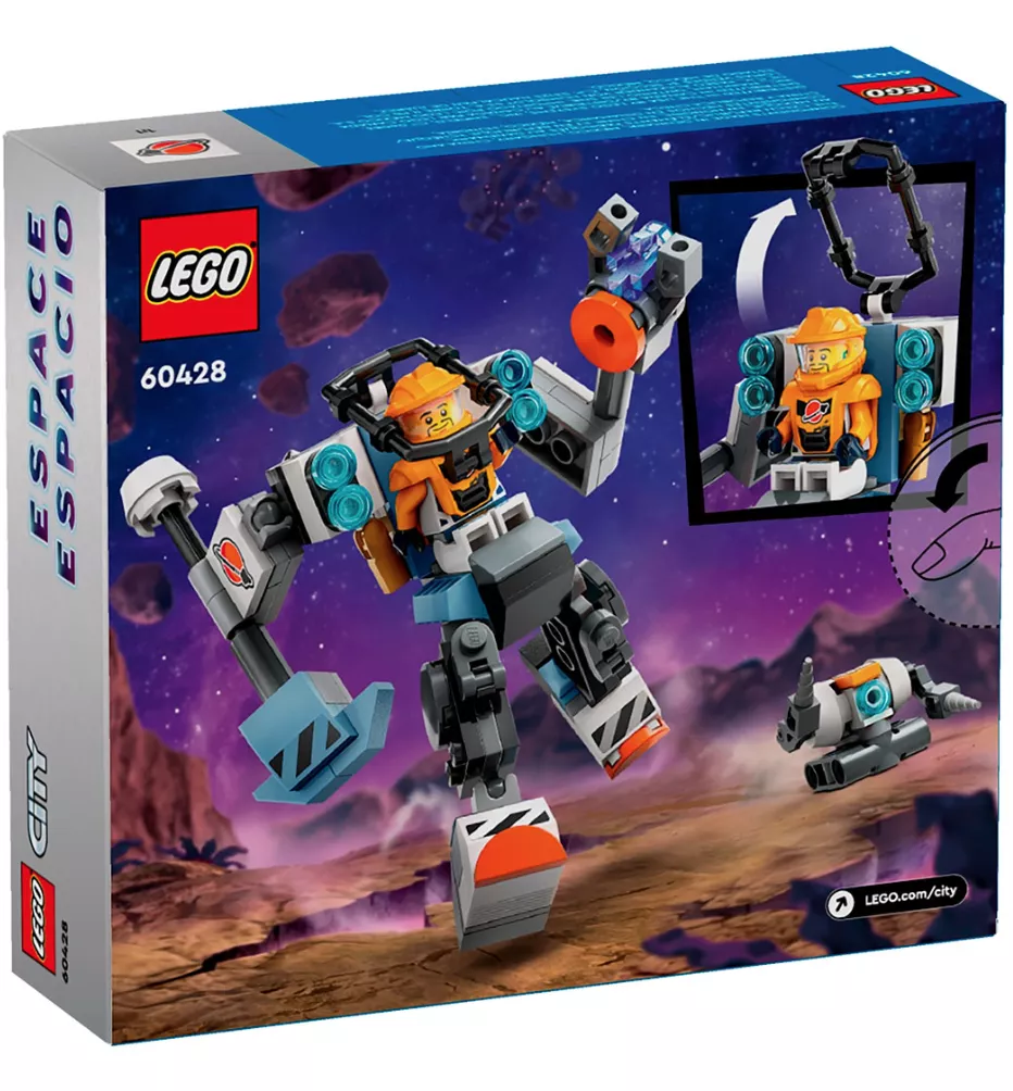• В набор LEGO City «Space Construction Mech» (60428) для детей от 6 лет и старше входит шарнирный робот с молотком и когтями-манипуляторами, кабина пилота с местом для минифигурки и большие ступни для исследования новых миров.