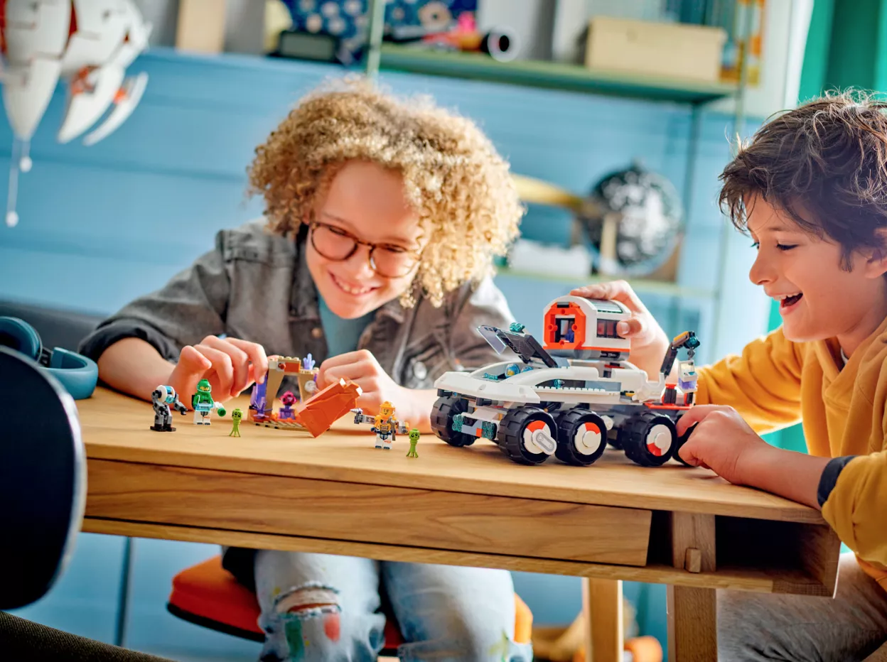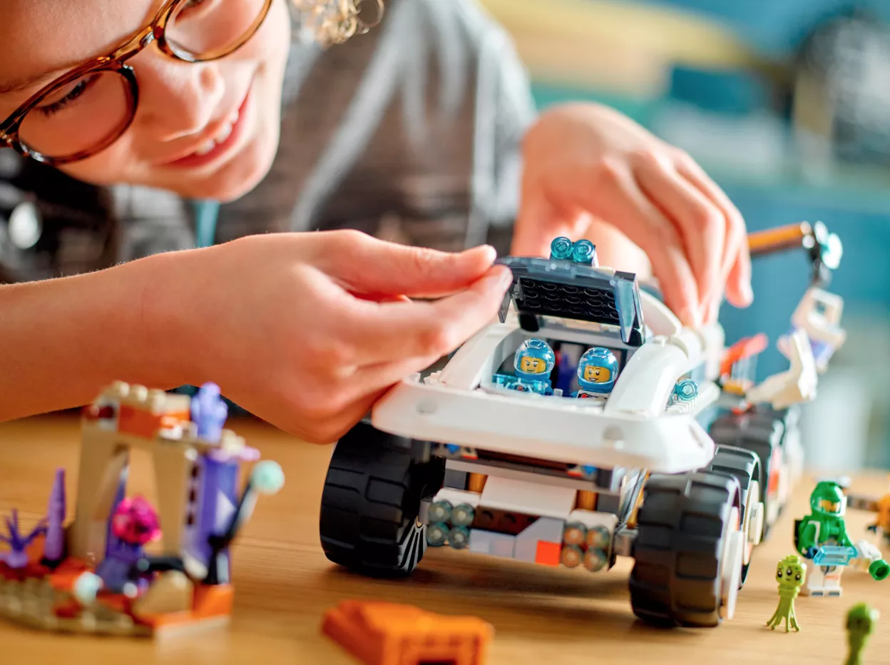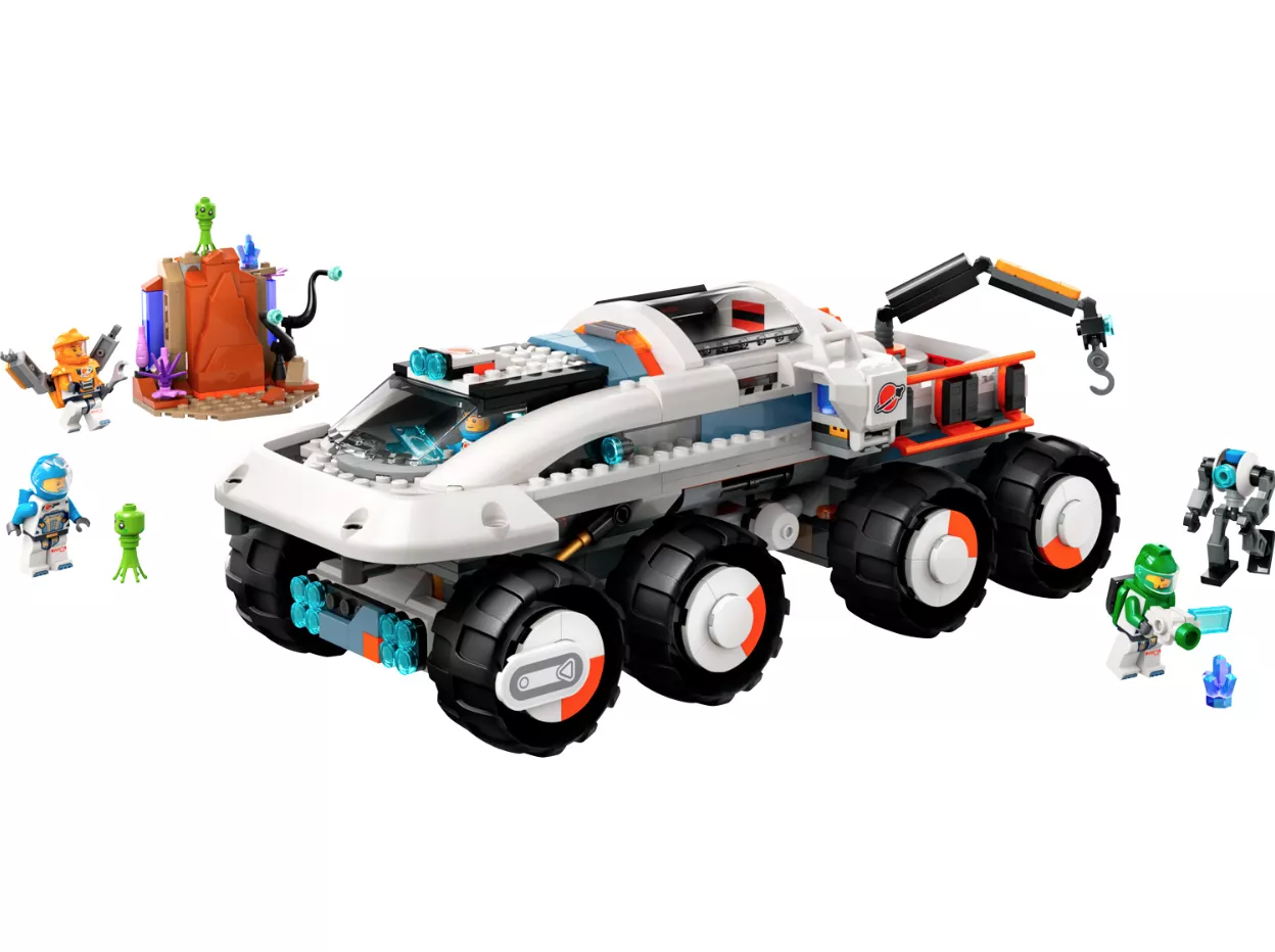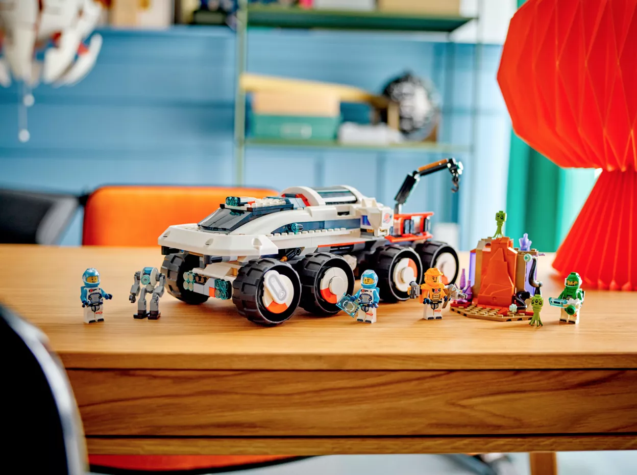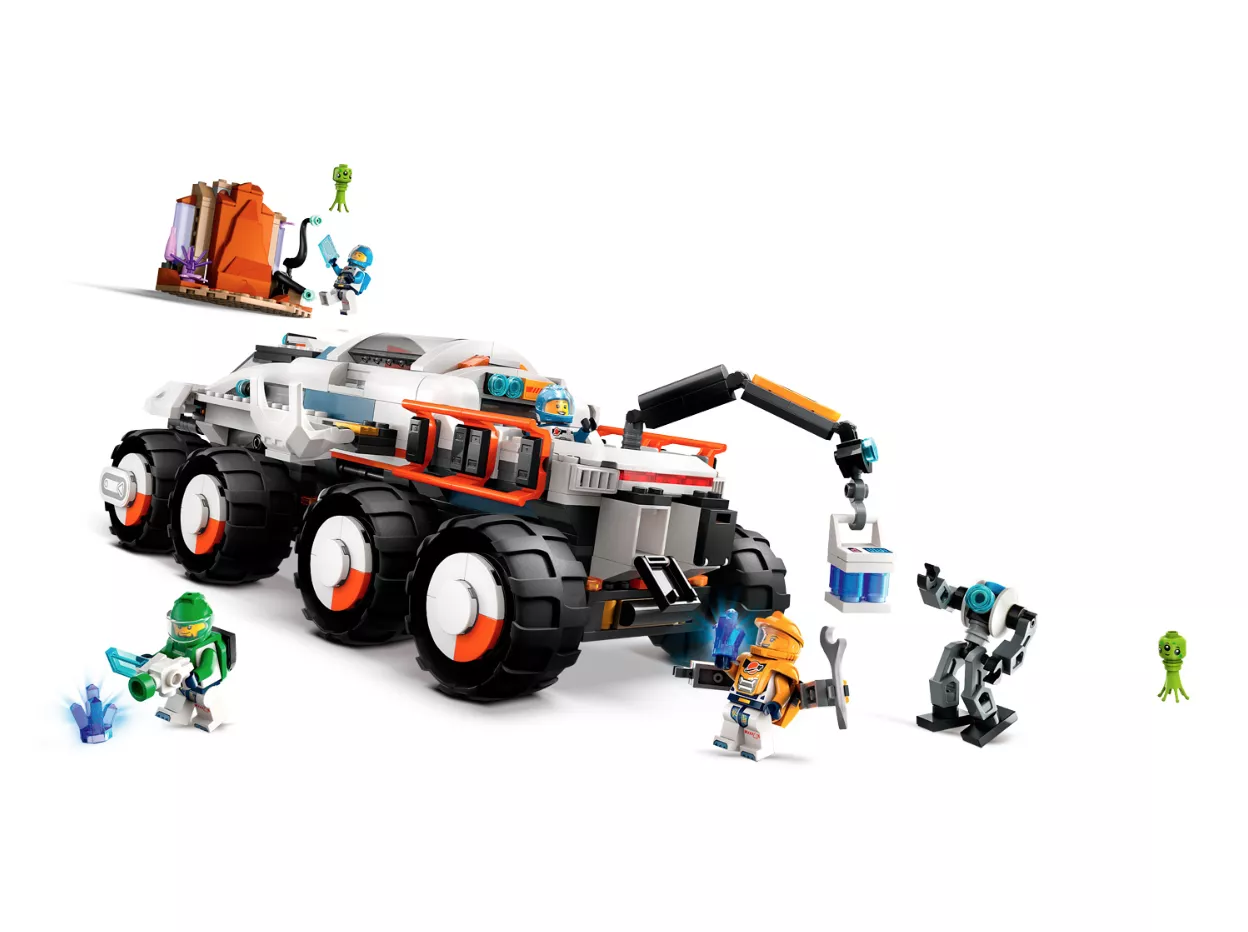 • Что входит в этот игровой набор для освоения космоса? 8-колесный вездеход, сцена планеты с растениями и игрушечным кристаллом, 4 минифигурки космического экипажа, а также робот и 2 фигурки инопланетян.