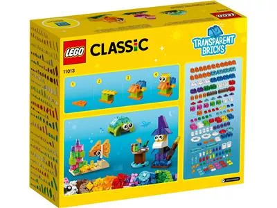 С конструктором LEGO Classic 11013 «Прозрачные кубики» вы проведете много часов за увлекательным занятием. Выберите любую идею для сборки, это могут быть: блестящий робот, подающий чай, волшебник с флаконом эликсиров, единорог, игрушечная птица, лев, робот, розовая птица, рыба среди кораллов или черепаха. Развивающая игрушка - это отличная идея для подарка на день рождения, Новый год или любой другой праздник для ребенка старше 4 лет.
