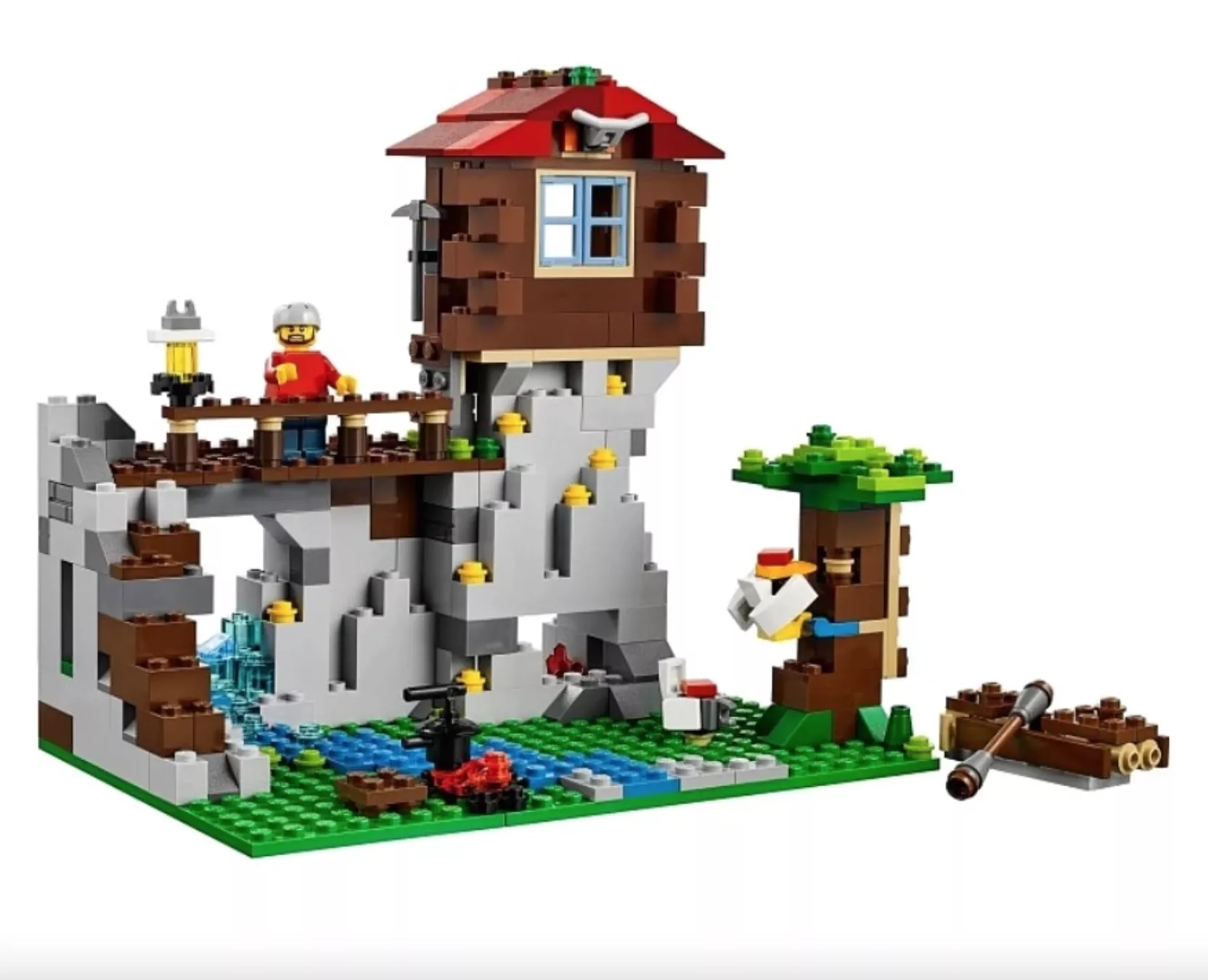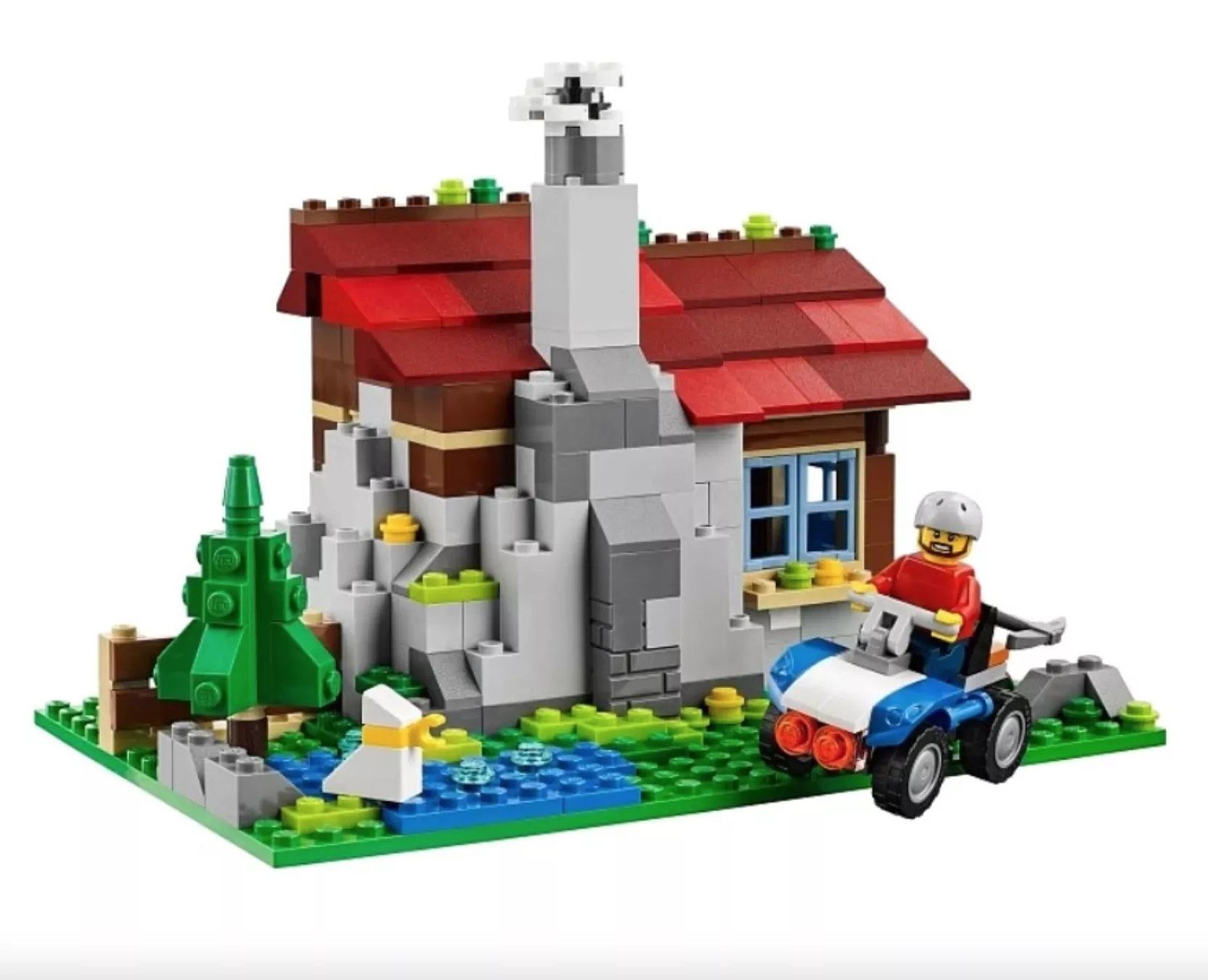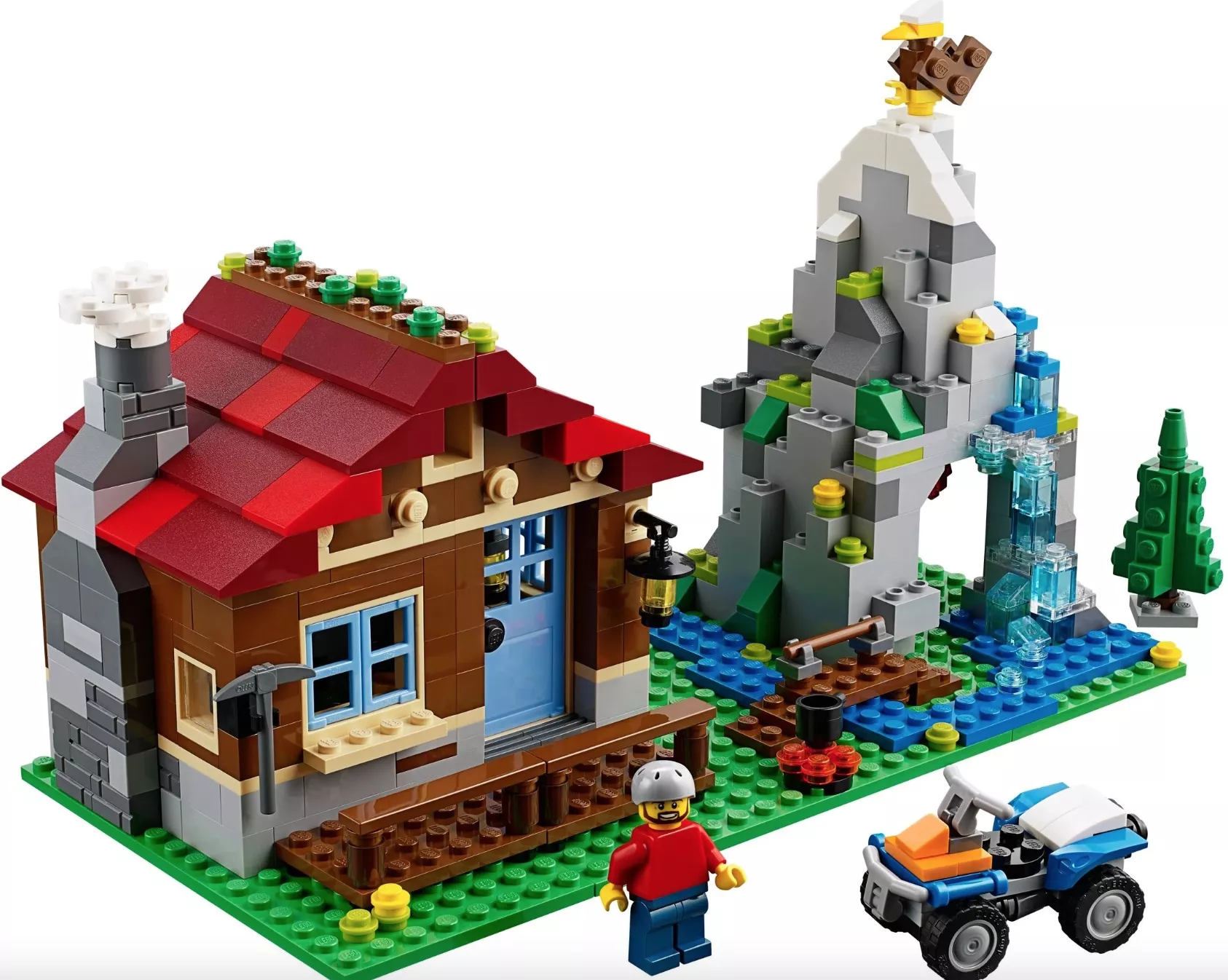Уютный деревянный дом из набора Лего 31025 служит перевалочным пунктом для альпинистов, взбирающихся на неприступную гору, расположенную неподалёку. Чтобы добраться сюда путешественники должны воспользоваться мощным квадроциклом. Территория перед постройкой обнесена небольшой изгородью, около которой есть несколько клумб с цветами. Задний двор небольшой. За ним начинается непроходимый еловый лес. Черепичная крыша дома выполнена из хаотично перемешанных бордовых и красных деталей, что предаёт ей реалистичности. Синяя дверь и окно являются цветовым акцентом в дизайне экстерьера. В левой части стены видна серая печная кладка, а в правой – навесной фонарь.