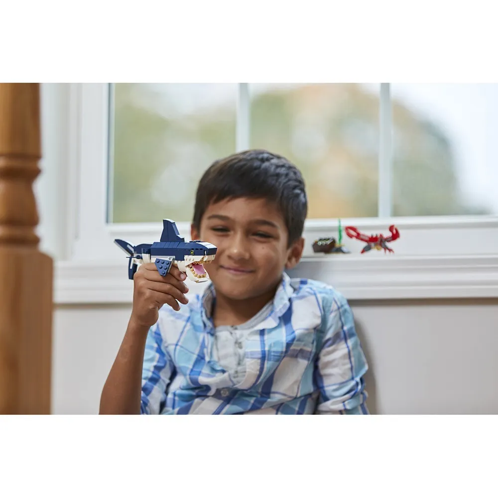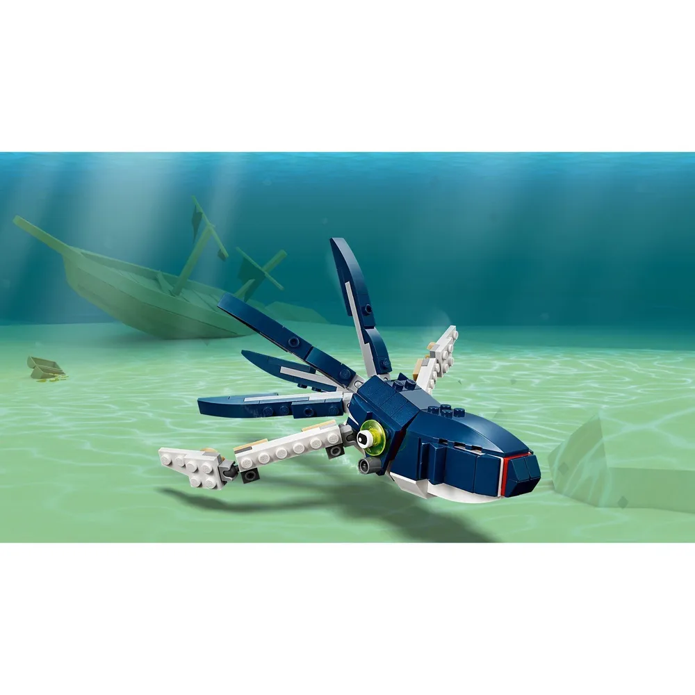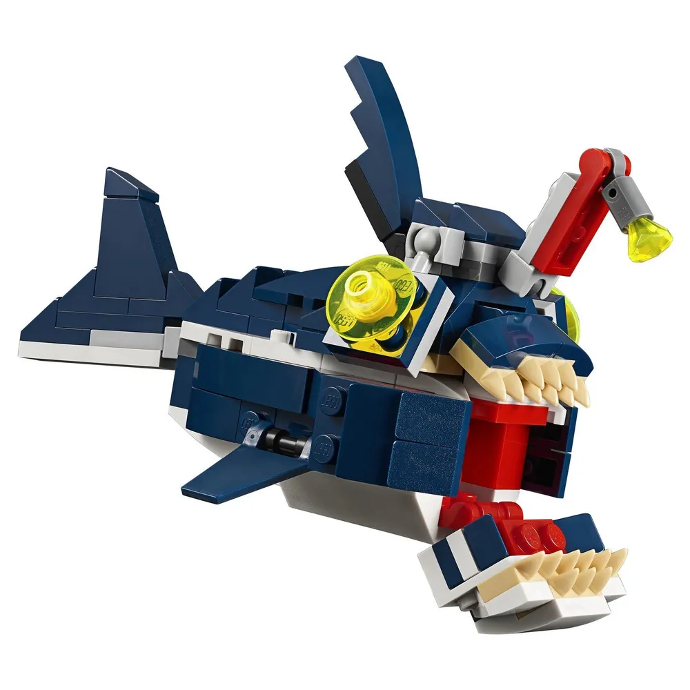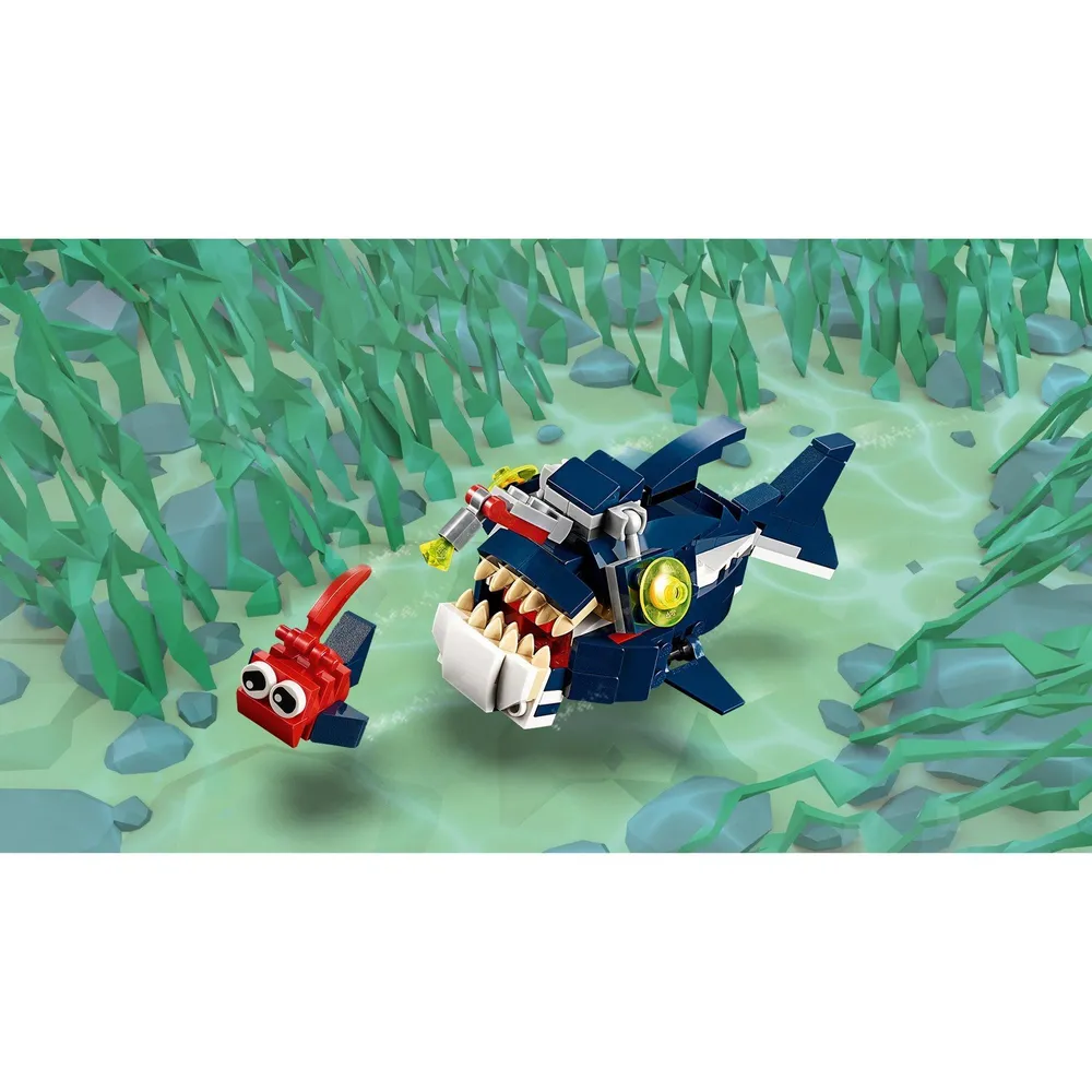 Насладиться морскими приключениями можно с конструктором LEGO Creator 31088 "Обитатели морских глубин". Различные опасности ждут героев в подводном мире. Посмотрите, какая большая и хищная акула с острыми зубами проплывает мимо! Главное, чтобы она не заметила морских путешественников. Из деталей можно собрать также рыбу-удильщика или каракатицу, есть фигурка краба, а дополнительные аксессуары делают игру наиболее реалистичной. Конструктор-трансформер LEGO никого не оставит равнодушным. Яркие детали, интересные персонажи и возможность почувствовать себя исследователем понравятся любому ребенку. Он сможет придумывать новые истории и рассказы, развивая свое воображение. Игра отлично разрабатывает ловкость.