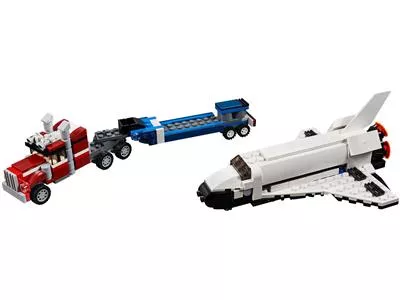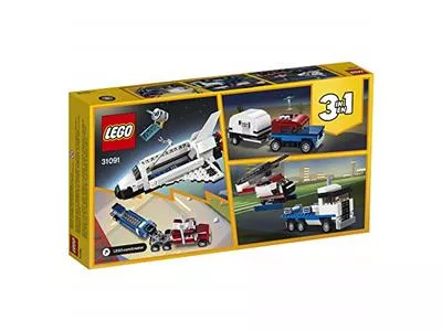 Отправиться в космическое путешествие всегда можно с набором от LEGO, 31091 «Транспортировщик шаттлов». Шаттл можно доставить на грузовике-эвакуаторе на площадку космодрома, выгрузить и запустить в космос. Потом необходимо открыть люк отсека и с помощью бортового крана вывести спутник на орбиту. Это занятие помогает осваивать космос и выполнять важную миссию. Особенностью этого набора является то, что кроме самолета можно сделать из деталей автомобиль с фургоном или вертолет.