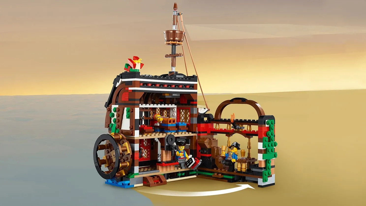 Соберите свой собственный пиратский корабль и отправьтесь на поиски сокровищ. Набор позволяет перестроить корабль в пиратский таверну или остров сокровищ, расширяя возможности для творческой игры и увлекательных сюжетов.
