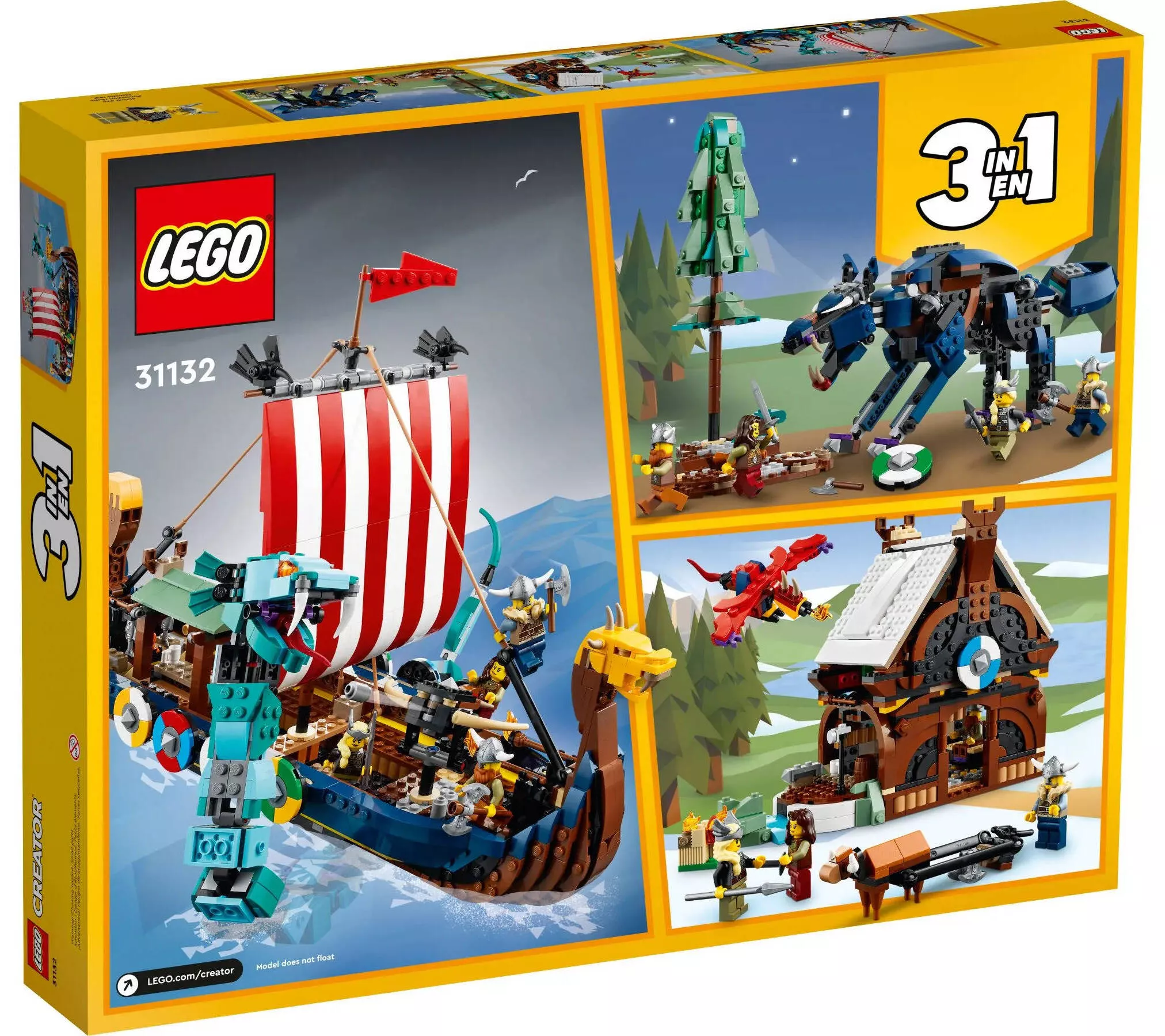 Набор LEGO 31132 позволяет вам построить корабль викингов, который отправляется в опасное путешествие через суровые моря, где герои столкнутся с могучим Змеем Мидгарда. Набор также предлагает две альтернативные модели, каждая из которых вдохновлена мифами и легендами.