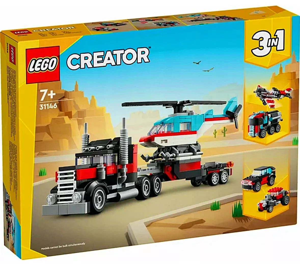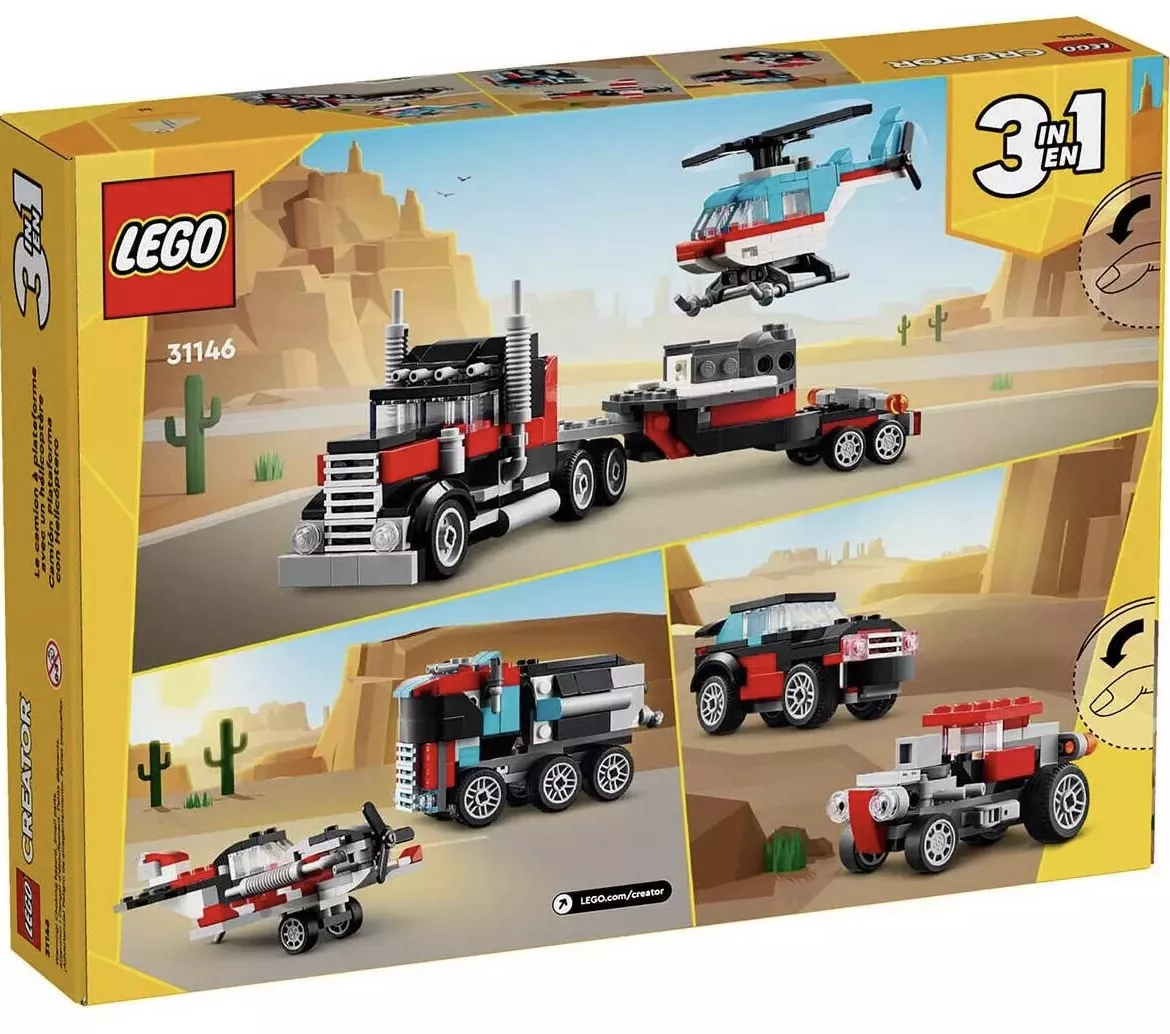 Конструктор LEGO Creator 31146 Грузовик-платформа с вертолетом – это универсальный и увлекательный набор, который позволит детям собрать три разных модели: грузовик-платформу с вертолетом, гоночный автомобиль и вездеход. Этот набор идеально подходит для юных инженеров и любителей техники, предлагая множество деталей и возможностей для творческой игры.