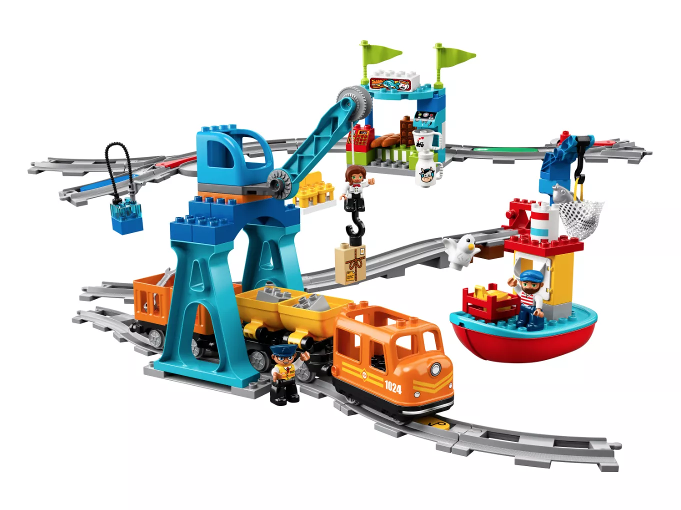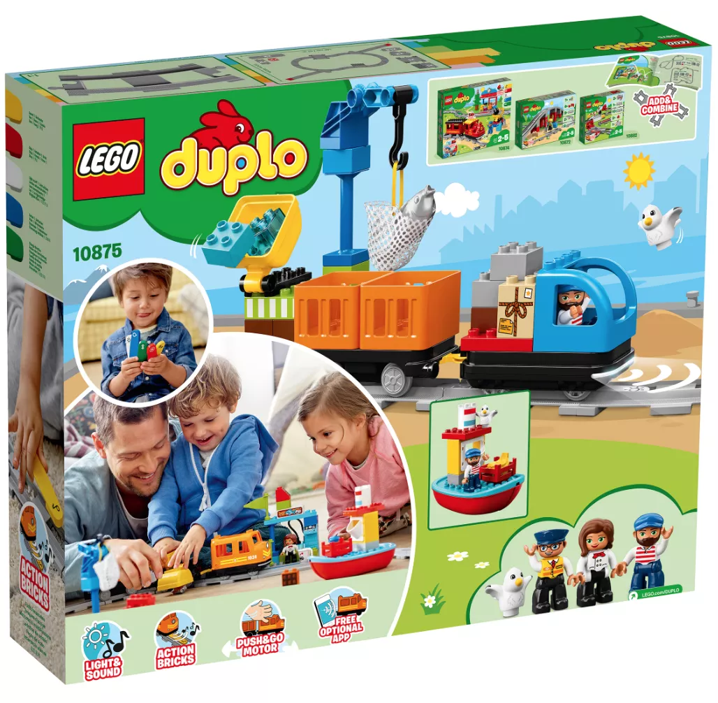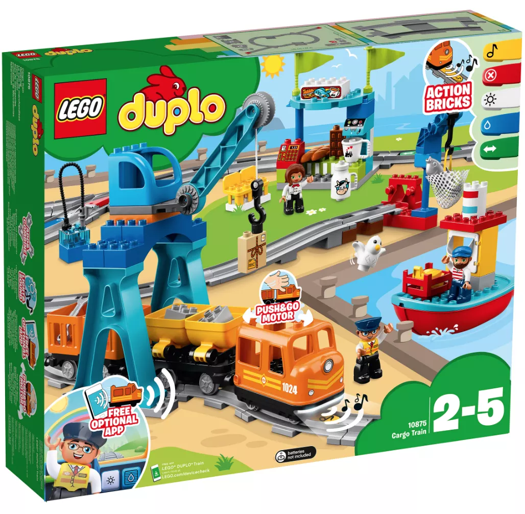 Откройте для ребенка удивительный мир с конструктором LEGO DUPLO Town 10875 "Грузовой поезд". Широкий спектр возможностей позволяет придумывать новые интересные сюжеты, разыгрывать сценки и многое другое. В комплекте имеется грузовой поезд, который быстро движется по железной дороге. Специальные кнопки, размещенные на путях, мгновенно активируют определенные функции, что делает игру более реалистичной и увлекательной. Яркий поезд перемещается с помощью инерционного двигателя. Поэтому его легко остановить рукой или же приподнять при необходимости. Конструктор с крупными деталями станет хорошим подарком на день рождения или любой другой праздник. Ребенку понравится играть одному или в компании друзей. В процессе игры прекрасно разрабатывается мелкая моторика, а также развиваются воображение и логика. При установке специального приложения осуществляется подключение дополнительных возможностей, а также дистанционное управление игрушкой.