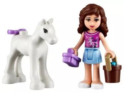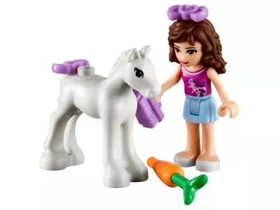 Kümmere dich mit Olivia um den niedlichen Neuling im Pferdestall von Heartlake City! Mit jeder Menge tollem Zubehör! Fülle den Trog mit Wasser aus der beweglichen Pumpe und füttere das Fohlen mit der Karotte! Mit der Schubkarre kannst du unter dem baubaren Baum Heu für das Fohlen sammeln. Mit dem Zubehör aus Schleifen, Bürsten und Kämmen kannst du das Fohlen wunderschön herrichten! Enthält die Spielfigur Olivia.