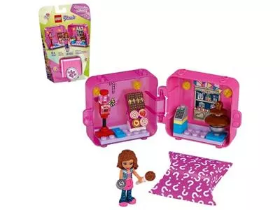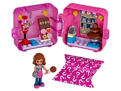 В миниатюрном магазине есть стенд со сладостями, автомат по продаже конфет, шоколадный фонтан и касса. Также в комплект входят две фигурки: Оливия и загадочный зверек, который очень любит сладости, но пока что прячется в пакете-сюрпризе.