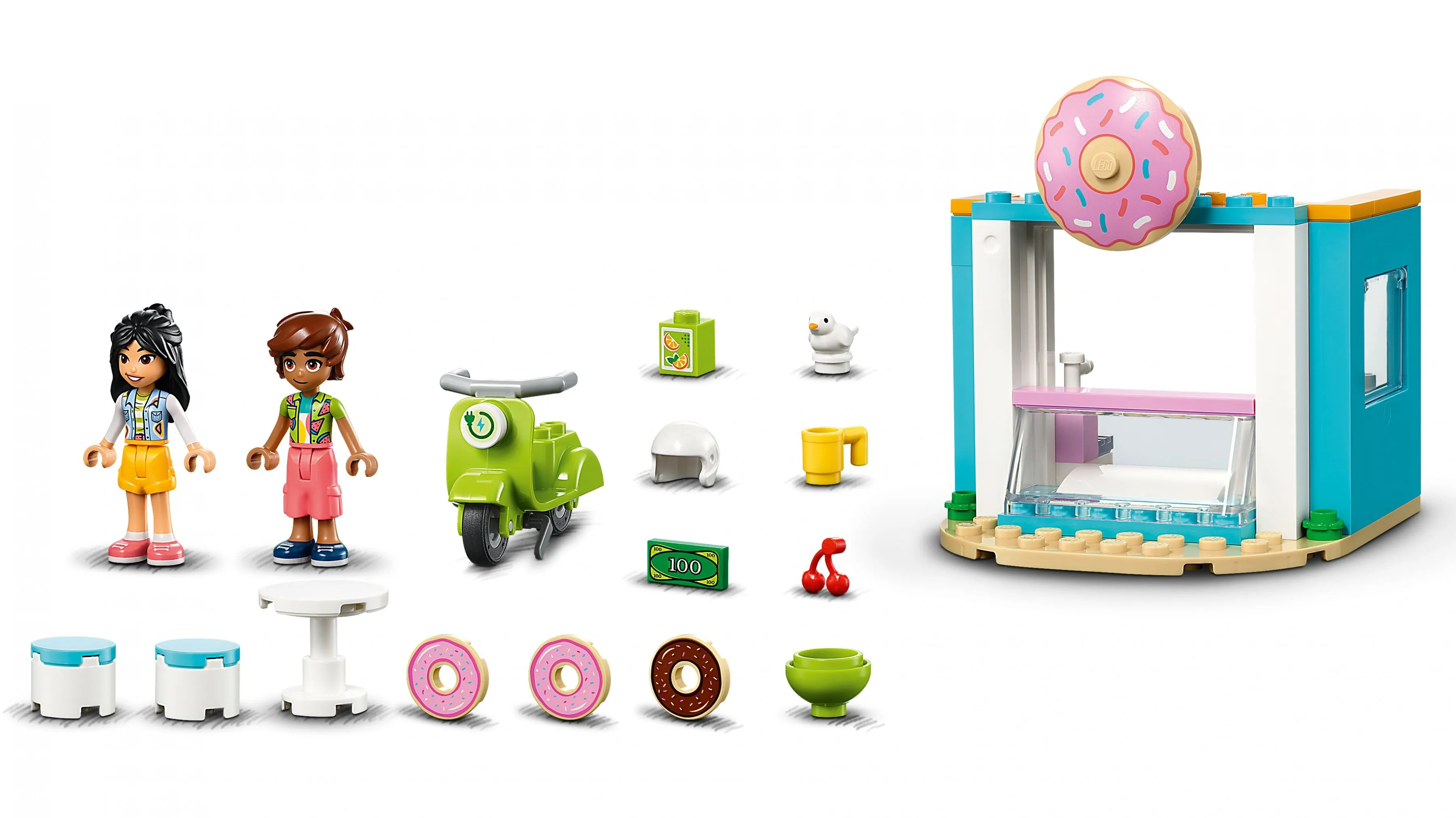 Набор Магазин пончиков из серии LEGO Friends предлагает множество деталей и аксессуаров, которые создают атмосферу настоящего кафе. Внутри есть прилавок с пончиками, касса и уютная зона для посетителей, что делает игру ещё более захватывающей.