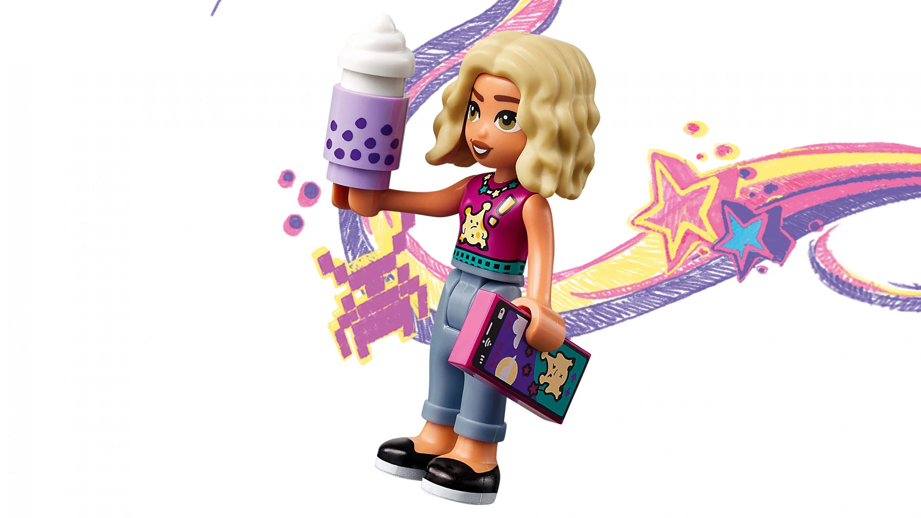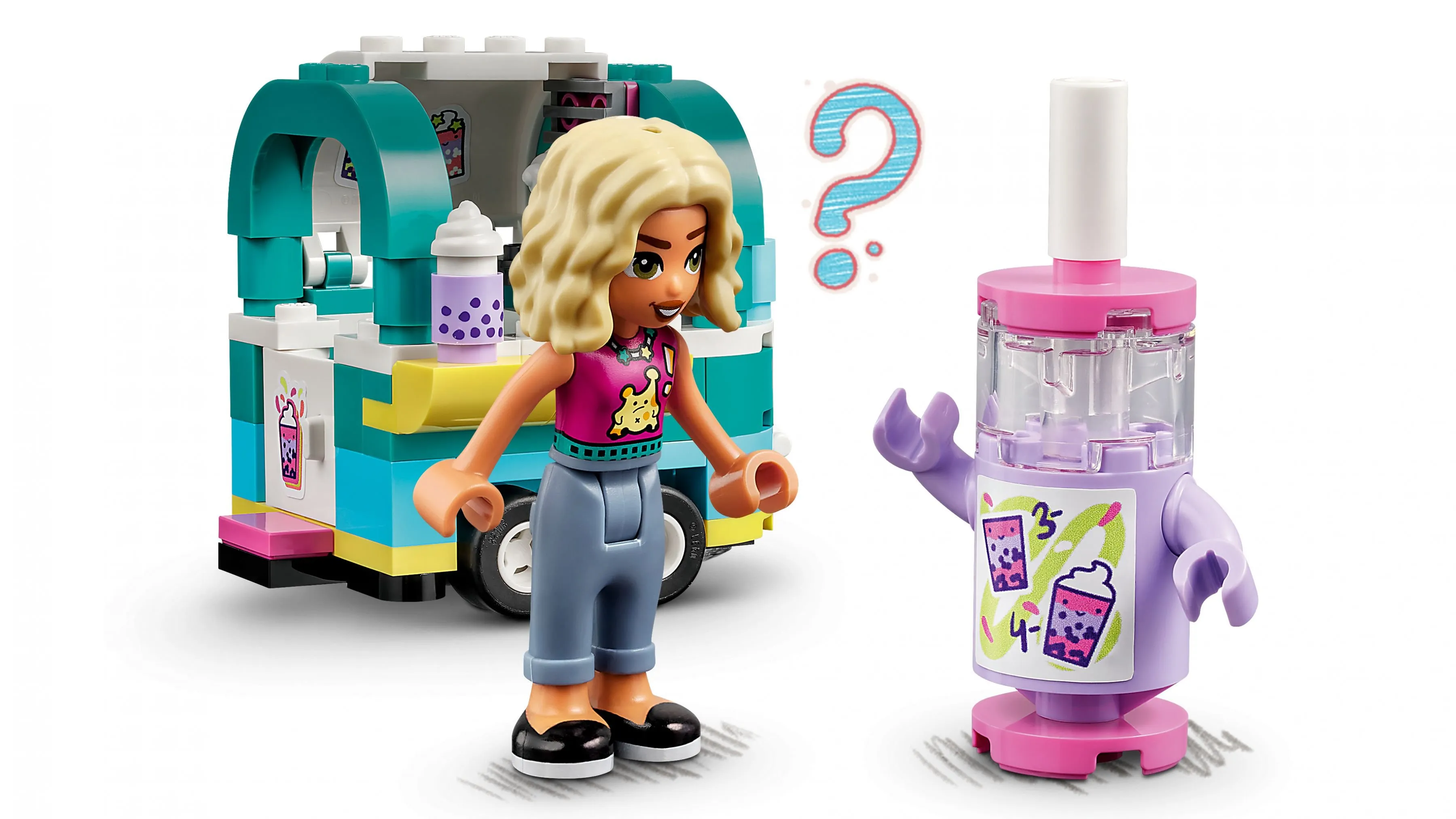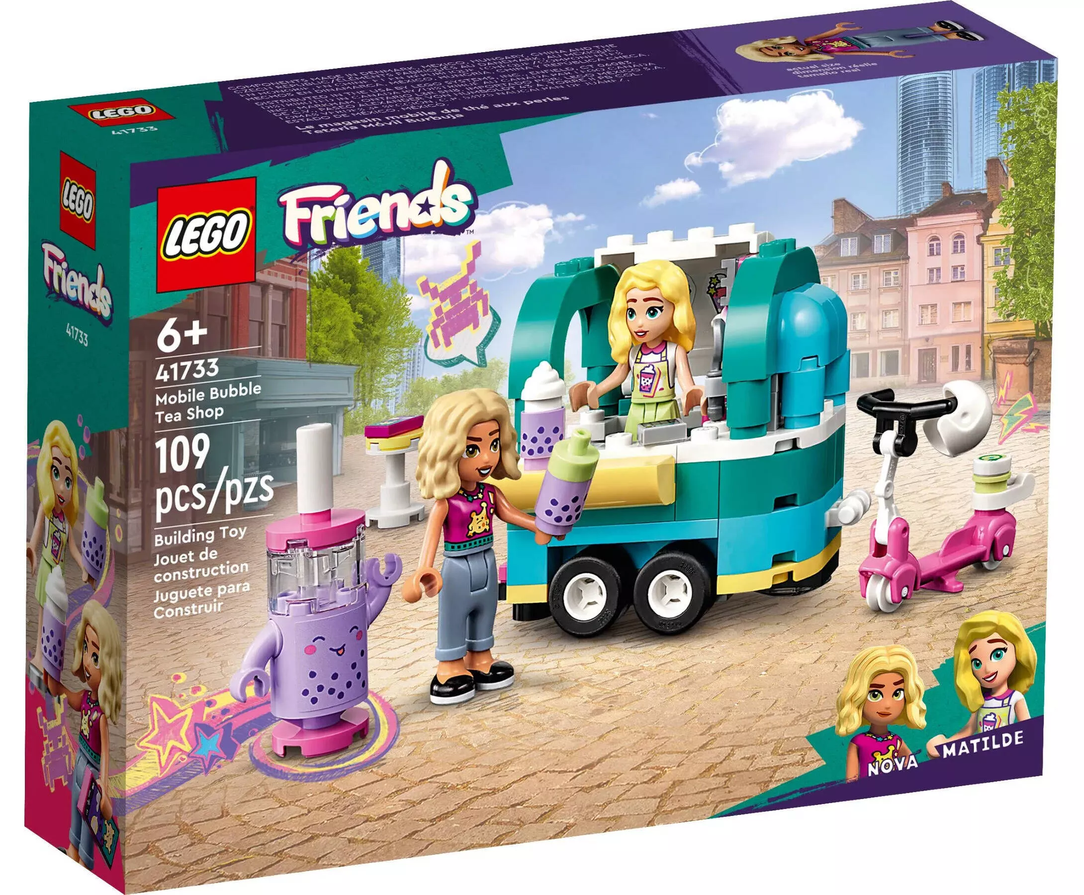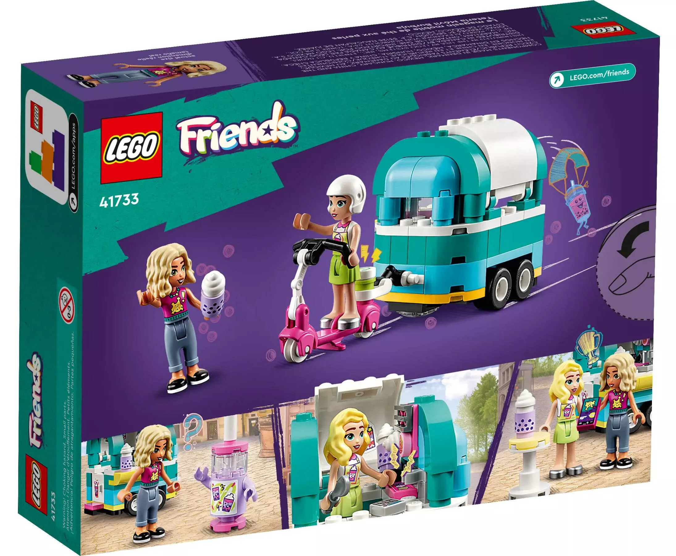 LEGO Friends 41733 Мобильный магазин Бабл Ти – это яркий и увлекательный набор, который позволяет детям создать модный передвижной киоск, где подаётся популярный напиток бабл ти (bubble tea). Этот красочный и весёлый набор погружает детей в атмосферу уличной торговли и креативности, позволяя разыгрывать сцены обслуживания клиентов, продажи напитков и прогулок по Heartlake City.