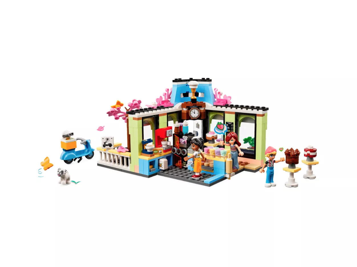 • В набор входят кафе, 3 минифигурки (Пейсли, Олли, Беатрис) и собака, аксессуары с десертами, а также самокат.