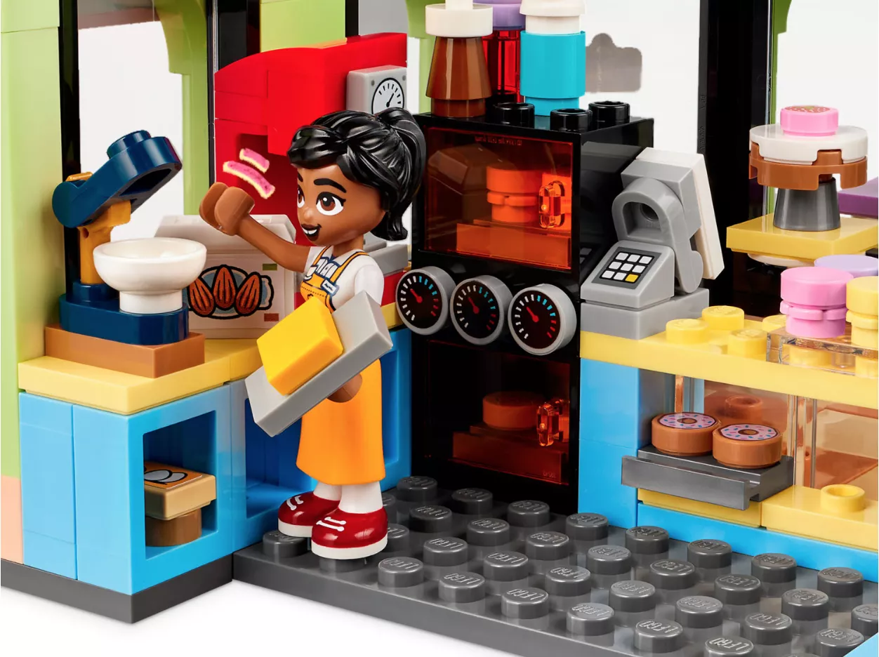 • Множество аксессуаров. В этот набор LEGO входят такие аксессуары, как кофемашина, миндальное печенье, круассан, самокат, шлем, коробка для заказов, миска для собаки, трофей и метла для веселой игры.
