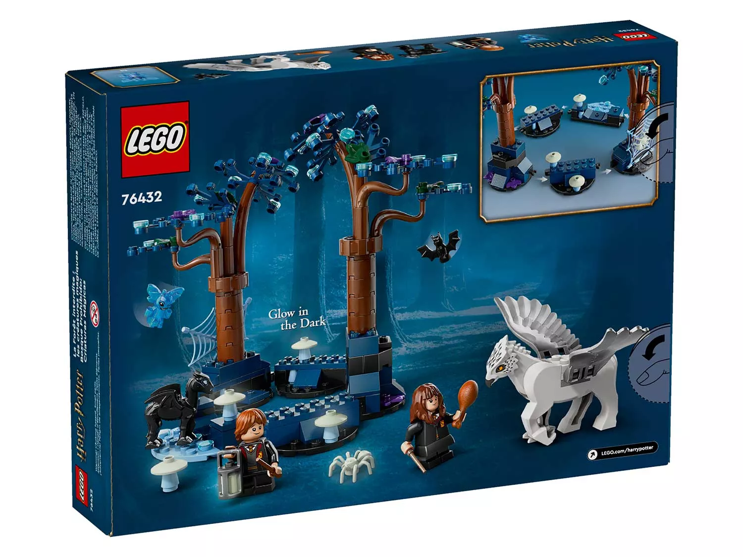 Постройте Запретный лес из кубиков LEGO, полный волшебных существ, с помощью этого фэнтезийного игрового набора для детей LEGO Harry Potter «Запретный лес: Волшебные существа» (76432). В нем представлены деревья с элементами листьев ночных оттенков, а также светящийся в темноте игрушечный паук и 4 светящихся в темноте гриба, которые создают волшебную атмосферу. В набор входят две минифигурки LEGO — Рона Уизли и Гермионы Грейнджер, а также игрушечная фигурка Клюва, фигурка малыша Фестрала и фигурка Корнуоллского Пикси для ролевых игр. Дети также могут переставлять модули этого настраиваемого игрушечного набора, создавая разнообразные сценки.