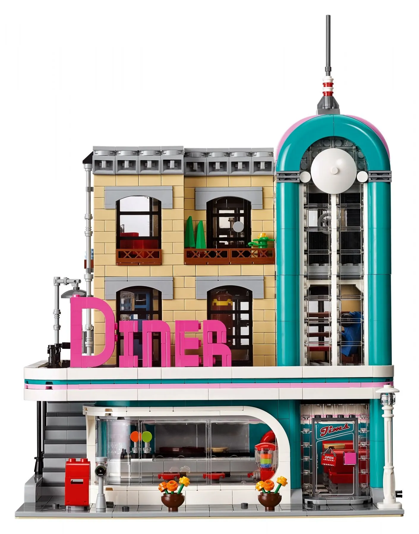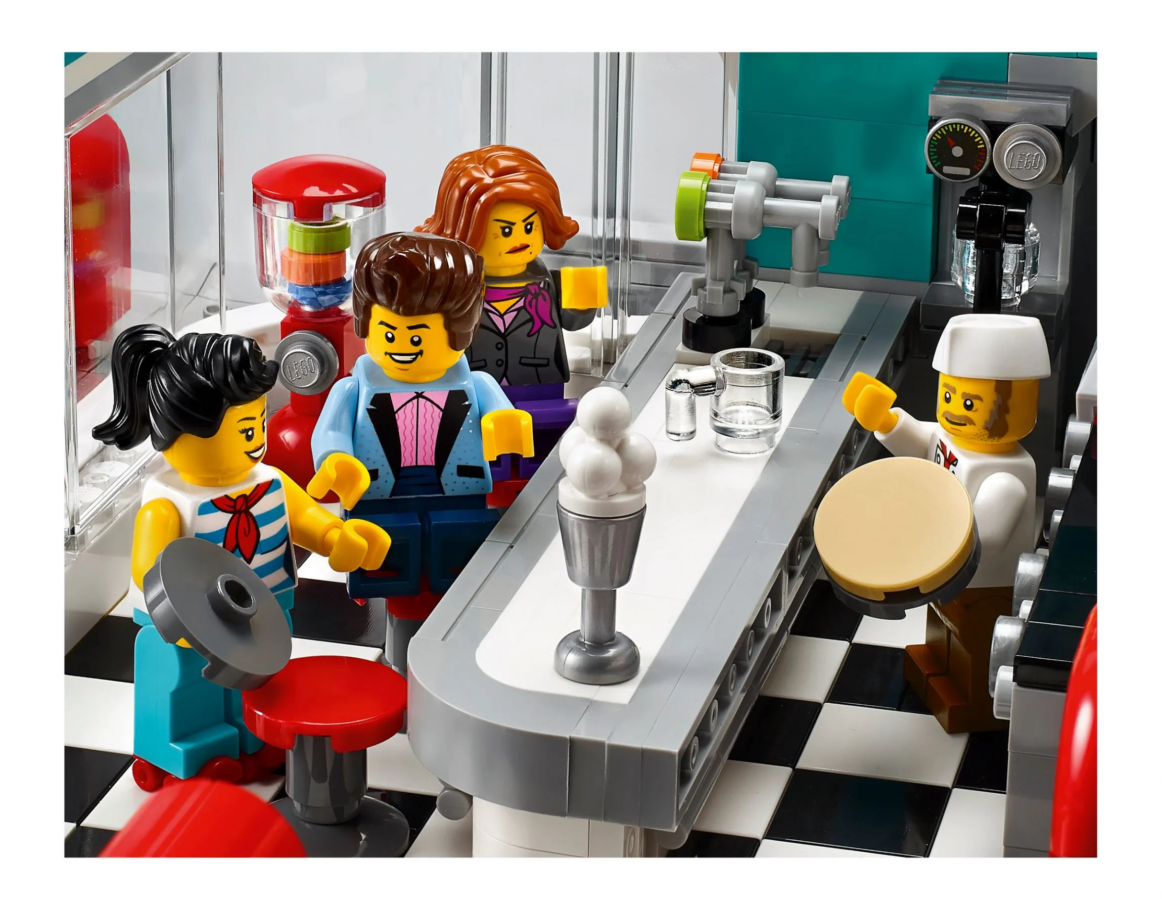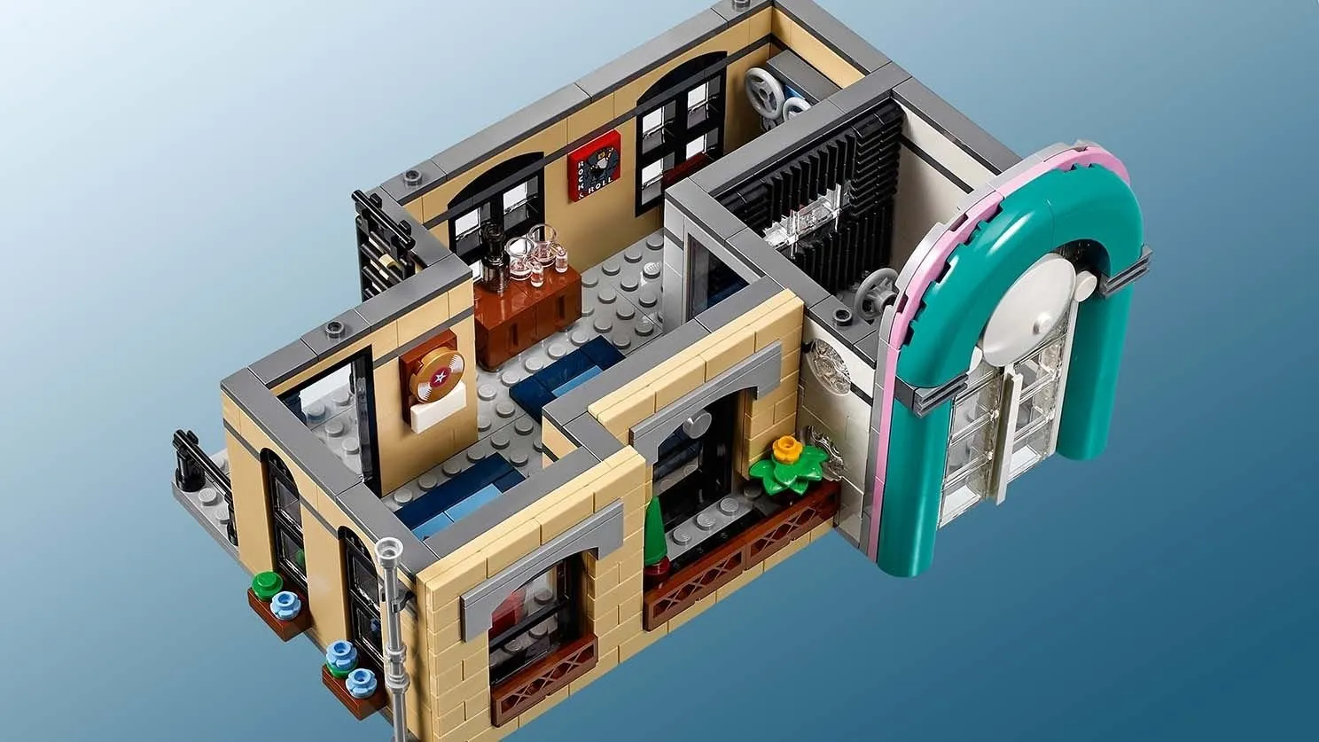 В наборе Ресторанчик в центре вы найдете множество увлекательных элементов и интересных функций. Строительство фасада ресторана с яркой вывеской, барной стойкой и музыкальным автоматом позволит вам погрузиться в атмосферу 50-х годов. Детализированный интерьер включает в себя кухню с плитой и вытяжкой, уютные столики и барные стулья, где посетители могут насладиться обедом.