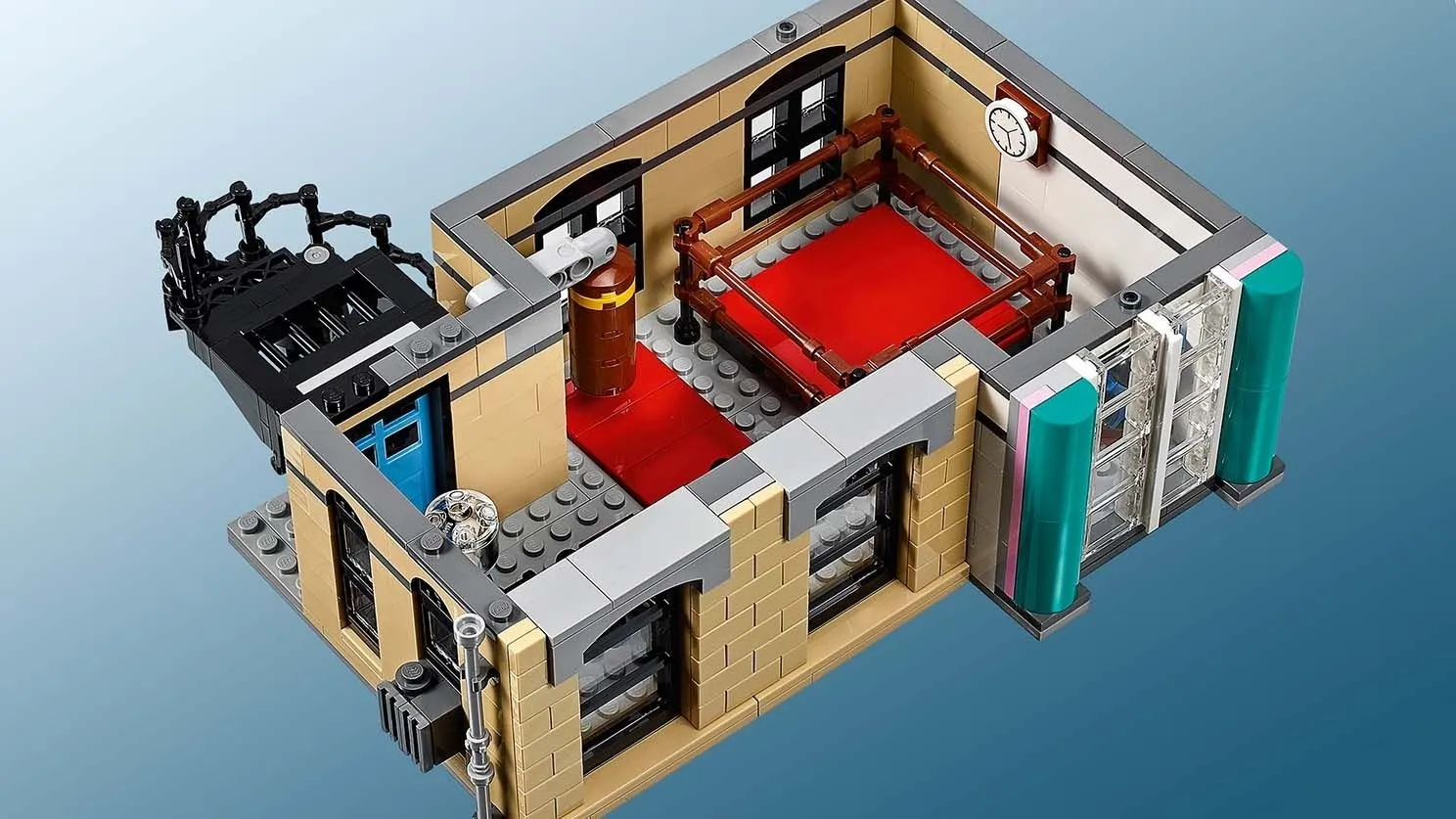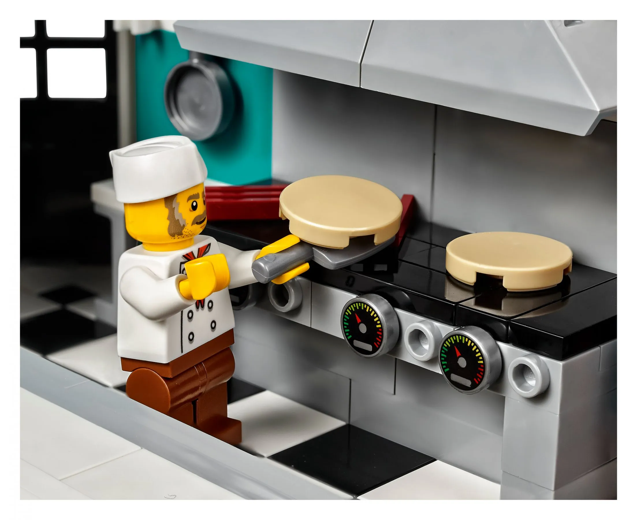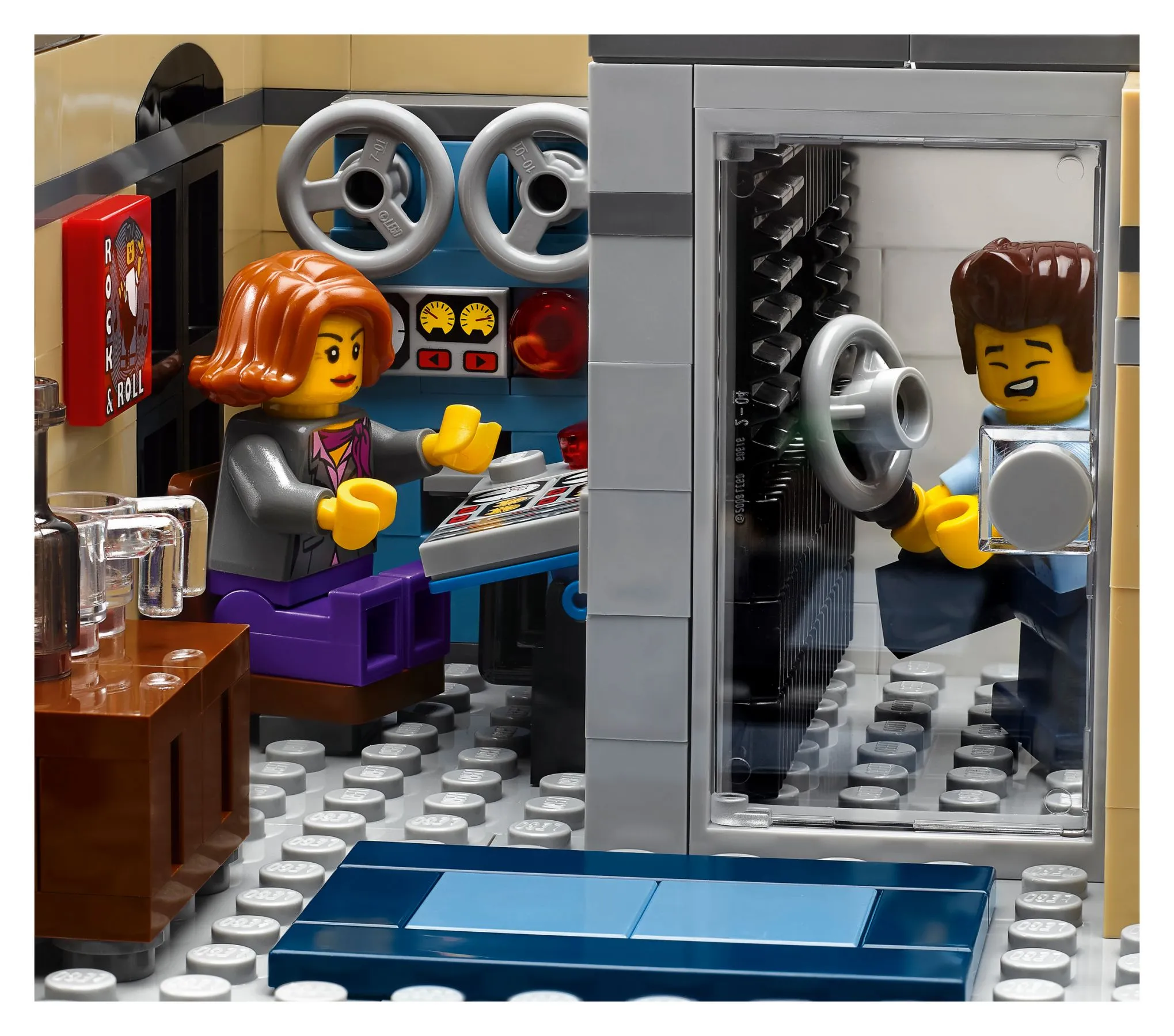В наборе Ресторанчик в центре вы найдете множество увлекательных элементов и интересных функций. Строительство фасада ресторана с яркой вывеской, барной стойкой и музыкальным автоматом позволит вам погрузиться в атмосферу 50-х годов. Детализированный интерьер включает в себя кухню с плитой и вытяжкой, уютные столики и барные стулья, где посетители могут насладиться обедом.