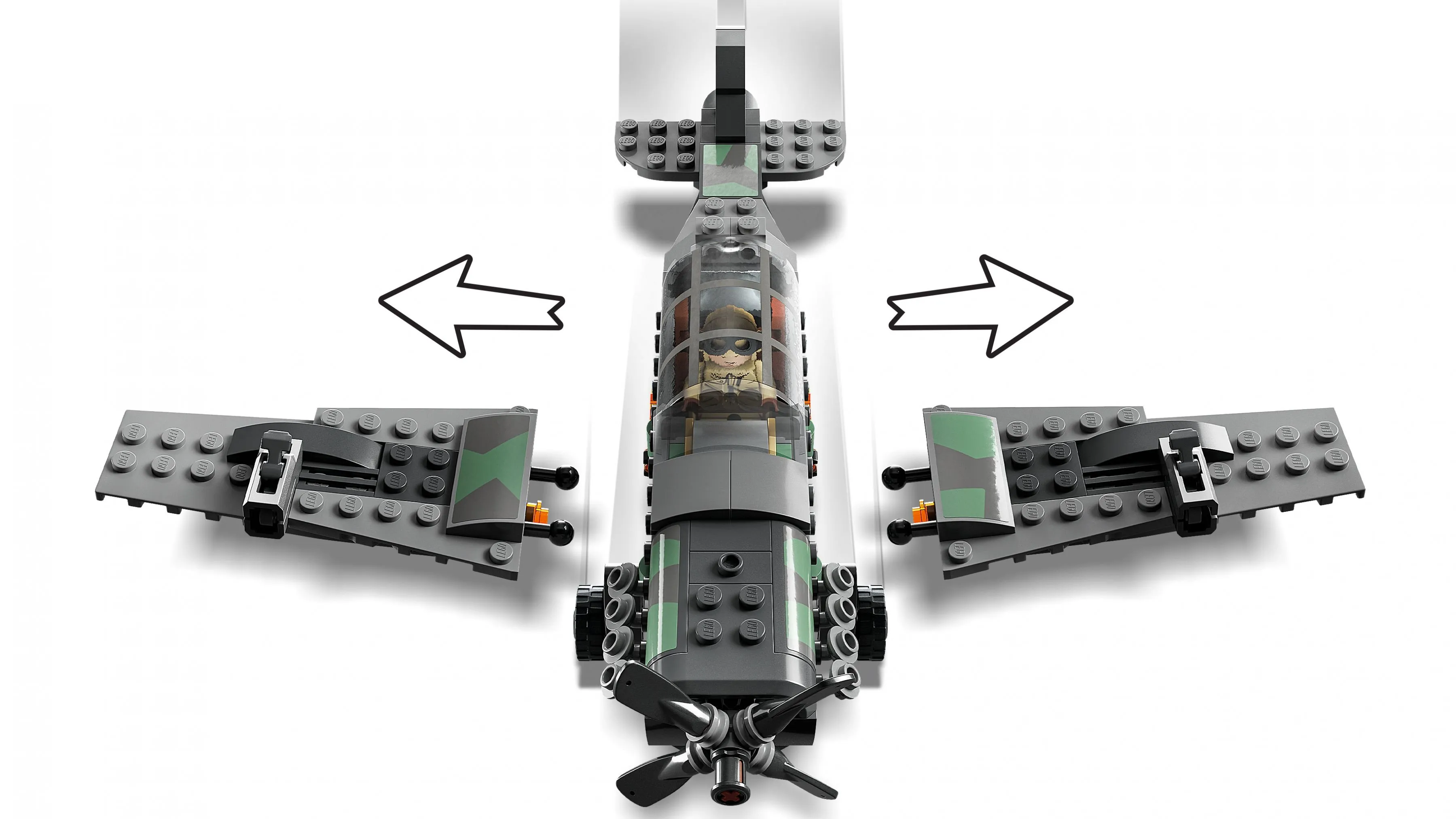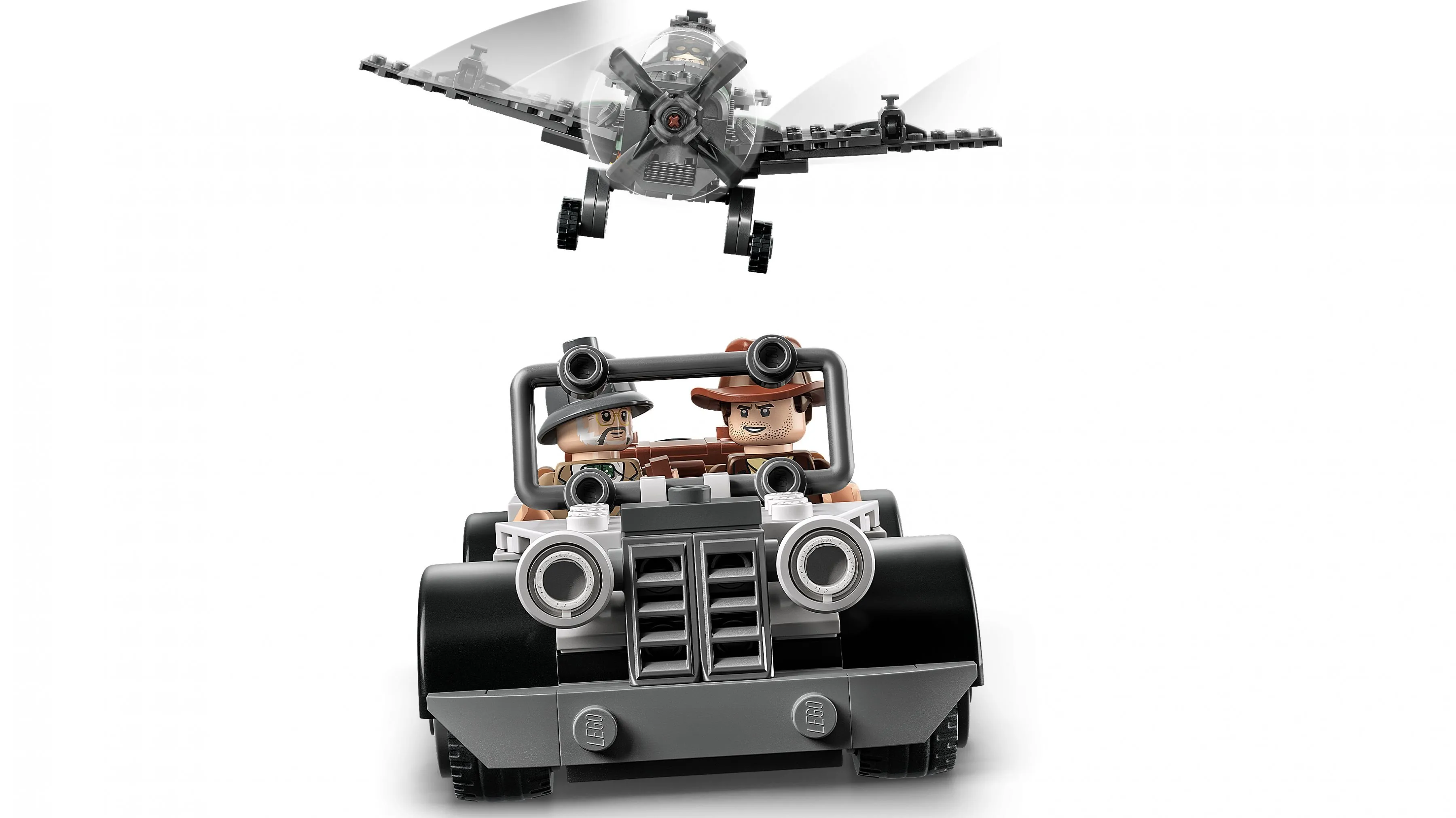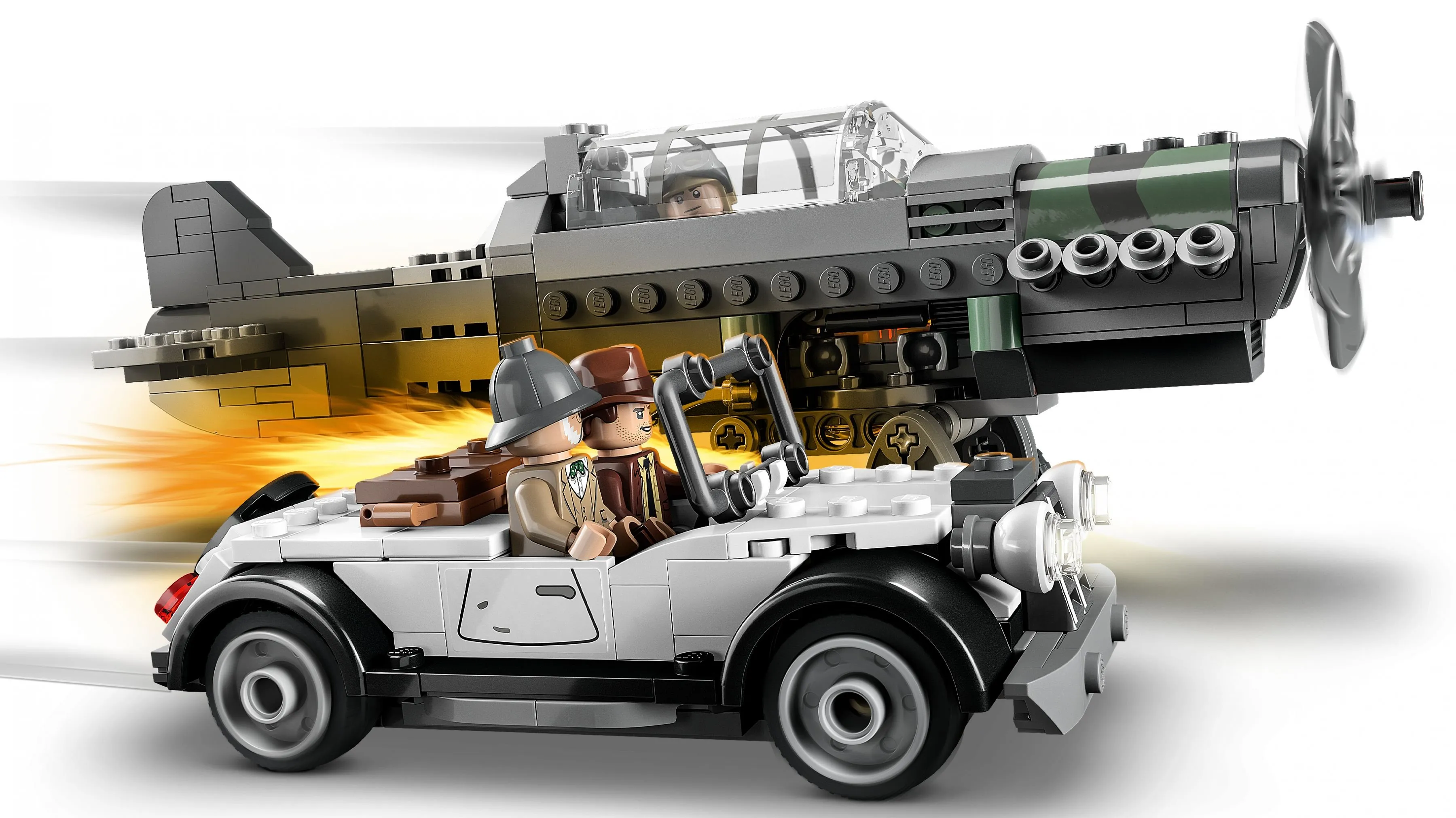 Основной элемент набора – это сборная модель немецкого истребителя, который принимает участие в воздушной схватке с Индианой Джонсом. Детализированная модель самолета имеет поворотные пропеллеры, съемные крылья и место для минифигурки пилота. Набор также включает автомобиль, на котором Индиана Джонс и его отец пытаются скрыться от преследования. Автомобиль оформлен в ретро-стиле, что добавляет набору атмосферности и помогает погружаться в сцену фильма.