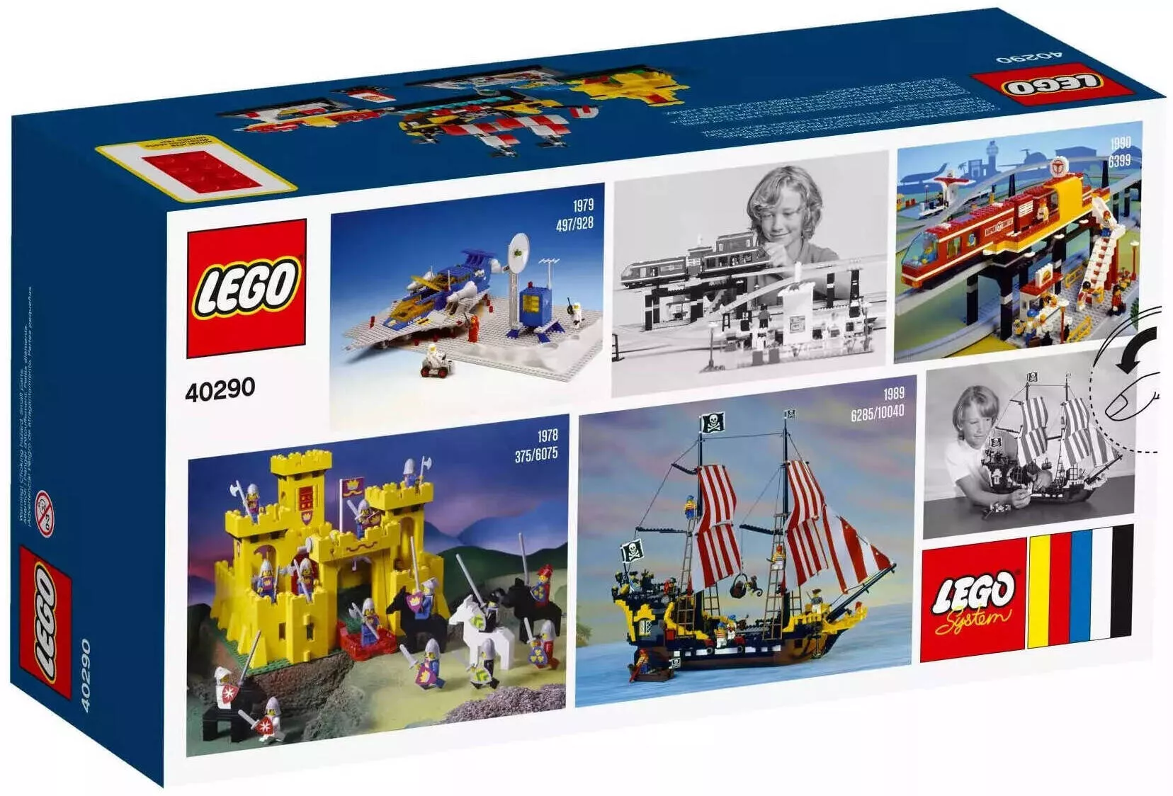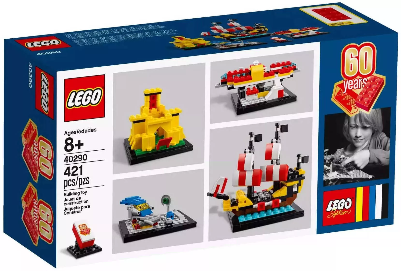 В наборе LEGO Коллекционные наборы 40290 Набор к 60-летнему юбилею кубика LEGO представлены модели четырех классических наборов LEGO, выпущенных в разные десятилетия. Это отличный способ не только отметить знаменательное событие, но и познакомиться с эволюцией конструкций LEGO на протяжении десятилетий.