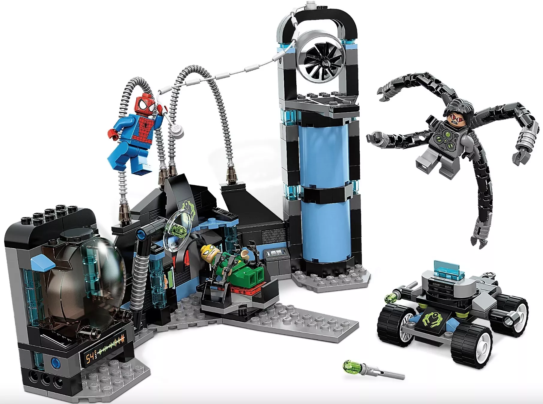 Но на помощь другу приходит отважный Человек-паук. Он проникает в лаборатории через вентиляционное отверстие и пытается обездвижить Осьминога с помощью своей паутины. Но злодей скидывает свой многорукий костюм и удирает на автомобиле, снабжённом двумя ракетницами.