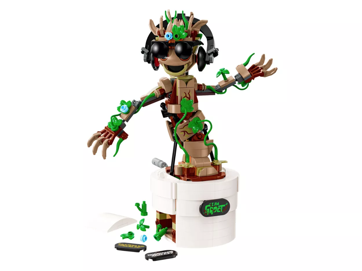 • Танцующий супергерой: в набор входит сборная фигурка Грута в цветочном горшке, 3 разные таблички с именем, которые можно прикрепить к горшку, а также аксессуары, в том числе наушники, солнцезащитные очки и дополнительные листья.