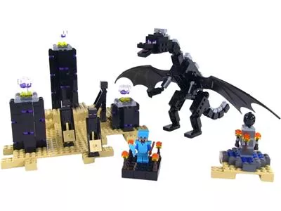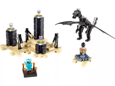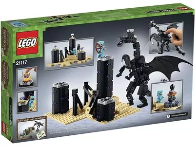 Betreten des Endes auf eigene Gefahr! Ziehe deine Diamantrüstung an, setze deinen Helm auf, greif dir deine Ausrüstung und betrete diese zeitlose Dimension, die unter einem sternlosen Himmel durchs Nichts gleitet. Spüre die gefährlichen Endermen auf, die in der Dunkelheit hausen. Wehre den Feind mit deinem Diamantschwert und deinem Bogen ab. Nimm alle deine Kräfte zusammen und stelle dich dem mächtigen Enderdrachen, der über den regenerierenden Ender-Kristallen schwebt. Wenn du den Drachen besiegt hast, sammle die Dracheneier ein und erzeuge mit ihnen ein Ausgangsportal. Mach dich bereit für das ultimative Duell! Baue weitere LEGO Minecraft Kreationen mit diesem Set. Enthält eine Steve Minifigur mit Ausrüstung und Zubehör sowie 3 Endermen und den Enderdrachen.