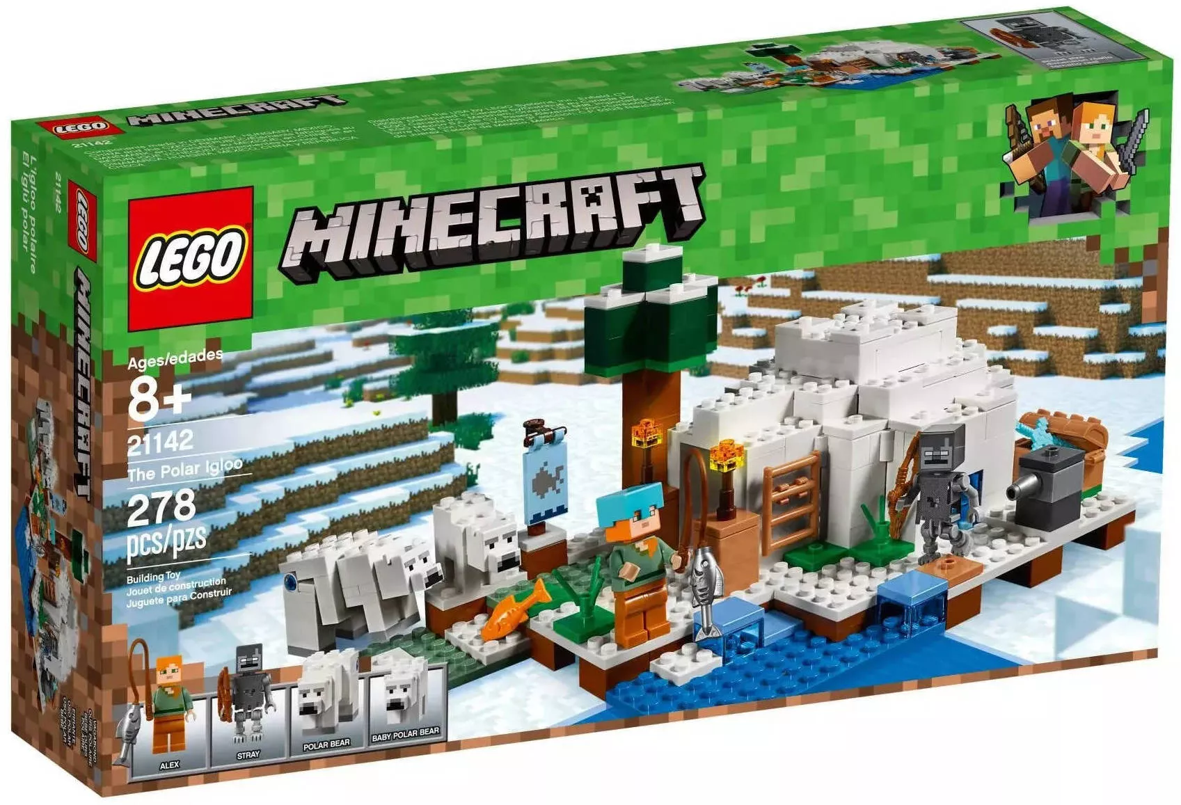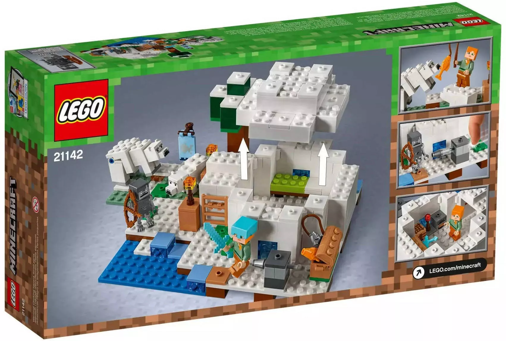 В набор входит 278 деталей, из которых можно собрать иглу со съёмной крышей для удобного доступа к интерьеру. Внутри вы найдете печь, кровать и стол для крафта. Снаружи расположена небольшая ледяная площадка с ловушкой для зомби и уникальной функцией стрелкового механизма.