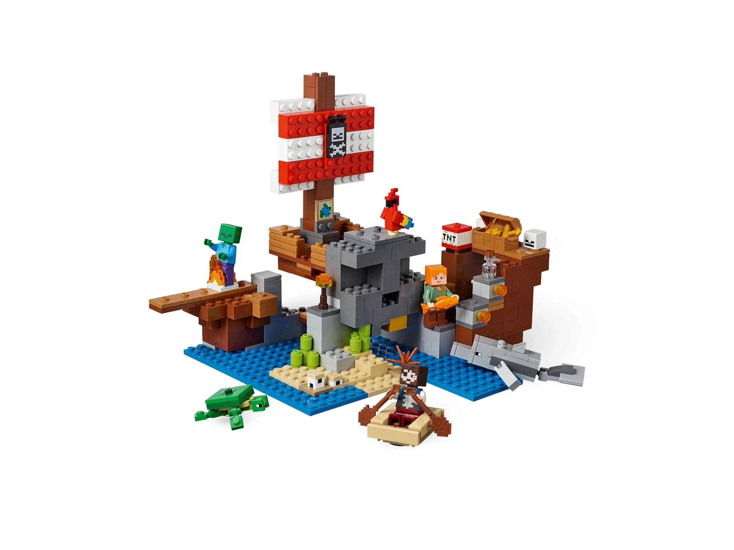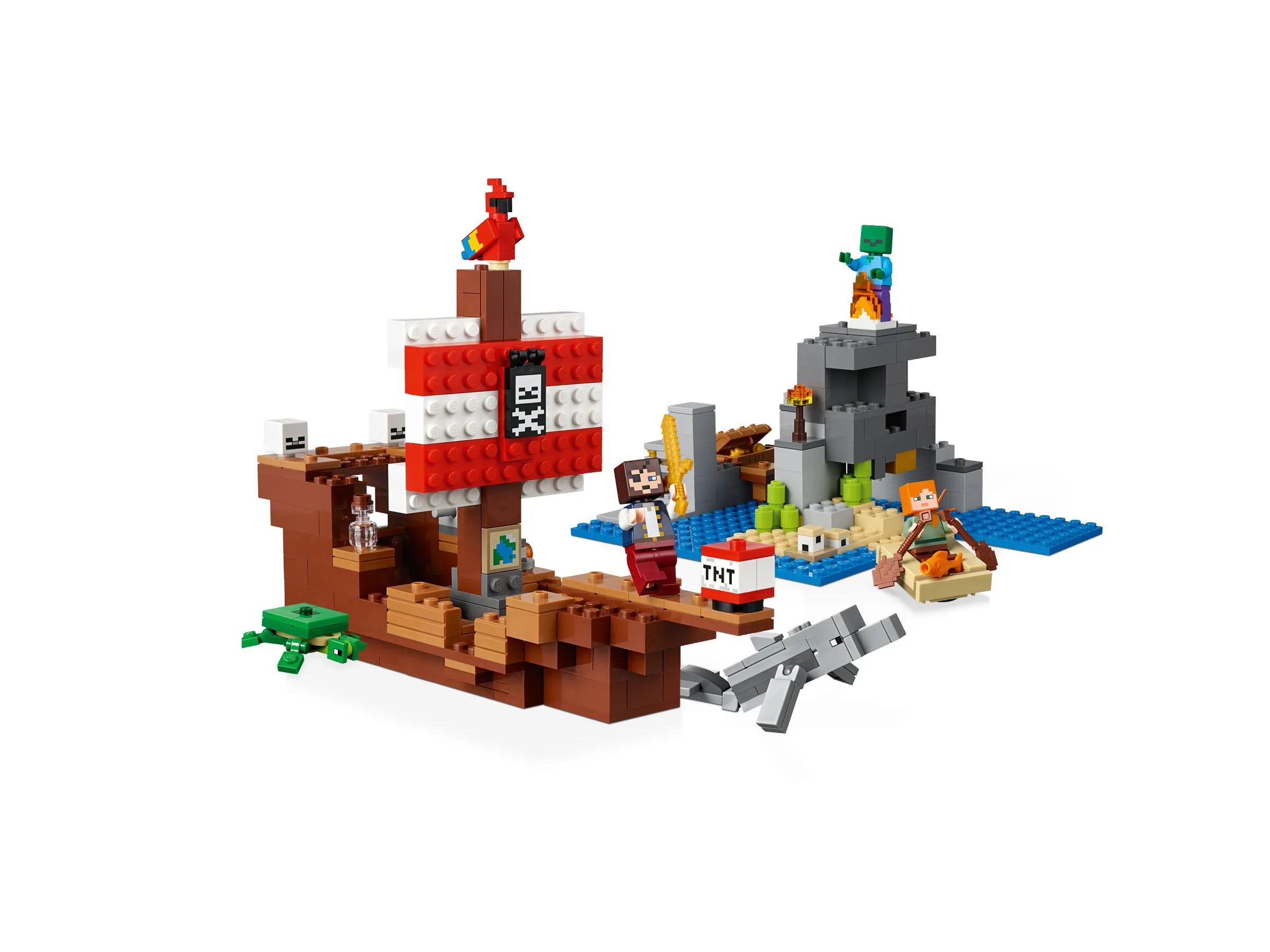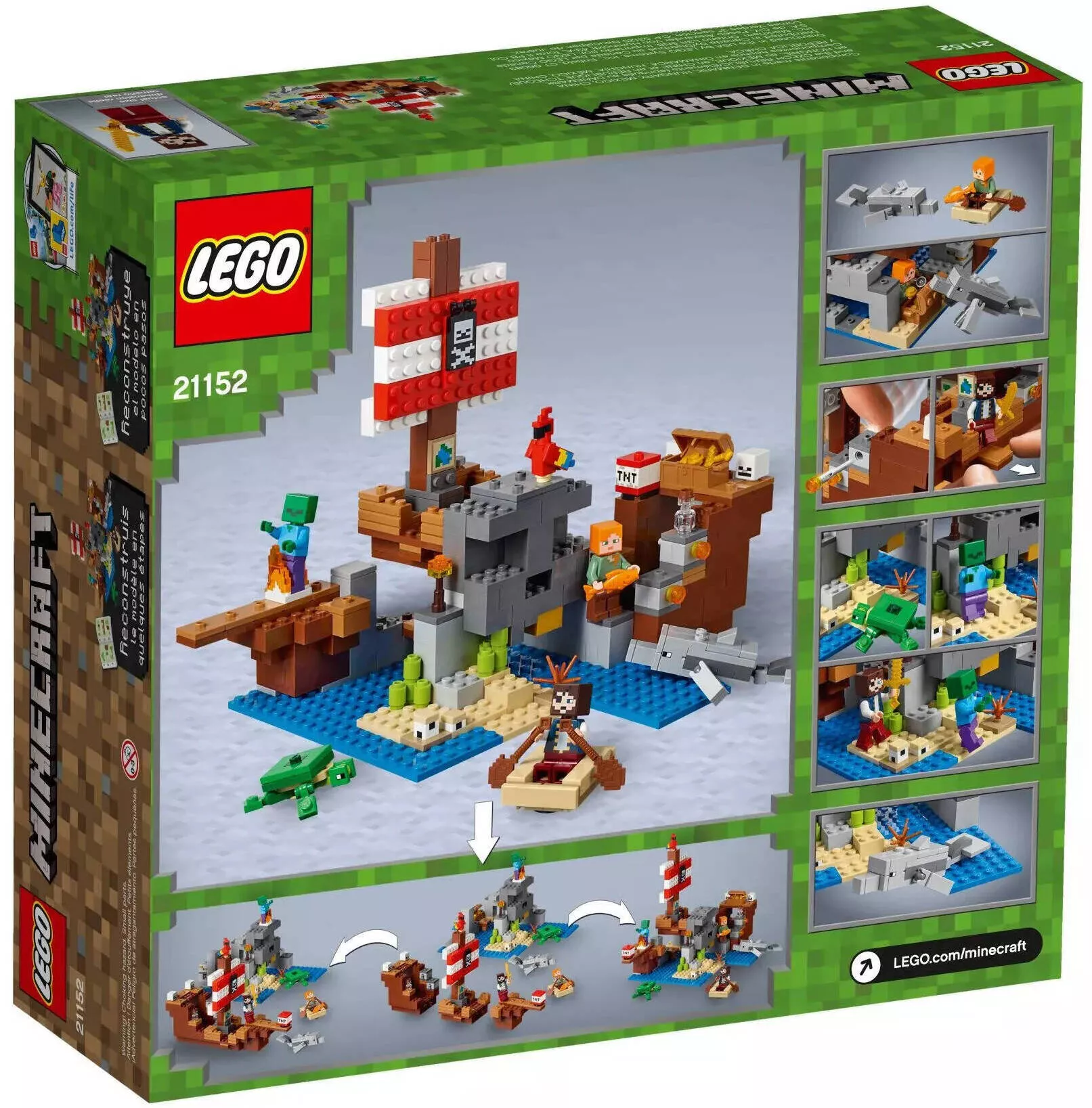 Набор LEGO Minecraft 21152 Приключения на пиратском корабле включает в себя 386 деталей и предлагает множество возможностей для игры и воображения. Основные элементы этого набора: