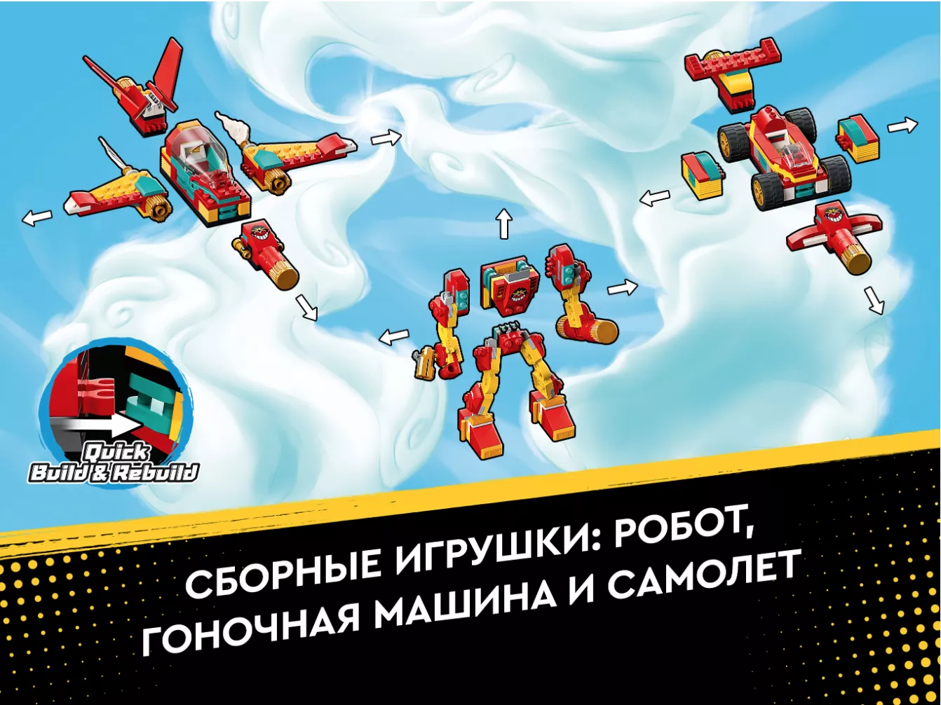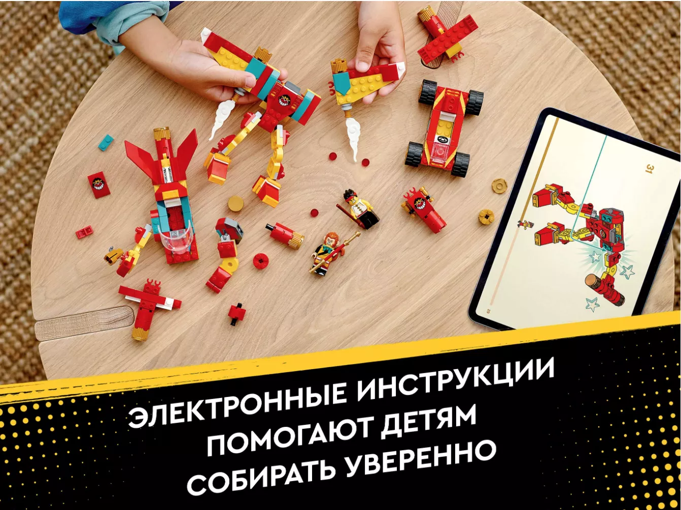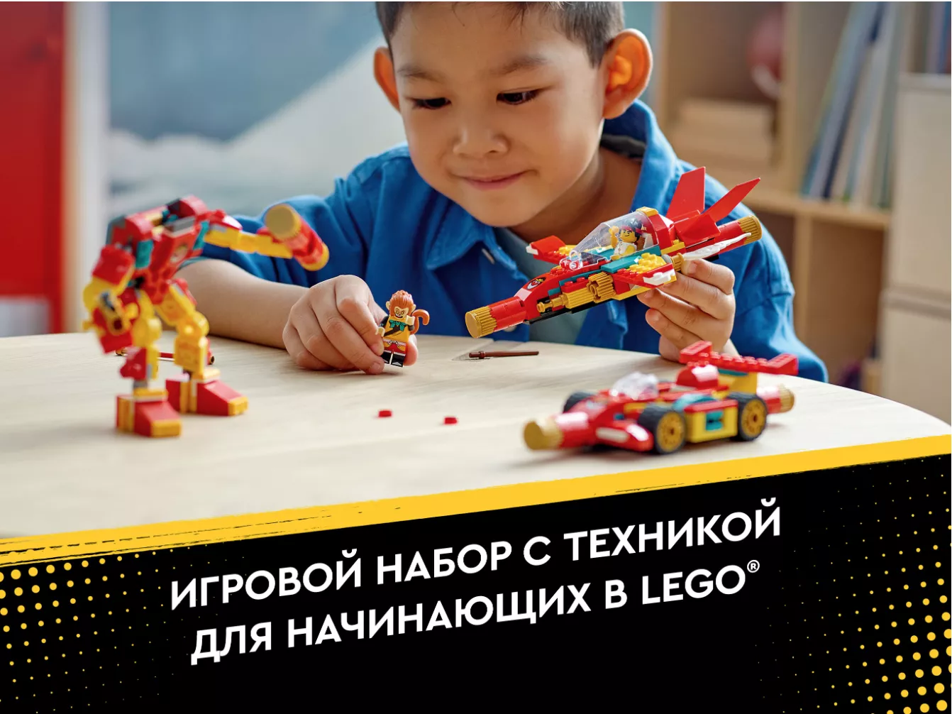 Присоединяйтесь к Манки Киду на уроках Царя Обезьян о том, как создавать волшебные творения с помощью Золотого посоха! Научитесь собирать удивительного робота, самолёт и гоночный автомобиль, а потом всё перемешайте и придумайте собственную уникальную технику. Автомобиль с руками робота? Да! Летающий робот с крыльями на реактивной тяге? Круто! Что бы вам ни понадобилось для очередного эпического задания Манки Кида, вы сможете это собрать!