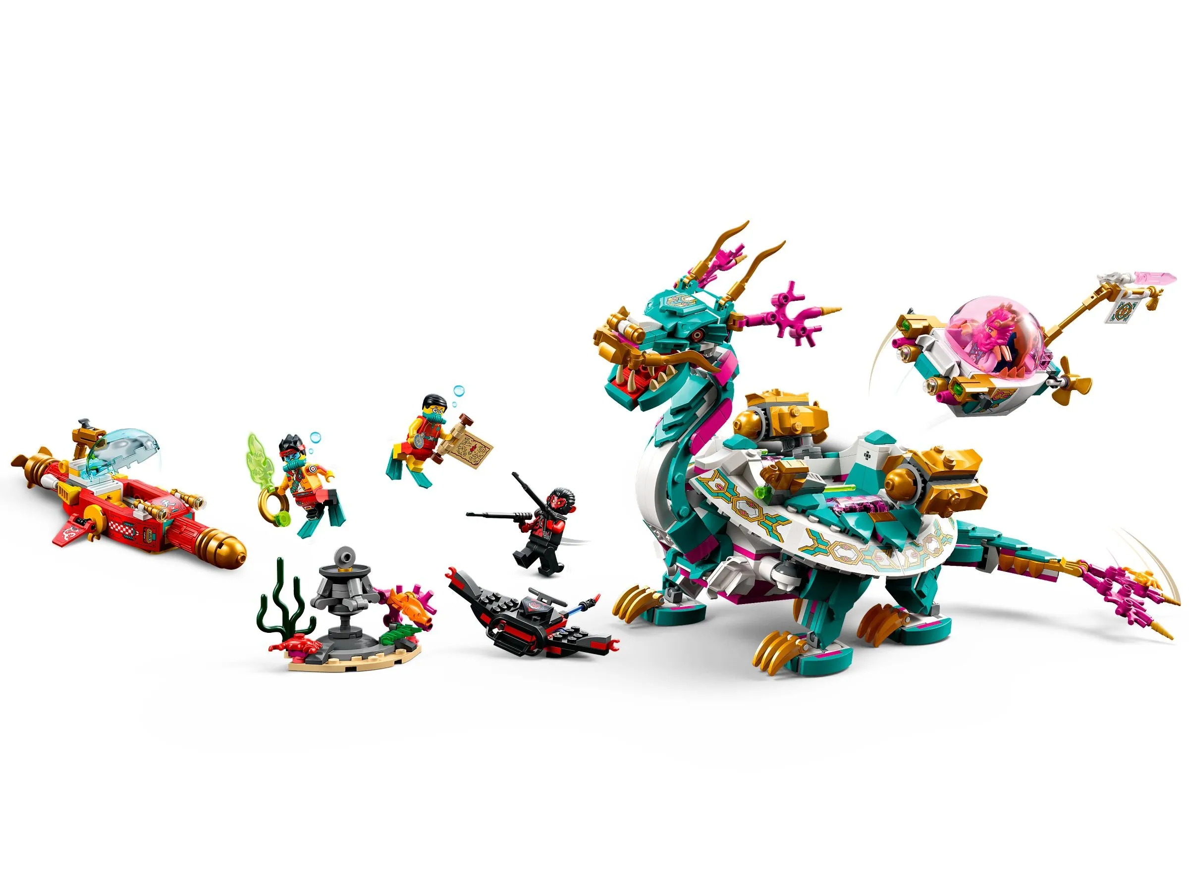 Модель Дракона Востока впечатляет своим дизайном, сочетая классические мифические элементы с футуристическими деталями. Подвижные части, такие как крылья, хвост и ноги, делают его идеальным для динамичных игр, позволяя детям менять позы дракона и разыгрывать эпические сражения. В комплекте также есть минифигурки героев и злодеев, которые помогают создать полноценный игровой мир, вдохновлённый легендами о Царе Обезьян.