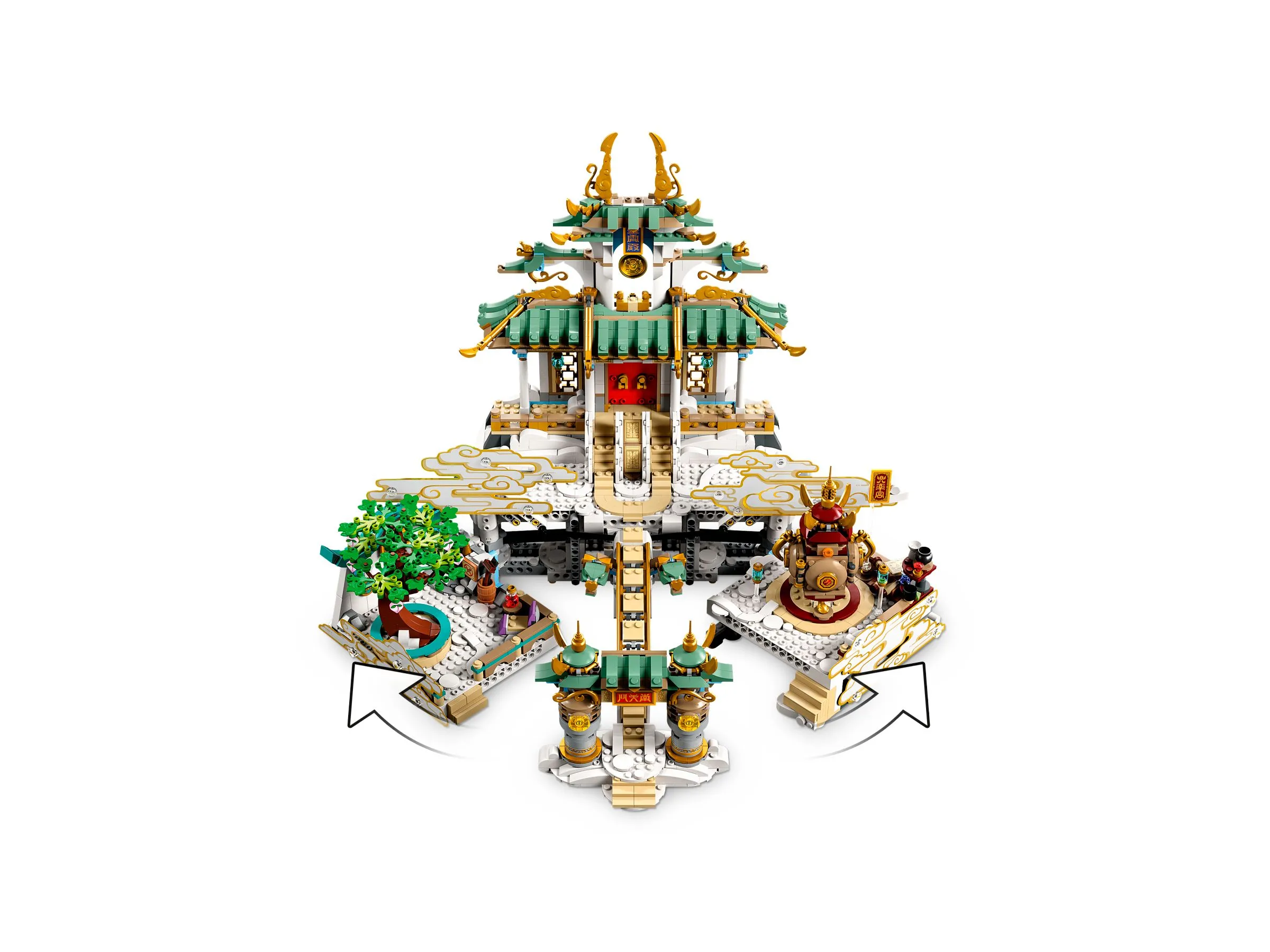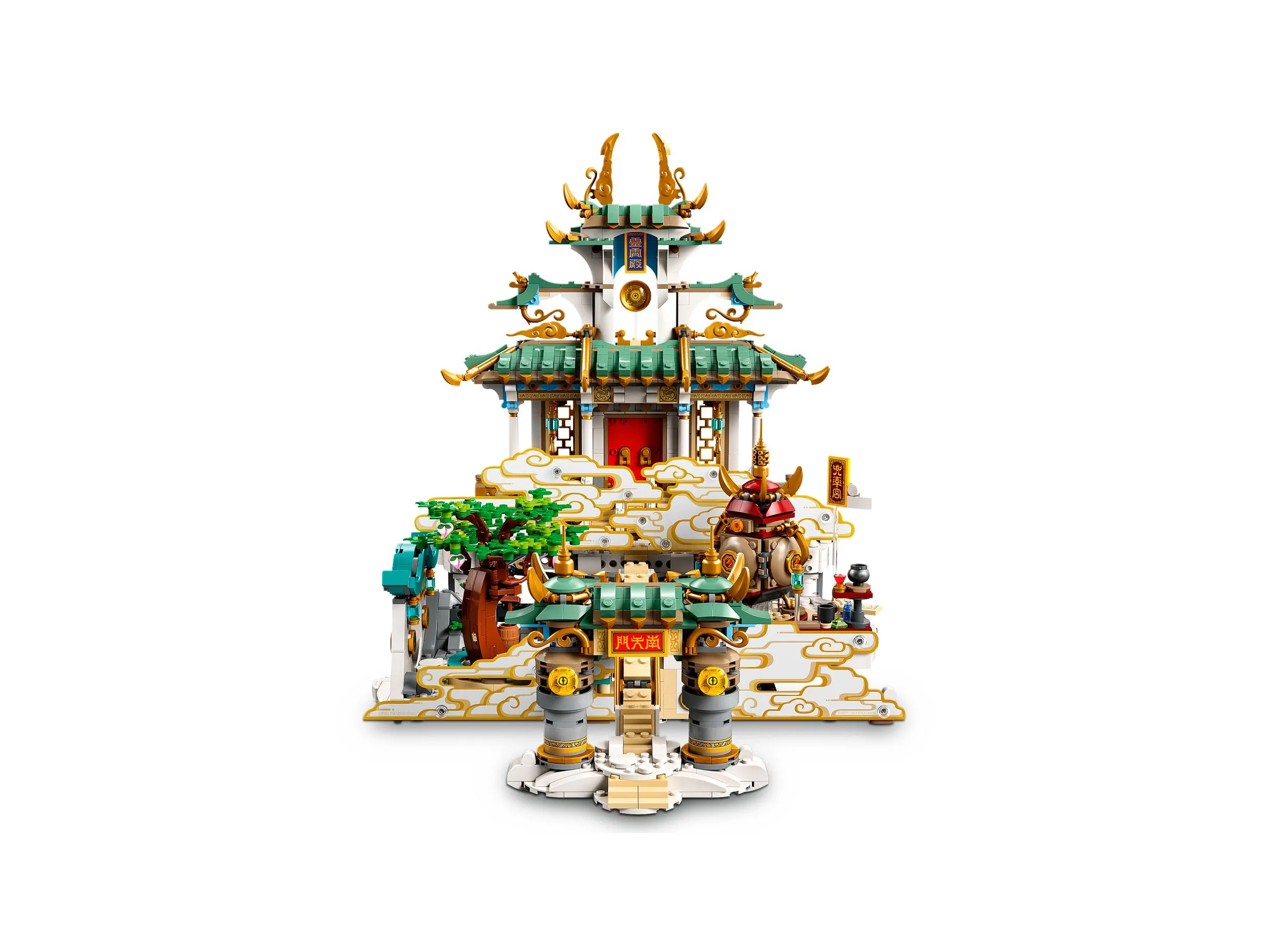 Набор содержит впечатляющие здания Небесных Царств с красивыми архитектурными элементами, разнообразные минифигурки героев и злодеев, а также множество аксессуаров для сюжетной игры. Яркие и детализированные здания создают атмосферу настоящего мифического мира, где происходят захватывающие сражения между силами добра и зла.