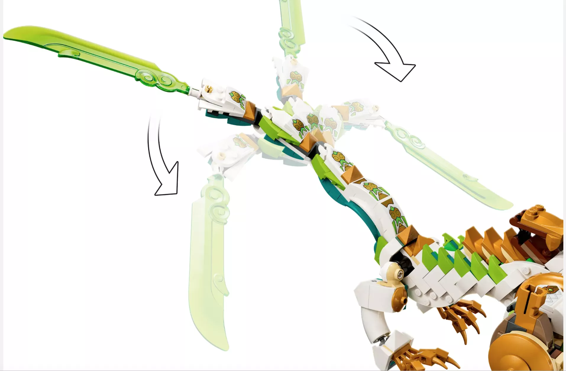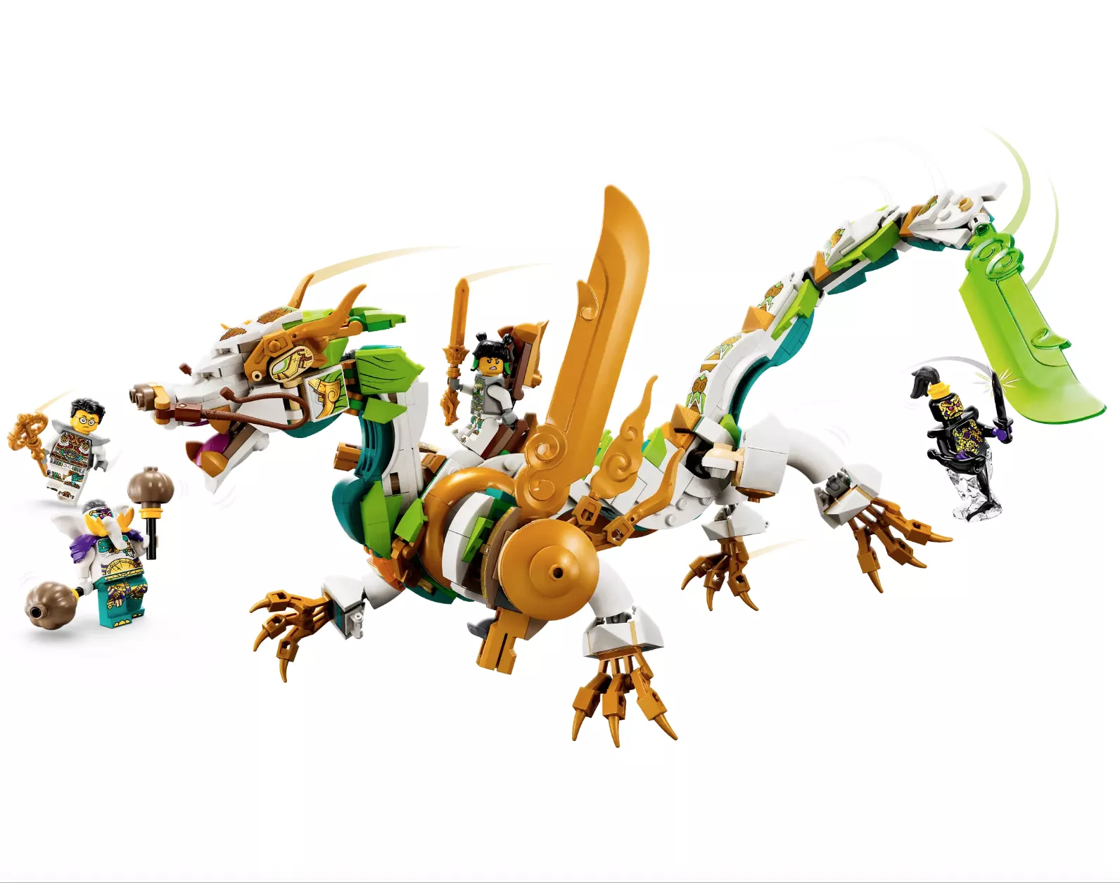 - Подвижный дракон – создайте легендарного стража Мэй из 4-го сезона телешоу LEGO Monkie Kid с подвижной челюстью, головой и ногами, подвижным хвостом с лезвием, крыльями-шутерами и седлом.