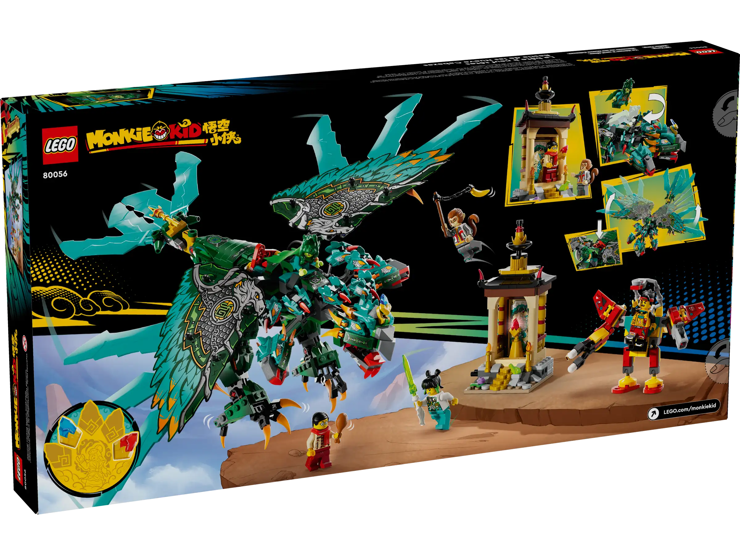 - Забавный набор для строительства – этот коллекционный набор LEGO Monkie Kid включает в себя подвижную летающую птицу-зверя, а также 5 минифигурок, небольшой храм и мини-робот, а также 2 цветных камня красного и синего цветов.