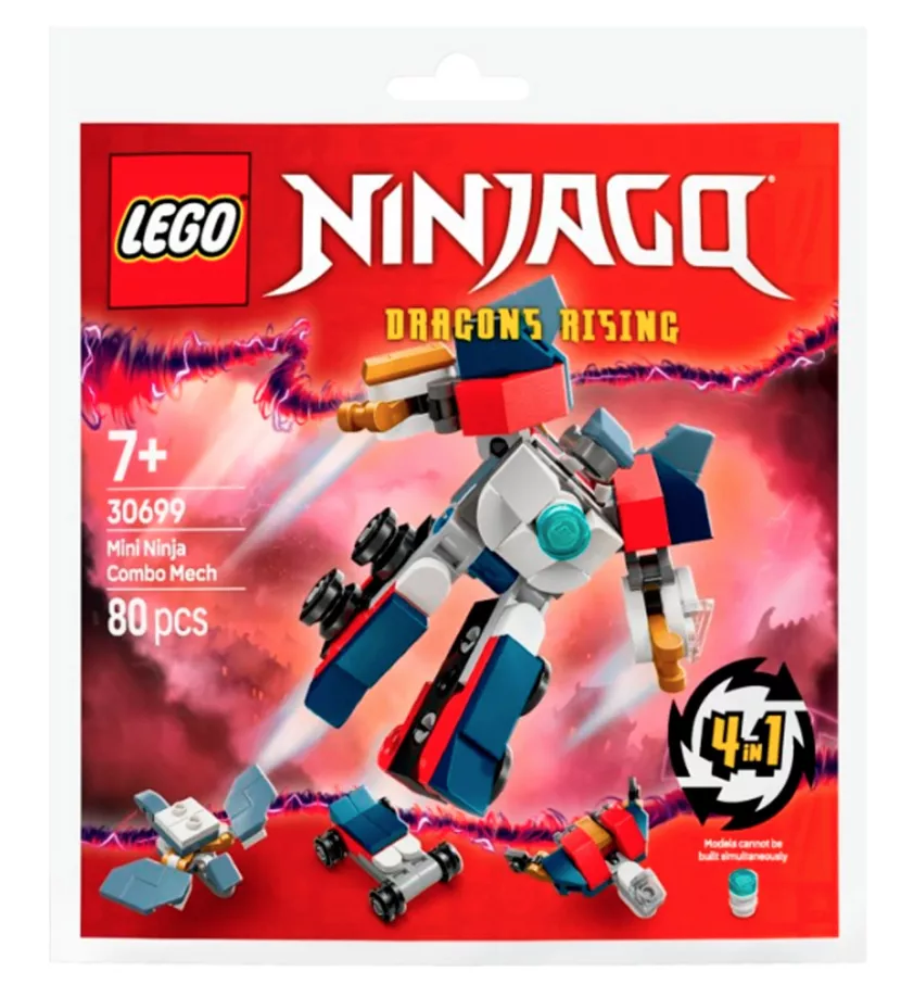 Дайте волю своему внутреннему ниндзя с помощью мини-набора LEGO NINJAGO «Мини-комбо-робот Ниндзя» (30699), который позволяет из одного набора деталей собрать подвижную фигурку робота с крыльями, а затем перестроить ее в дракона Райю, самолет и автомобиль.