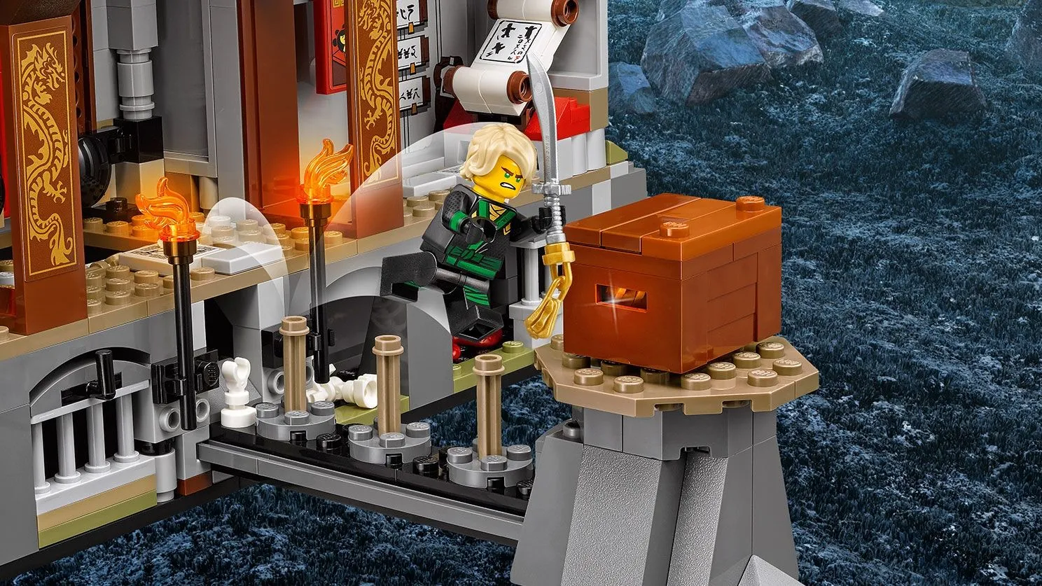 Этот уникальный набор представляет собой масштабную модель храма, выполненную из серого камня на скалистом фундаменте с элементами зелёной растительности, имитирующей мох. Конструкция храма открытая, обеспечивая широкие возможности для игры и исследования. Фасад украшен колоннами и декоративными решётками, а центральные ворота украшены серебристыми петлями и уникальным орнаментом.