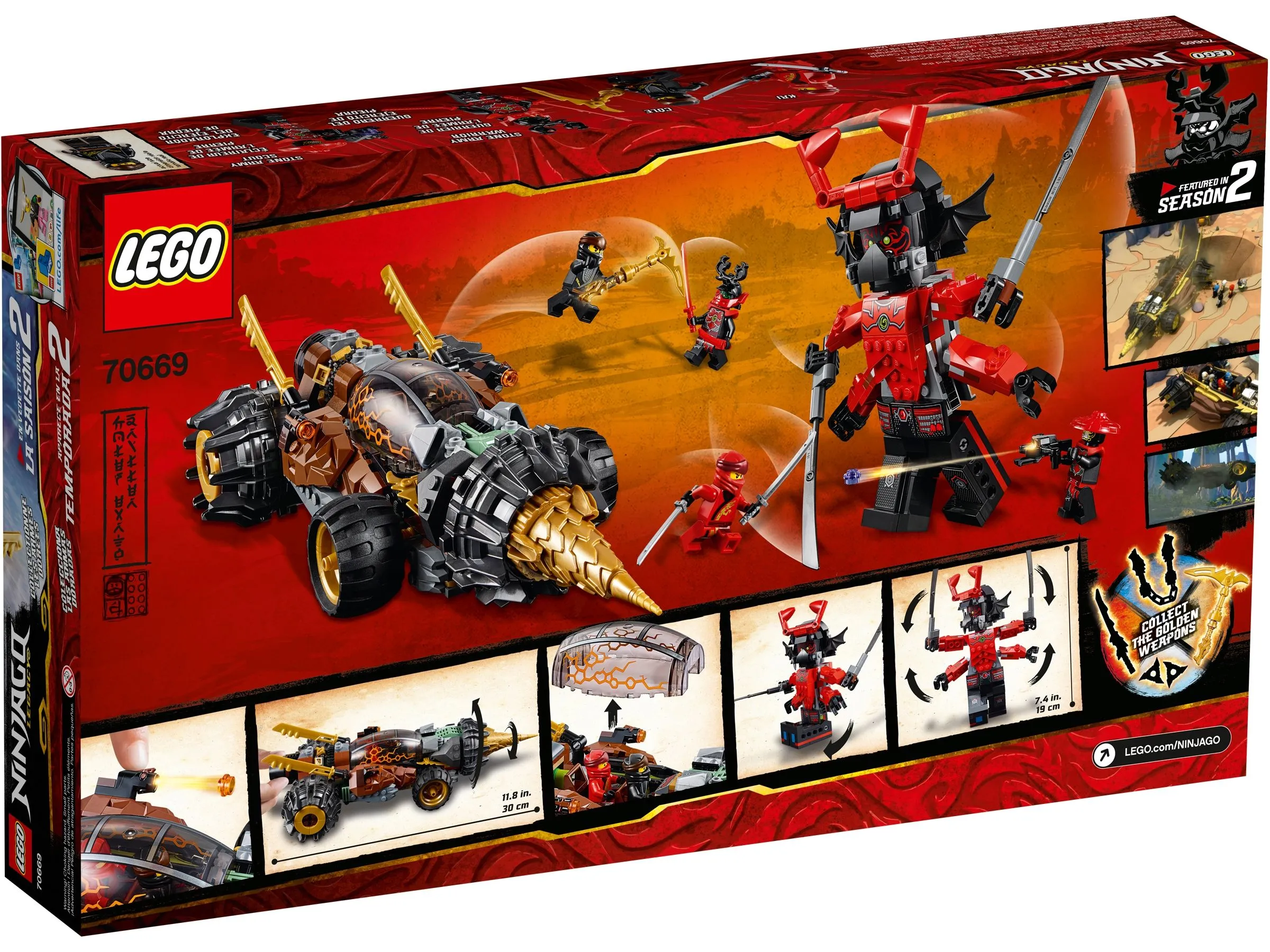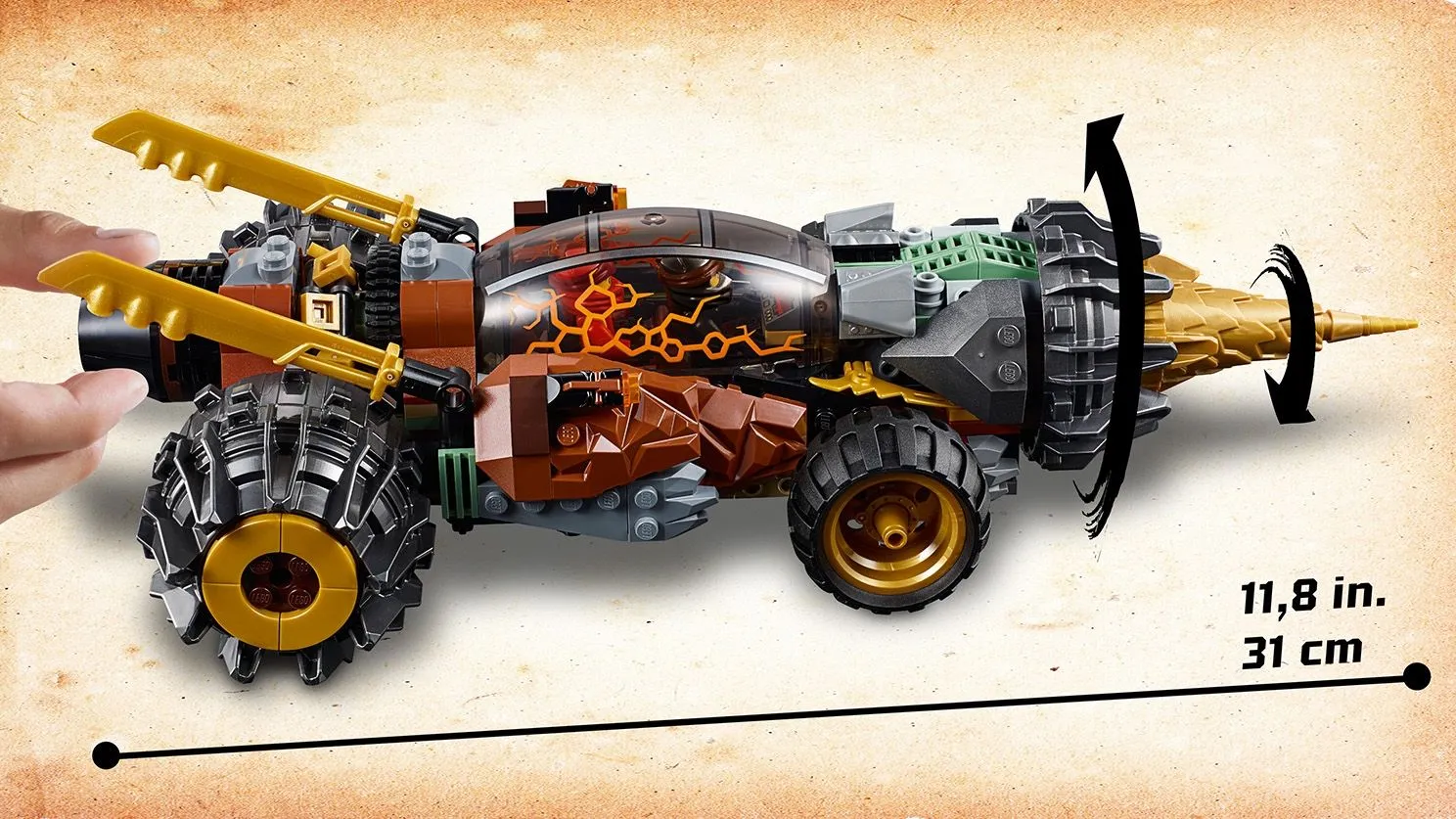 Обновлённый земляной бур Коула превосходит своего предшественника, представляя собой точную копию из мультсериала. Среди особенностей - проработанное купольное стекло без стикеров, просторная кабина для двух минифигурок, стад-шутеры, скрытые клинки и мощный золотой бур на передней части.