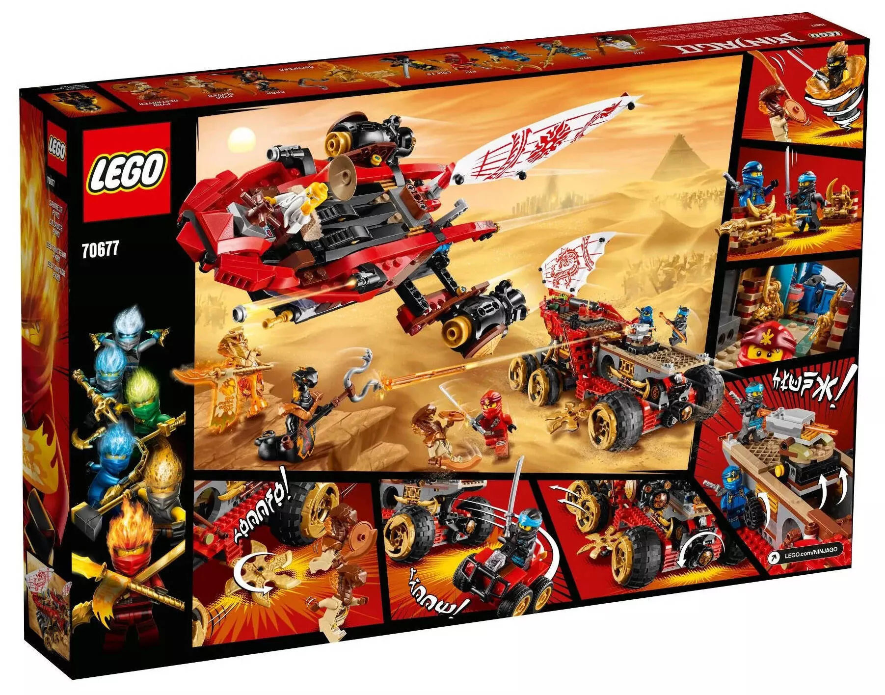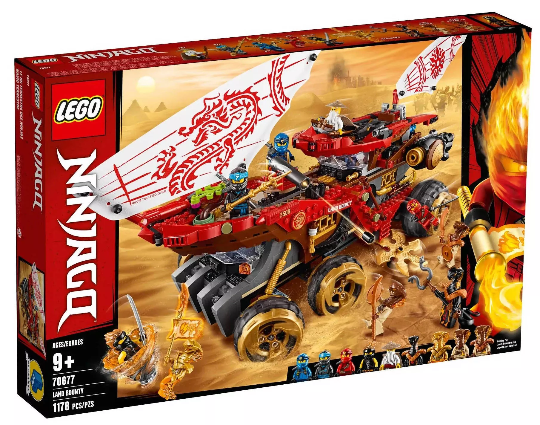 Модель с габаритами 50x22x18 см представляет собой обновленную версию подвижной базы ниндзя, напоминающую корабль Дар Судьбы, но на колесах. Она выделяется разнообразной цветовой палитрой, включая красный, золотой, коричневый, белый, серый и черный цвета. Конструкция включает две палубы, гараж и отсоединяемый летательный аппарат на верхней части. Уникальная особенность - шесть колес с пильными дисками, которые вращаются при движении, придавая модели особенный вид.